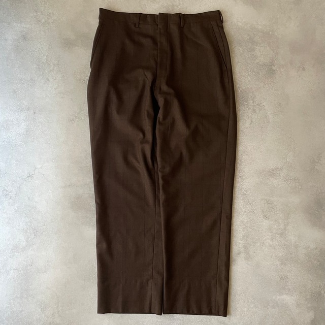 ご覧いただきありがとうございます 90年代以前のウールスラックス 濃いブラウンカラーにブラックカラーの格子状のデザイン ざっくりとしたチェック柄のスラックスは探すと意外とない印象です タックなしですが、ストンと落ちる良いシルエットでサイズバランスも優れています 暗いトーンにあったウール地で秋冬に履きたい大人スラックス サイズ合えば是非! ◾︎サイズ 表記サイズ: 実寸:ウエスト86cm 股上31cm 股下73.5cm 裾幅21cm ワタリ幅30.5cm 総丈104cm ※多少の誤差はご了承ください ◾︎コンデション B: 使用感があり、多少の汚れやダメージがある状態 ※当店の主観により判断しておりますので、あくまで目安としてご活用ください 多少のダメージや薄い汚れ、色褪せ等、古着の使用感の範囲内と判断したものについては、画像の掲載や状態追記を省略させていただく場合がございます サイズやコンディション含め、気になる点や質問等ございましたら、ご購入前に必ずご連絡ください ご注文確定後、お客様都合の返品は一切受け付けておりません popupや出店イベント、他サイトにて販売中のため、ご注文時に売り切れの場合がございます あくまで古着ということをご理解の上、ご購入お願いいたします