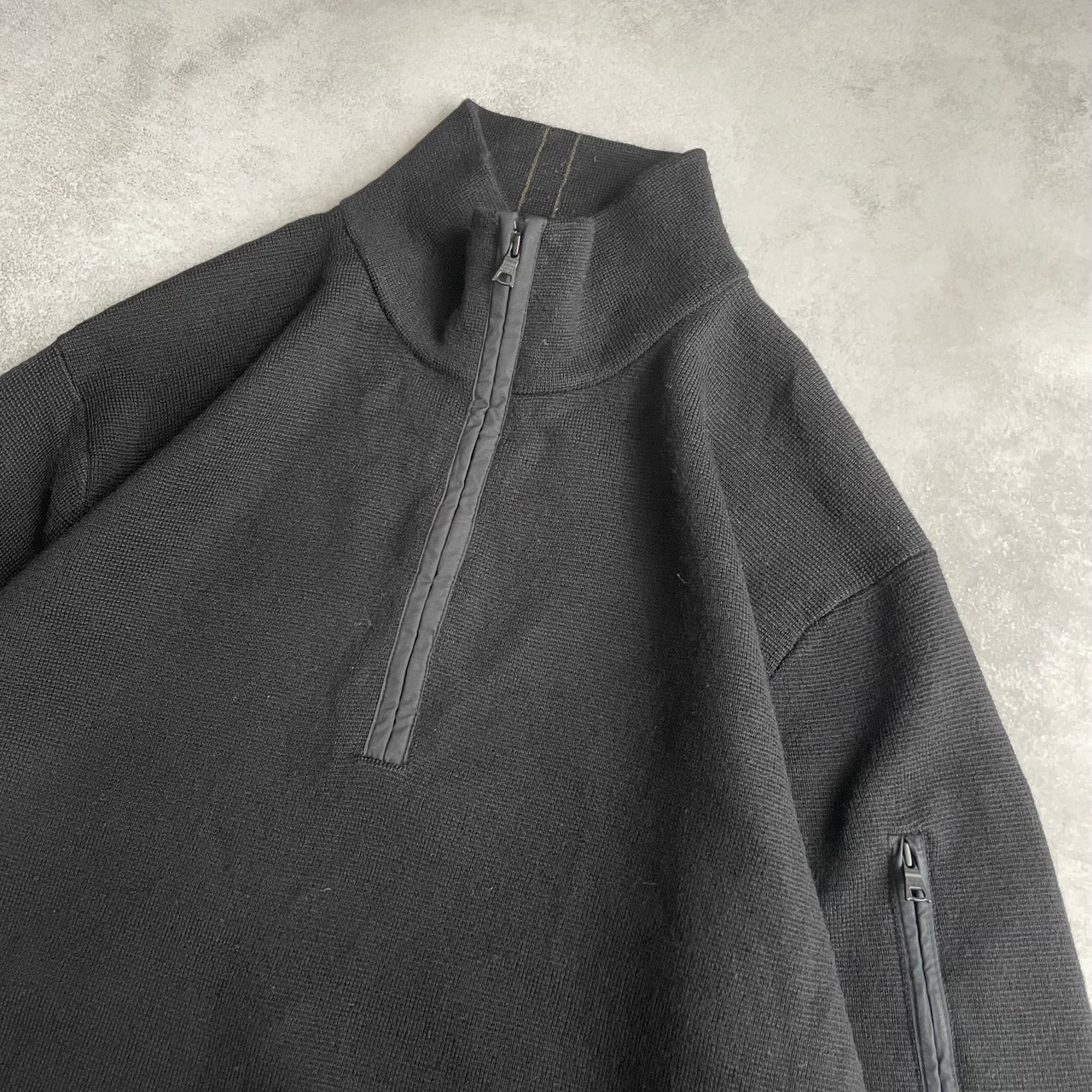 モードな雰囲気漂うブラックカラーのハーフジップセーター