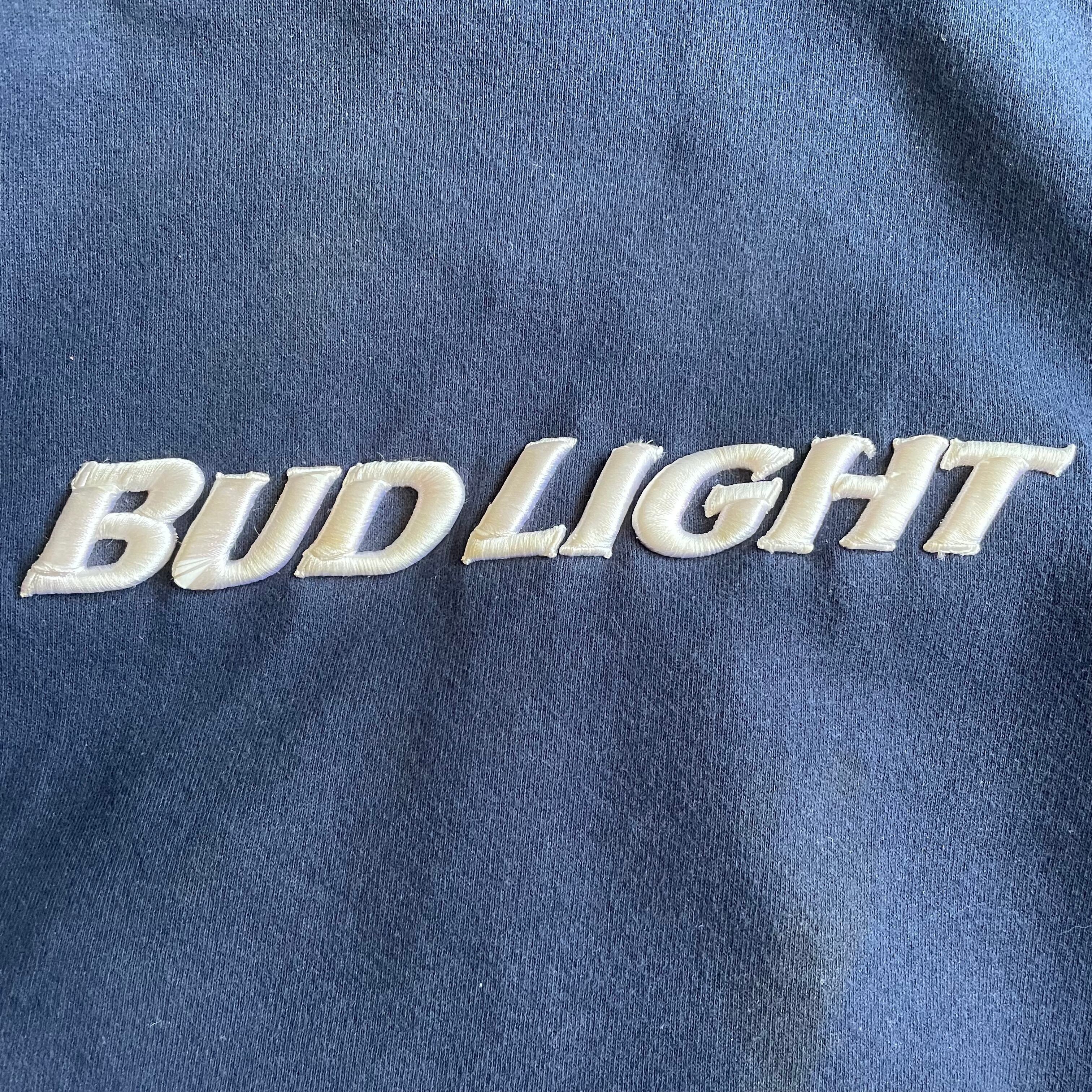 ネイビーボディにアメリカのビール"バドライト"の刺繍が施されたスウェット