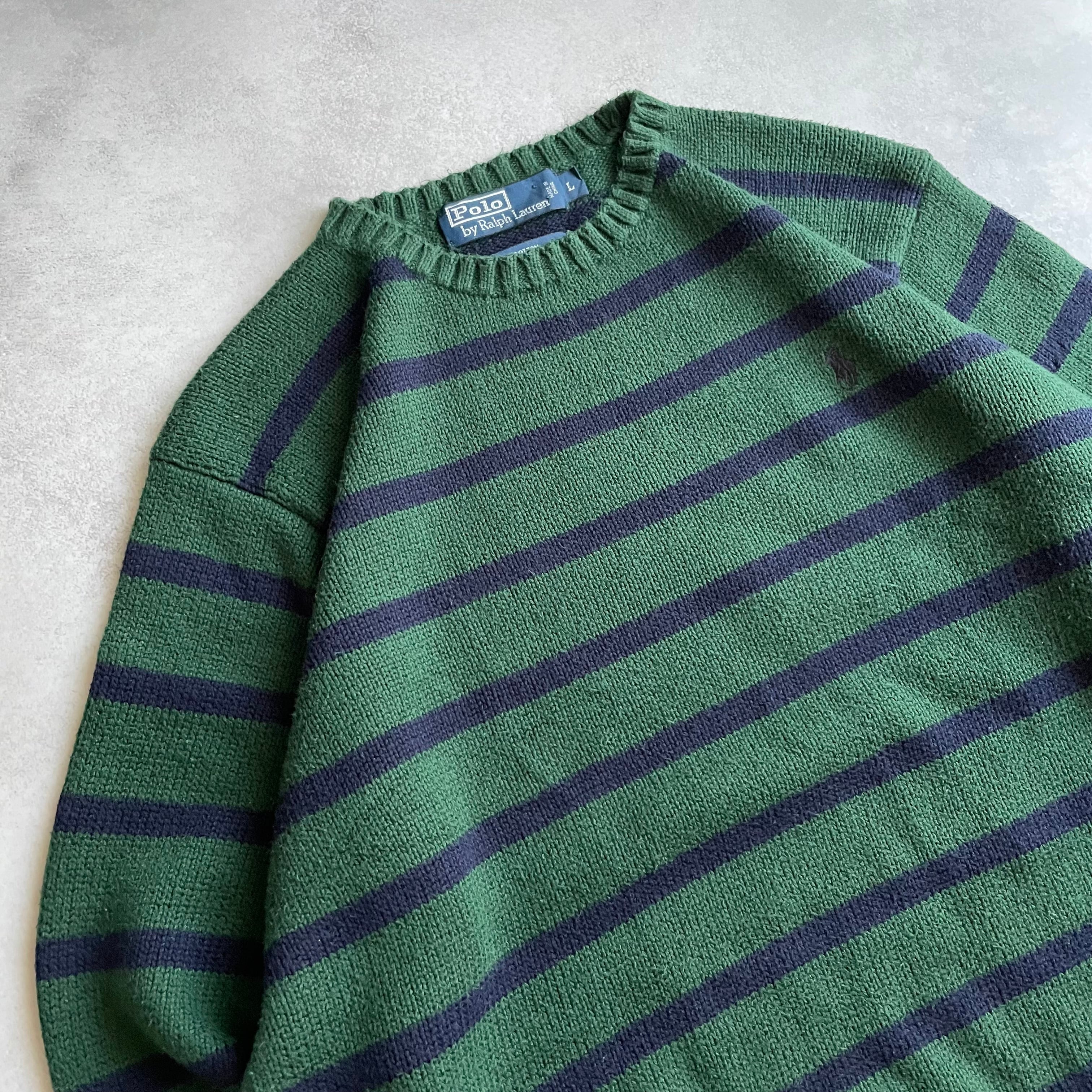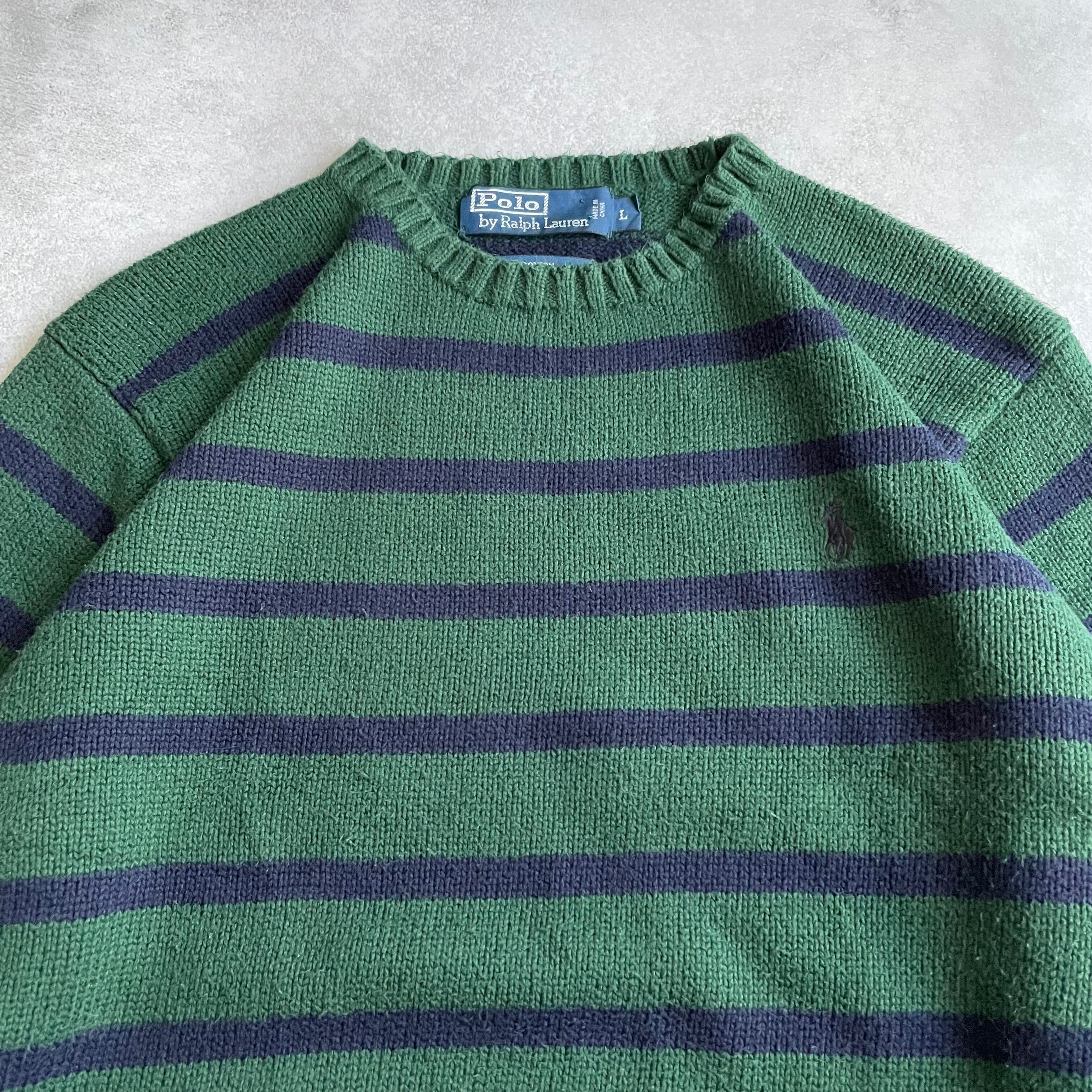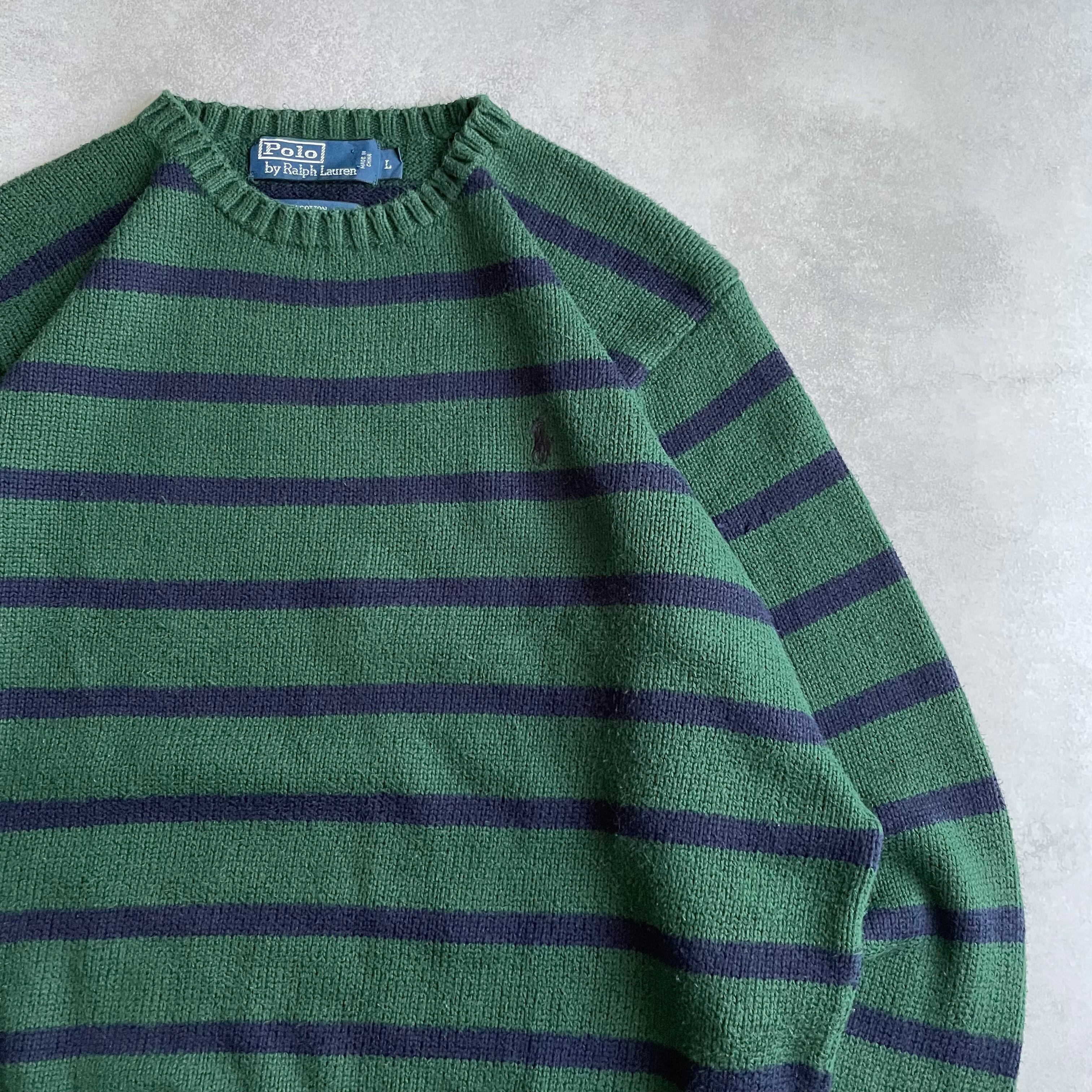 グリーン×ネイビーの好配色の細ピッチボーダー