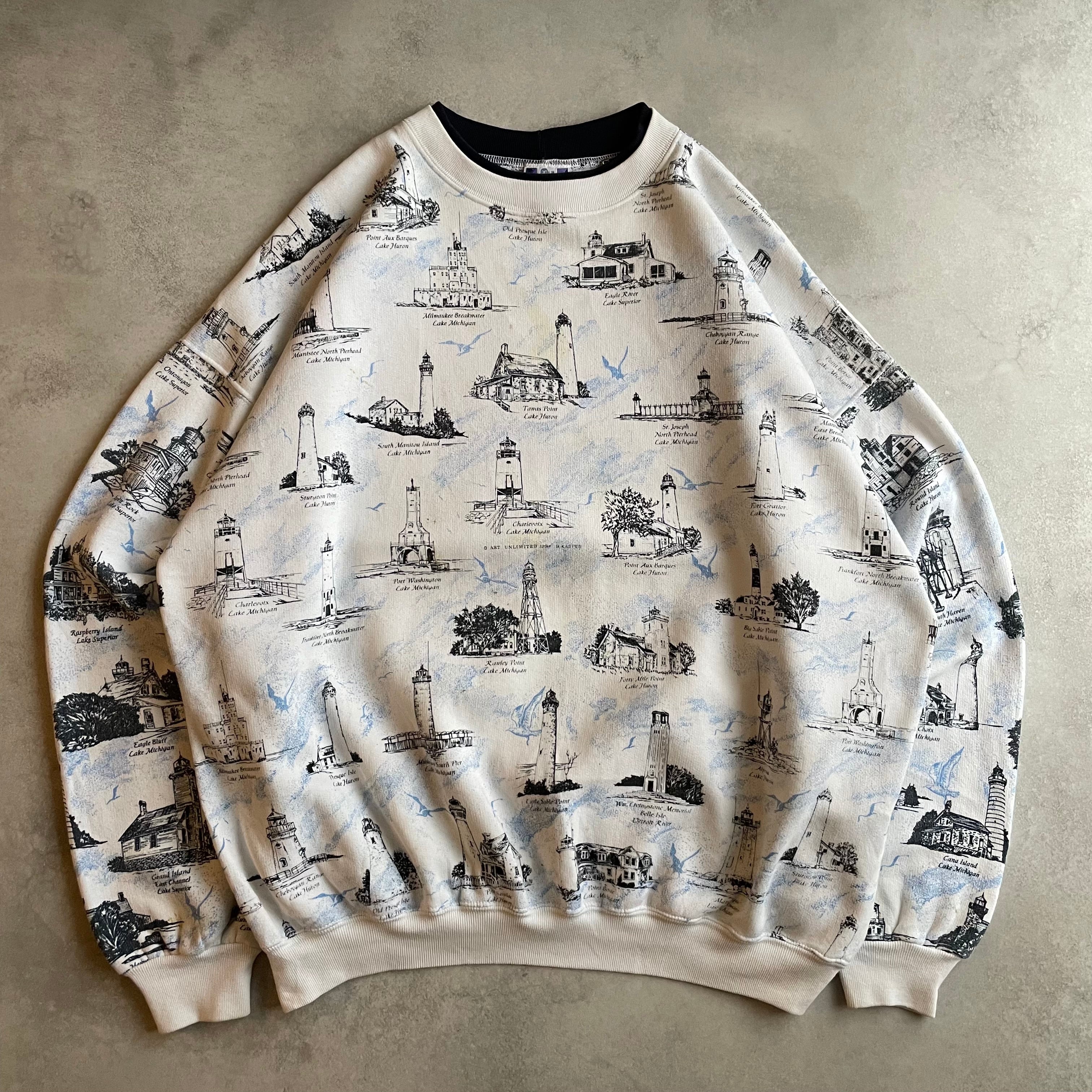 アメリカに実在した灯台が散りばめられたアートプリントが特徴的なスウェット