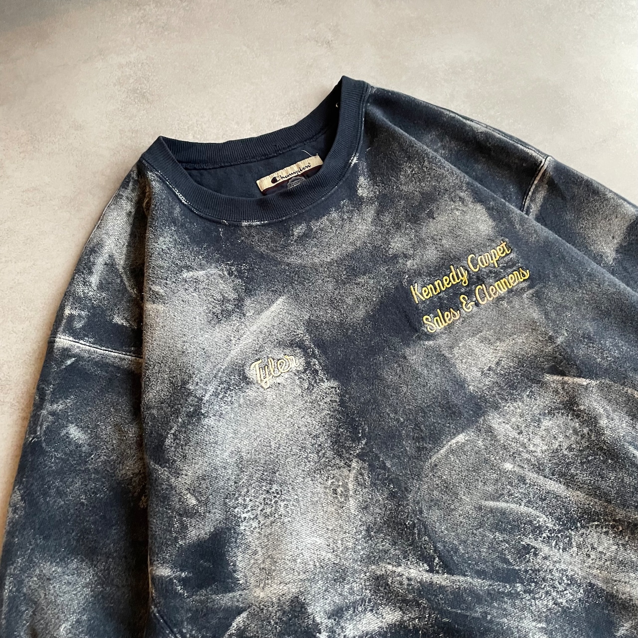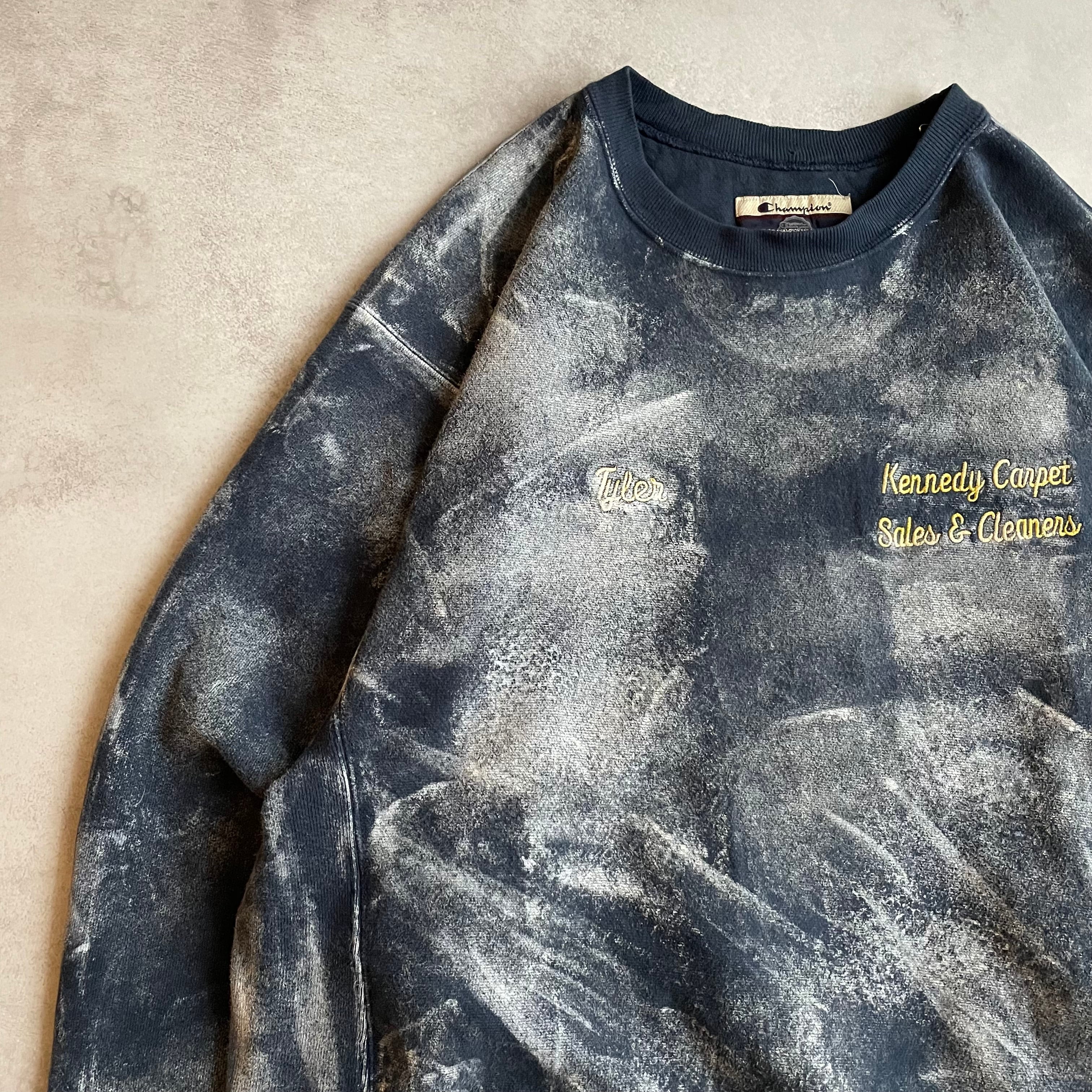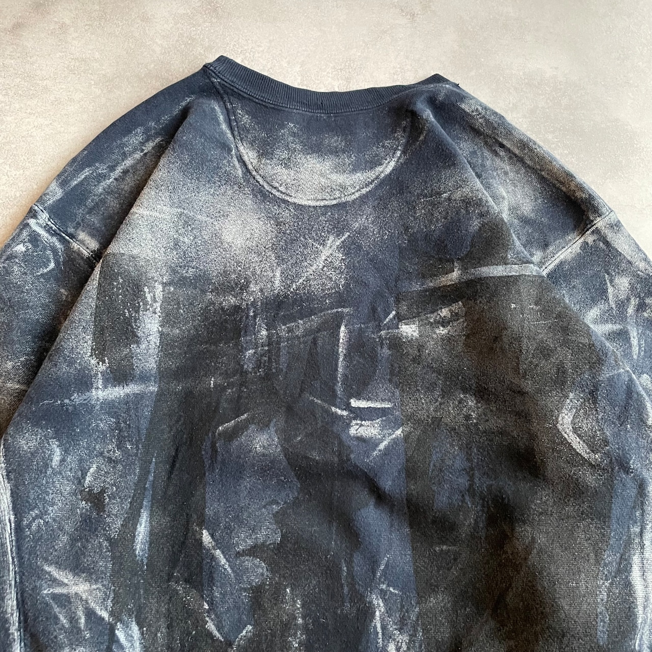 こちらのアイテムは、企業系の刺繍が施されたスウェットに大胆にペンキでカスタムした贅沢な1着