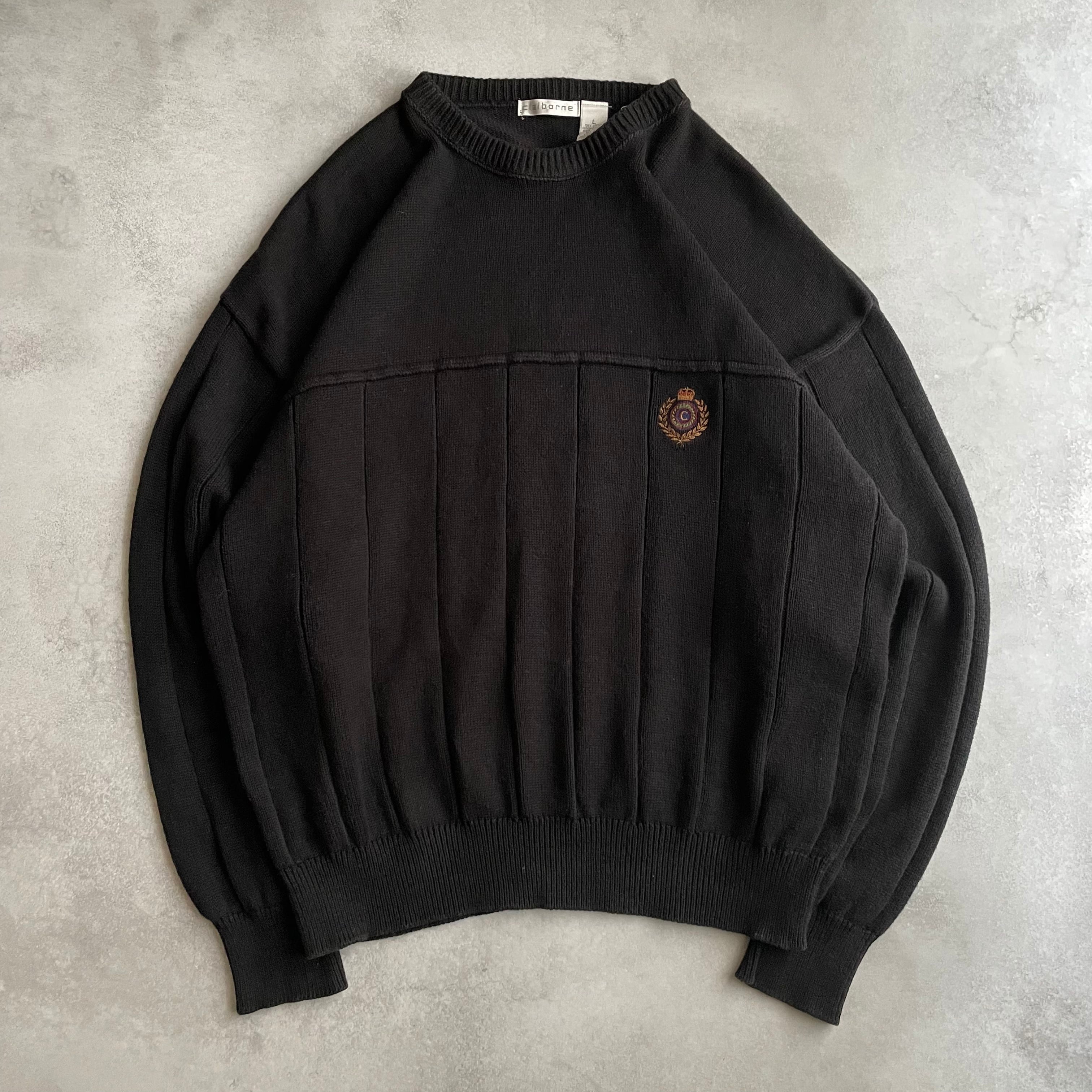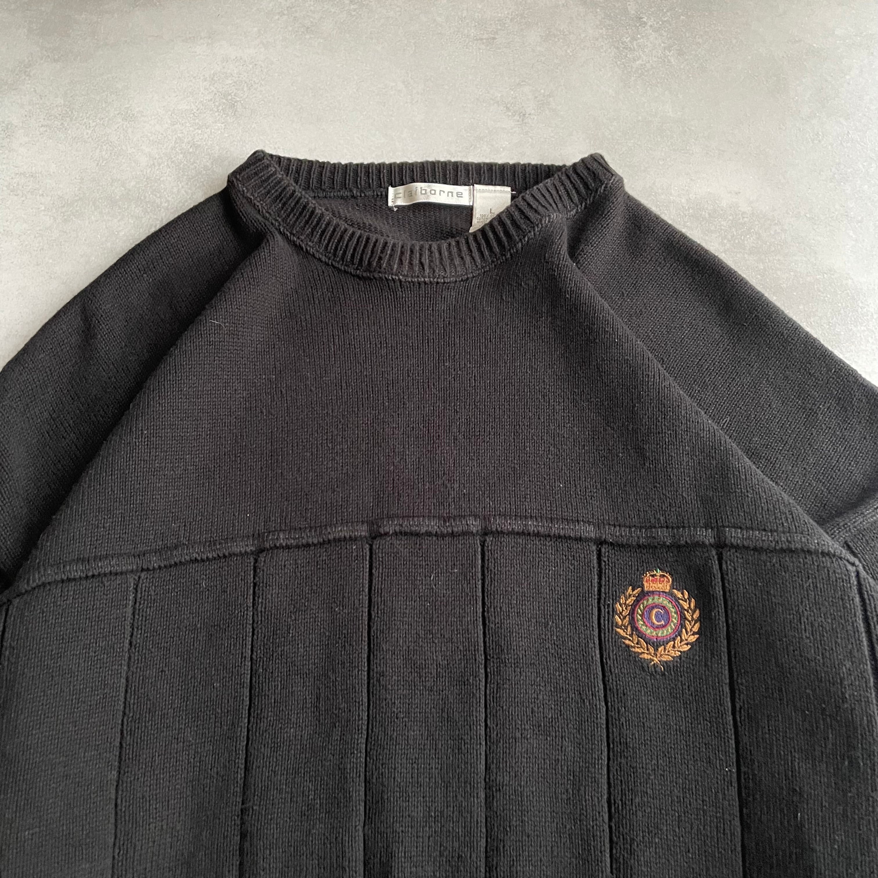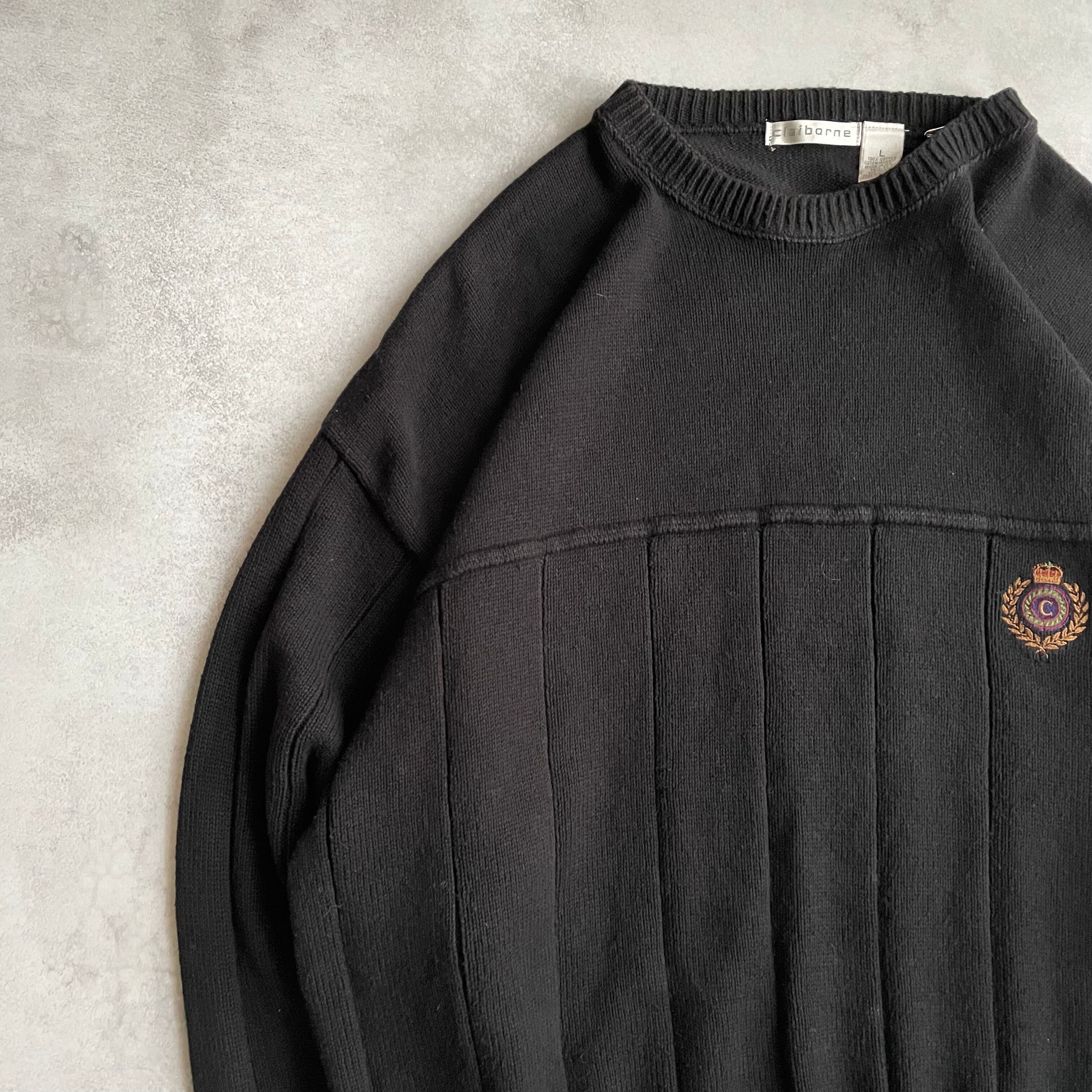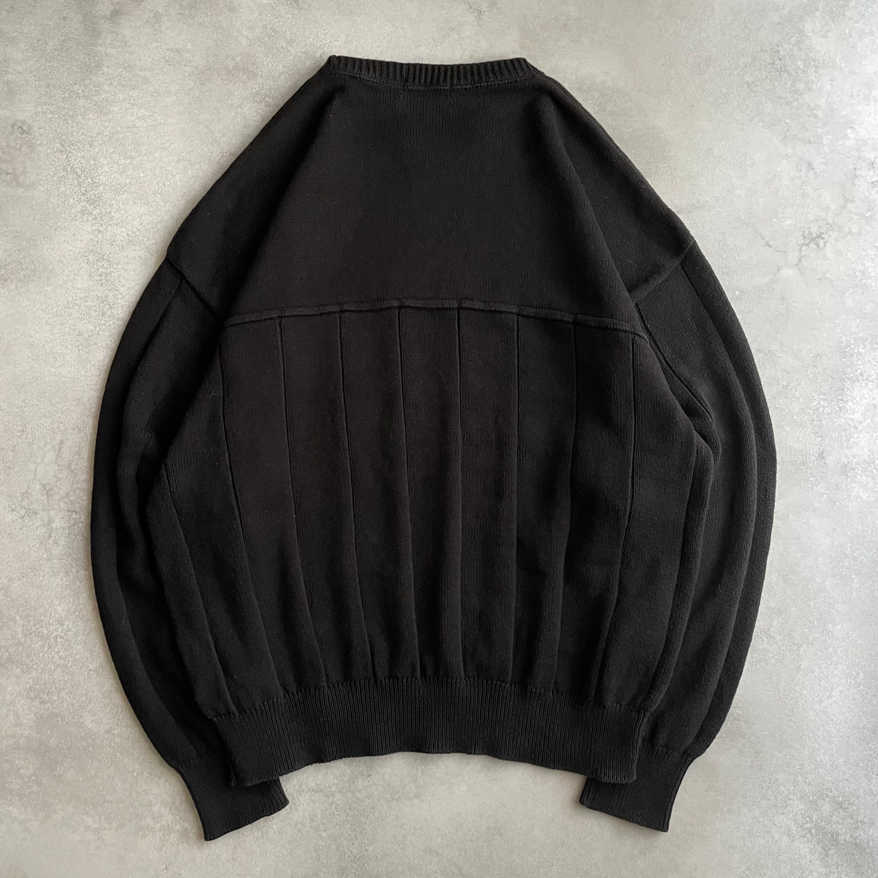ブラック単色でカップショルダージャケットのような切り替えデザインが施されたニット