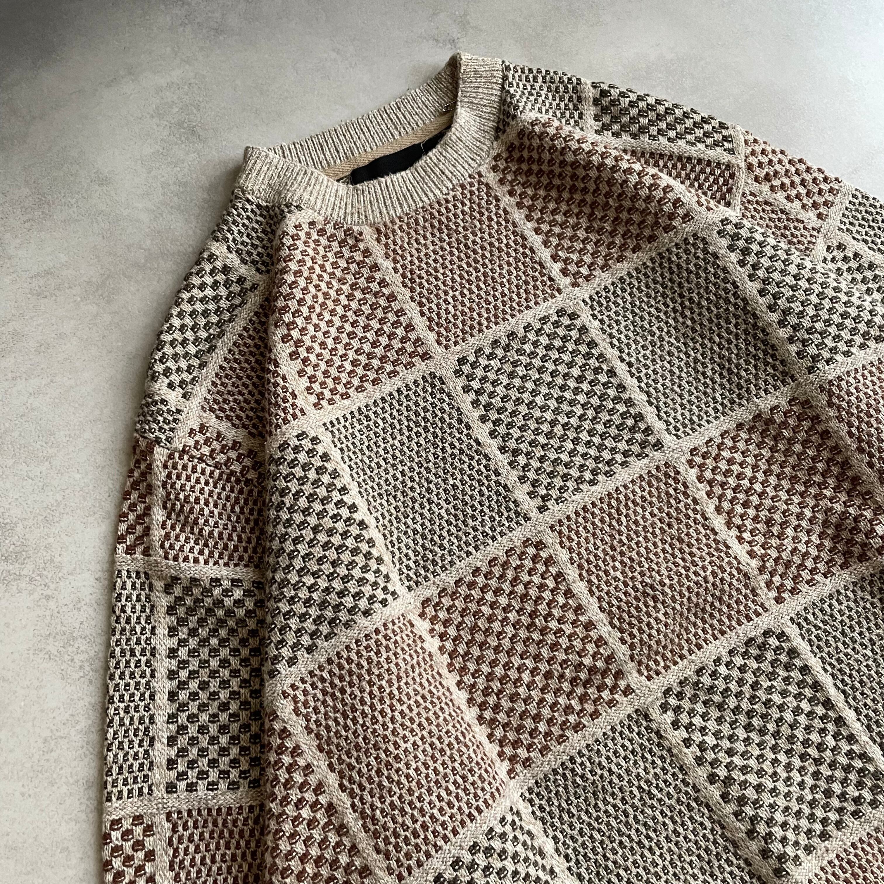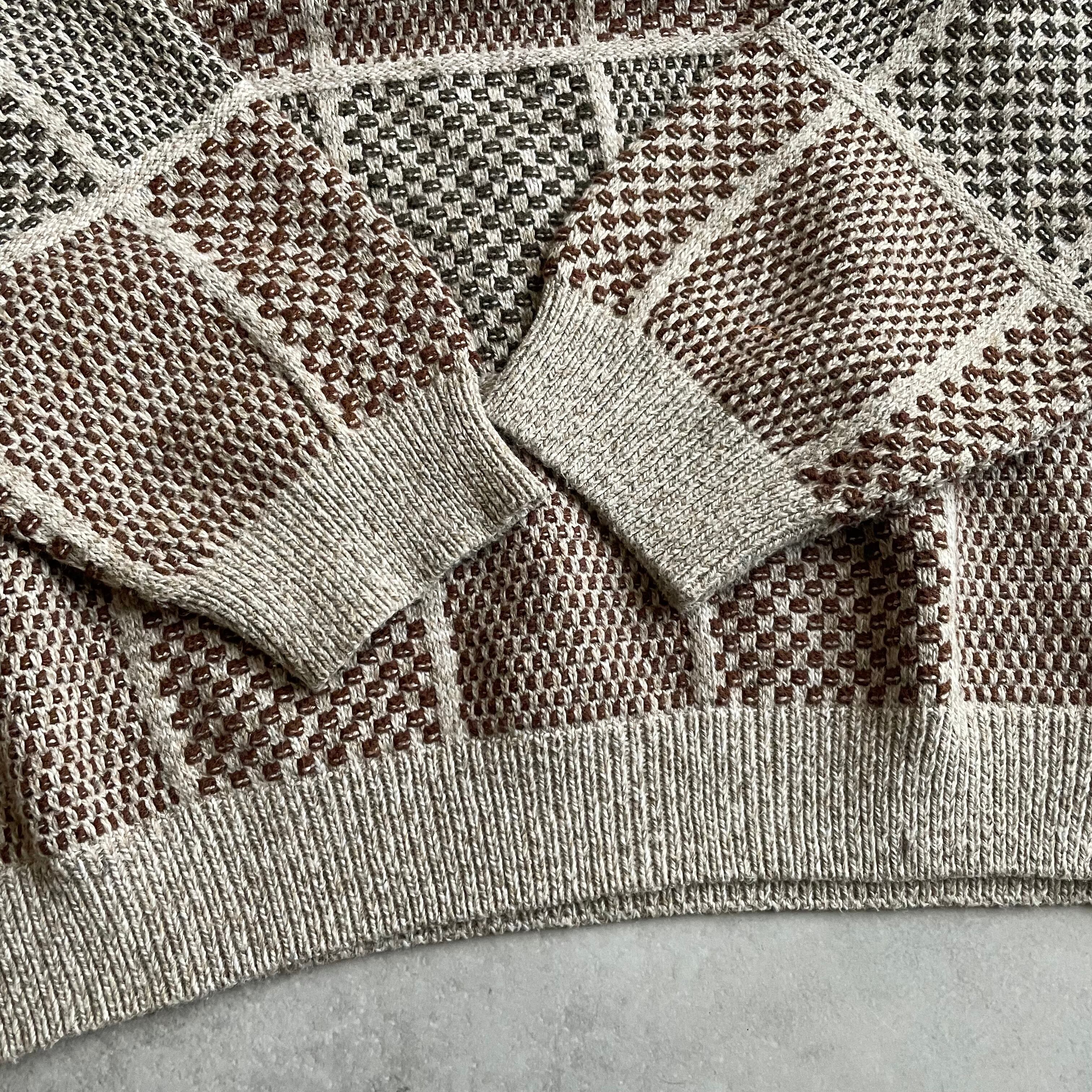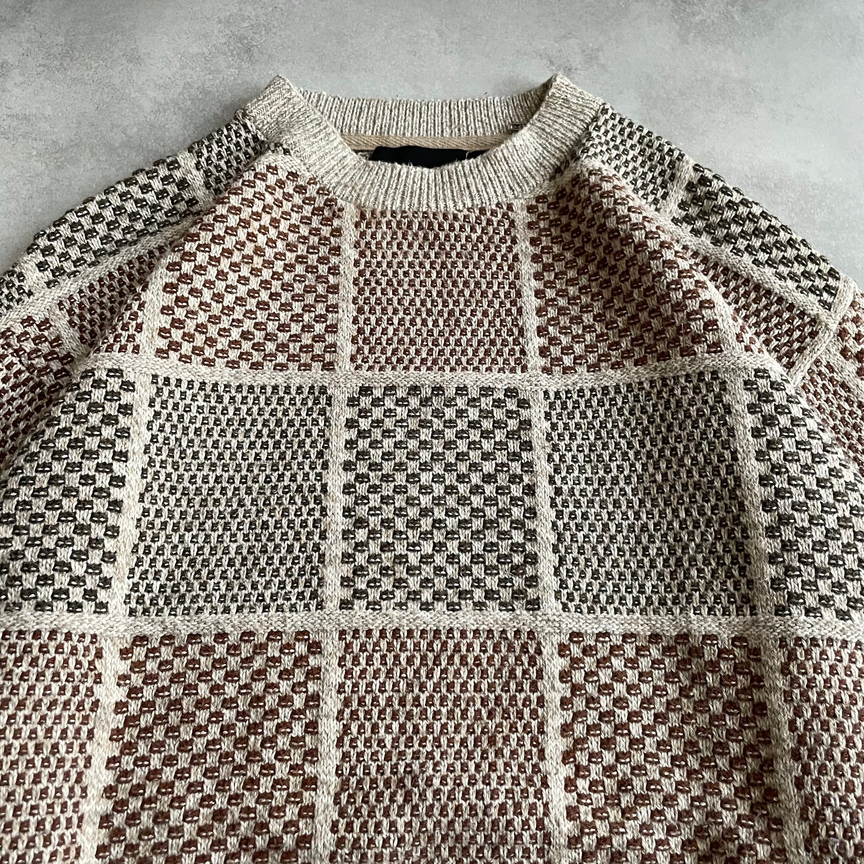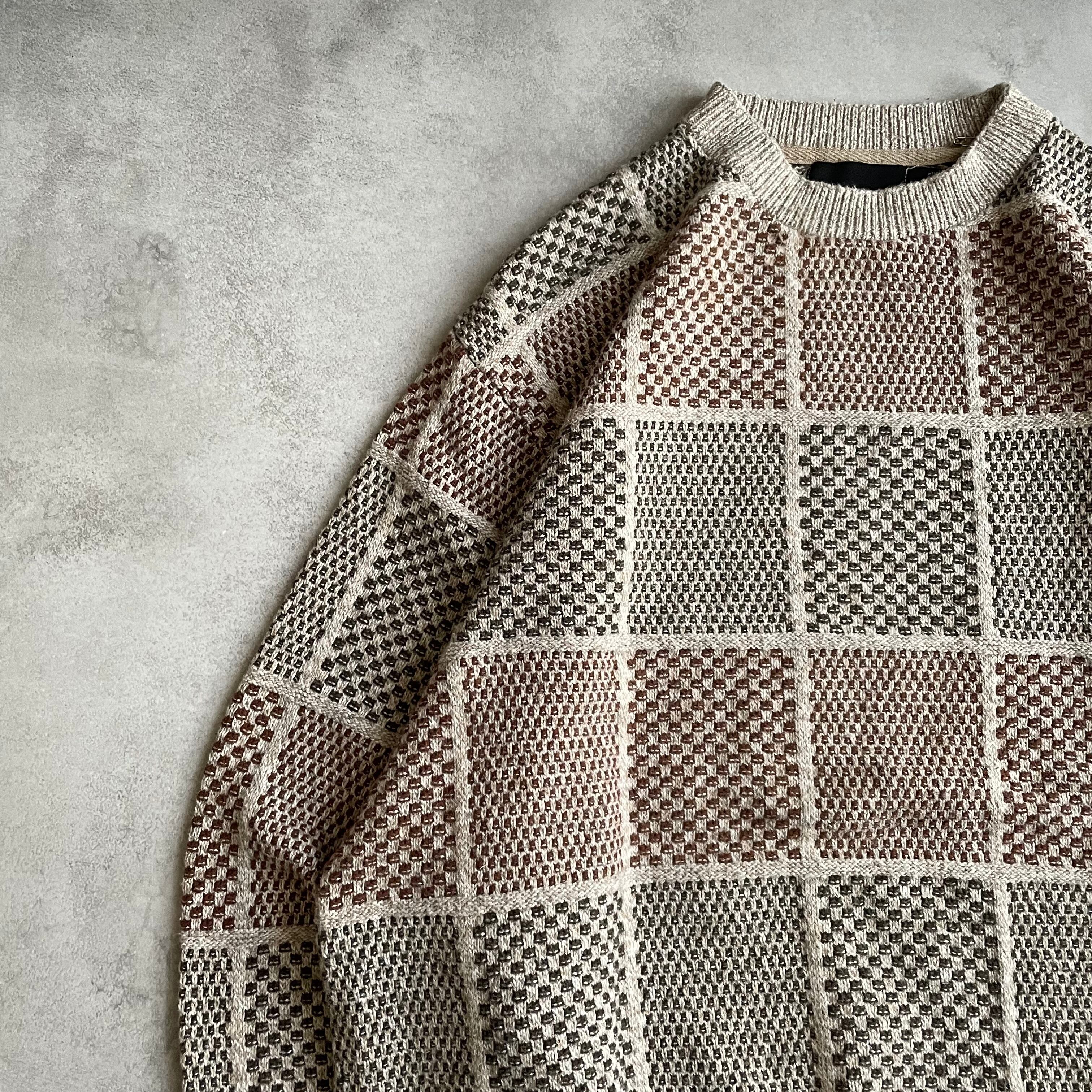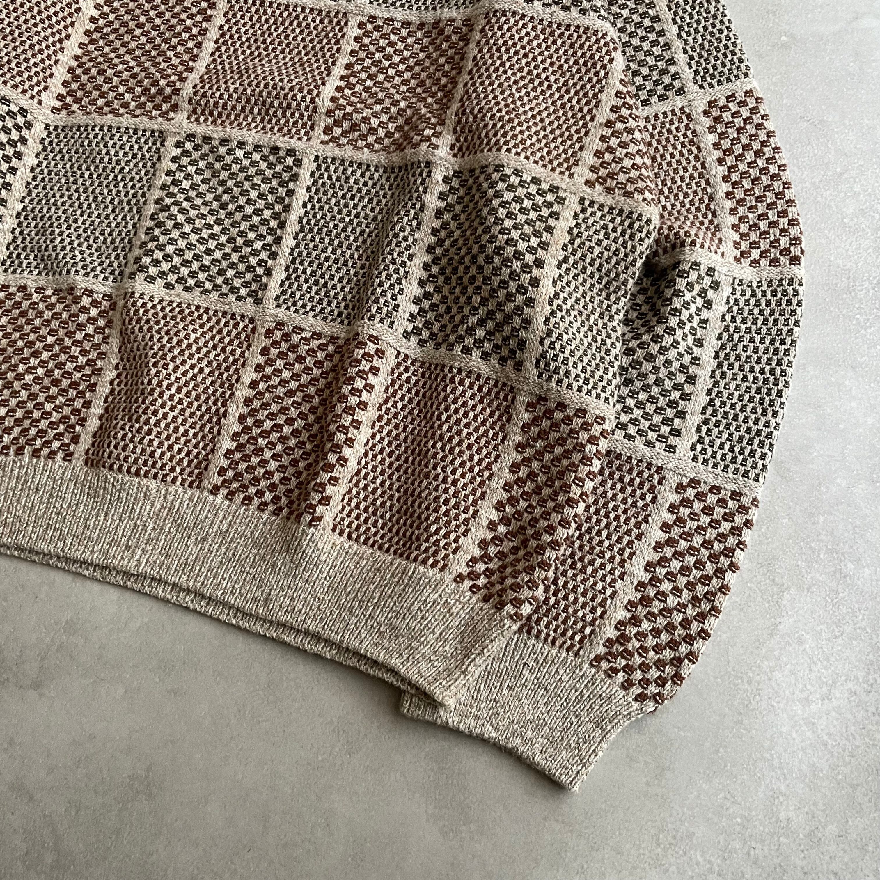 こちらのアイテムは、ざっくりとした格子状のデザインが施されたニット