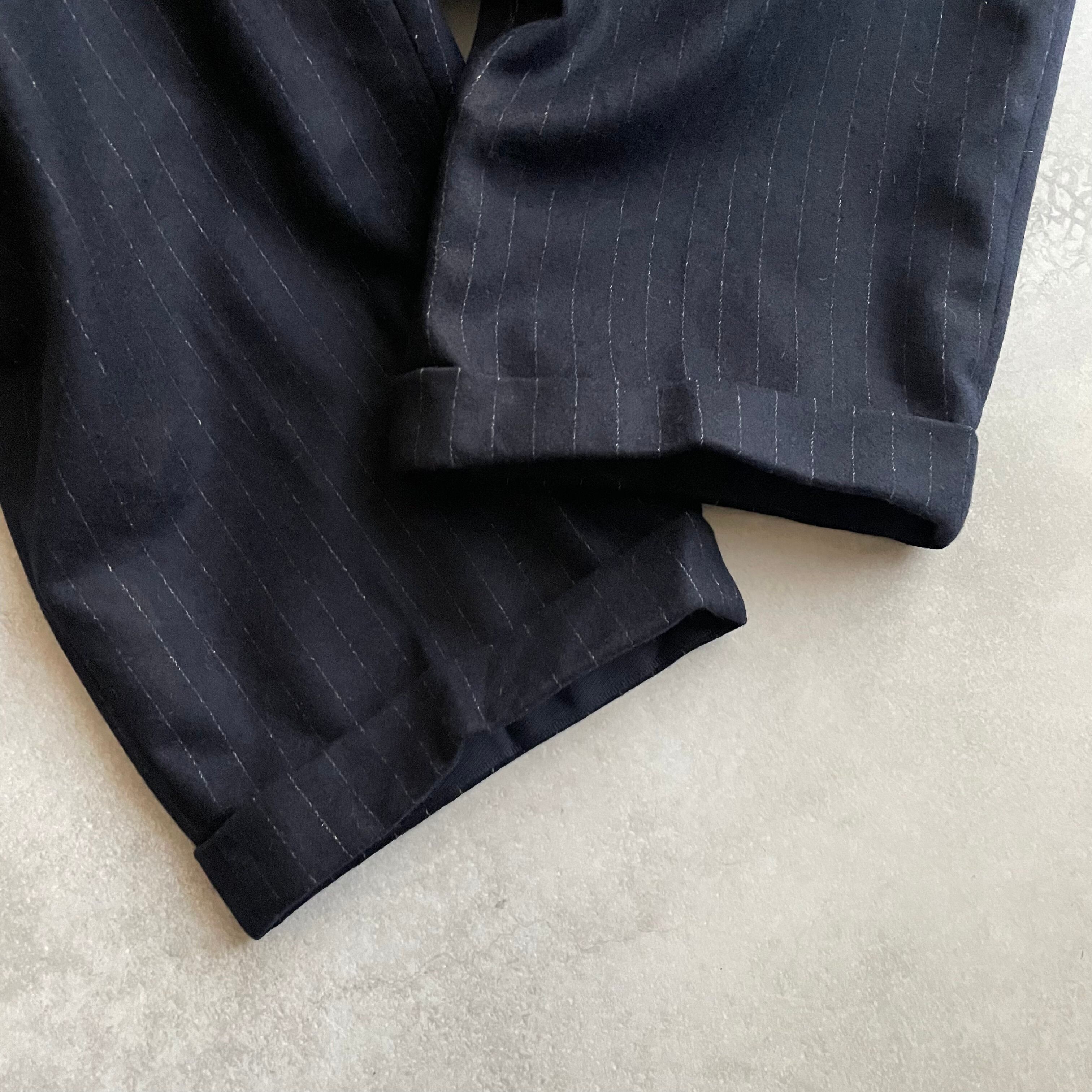 当店でも人気の高いピンストライプのスラックスで、汎用性の高いネイビーに白ライン