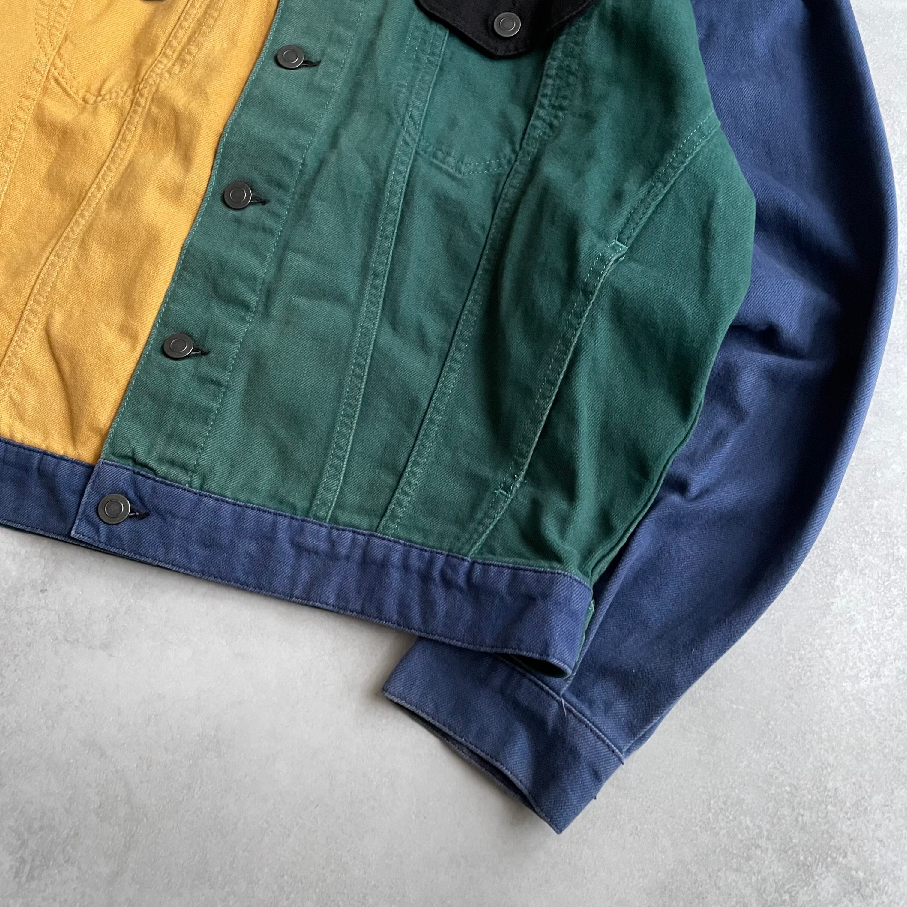 こちらのアイテムは、ブルー、グリーン、イエロー、ブラックの4色で構成されたデニムジャケット