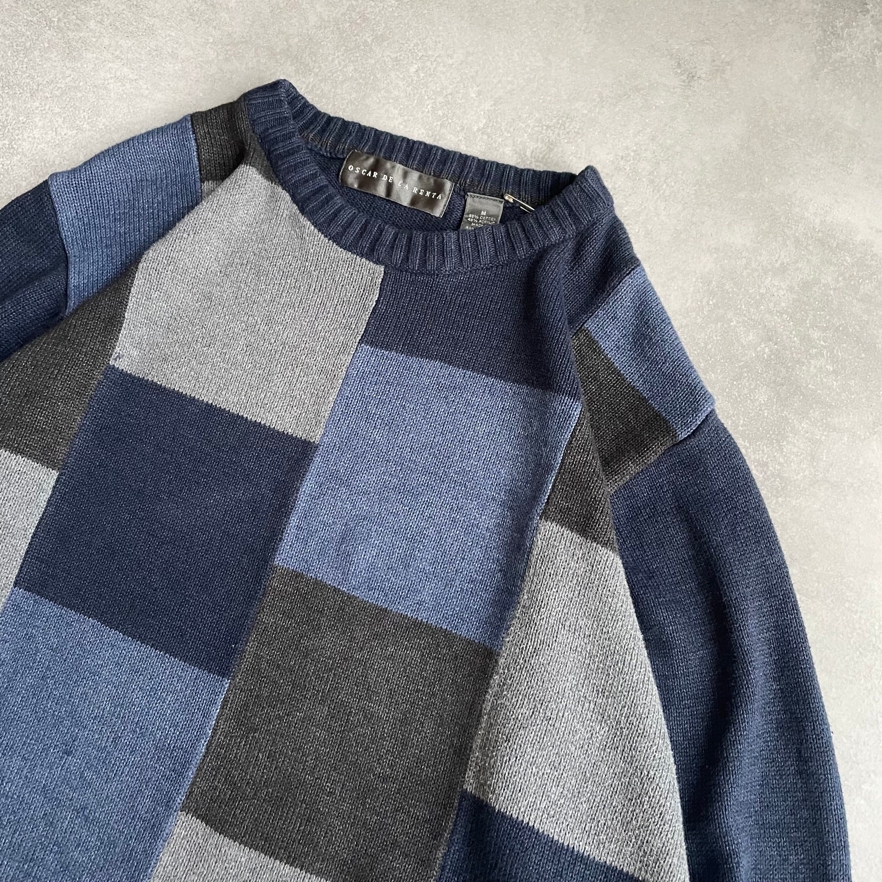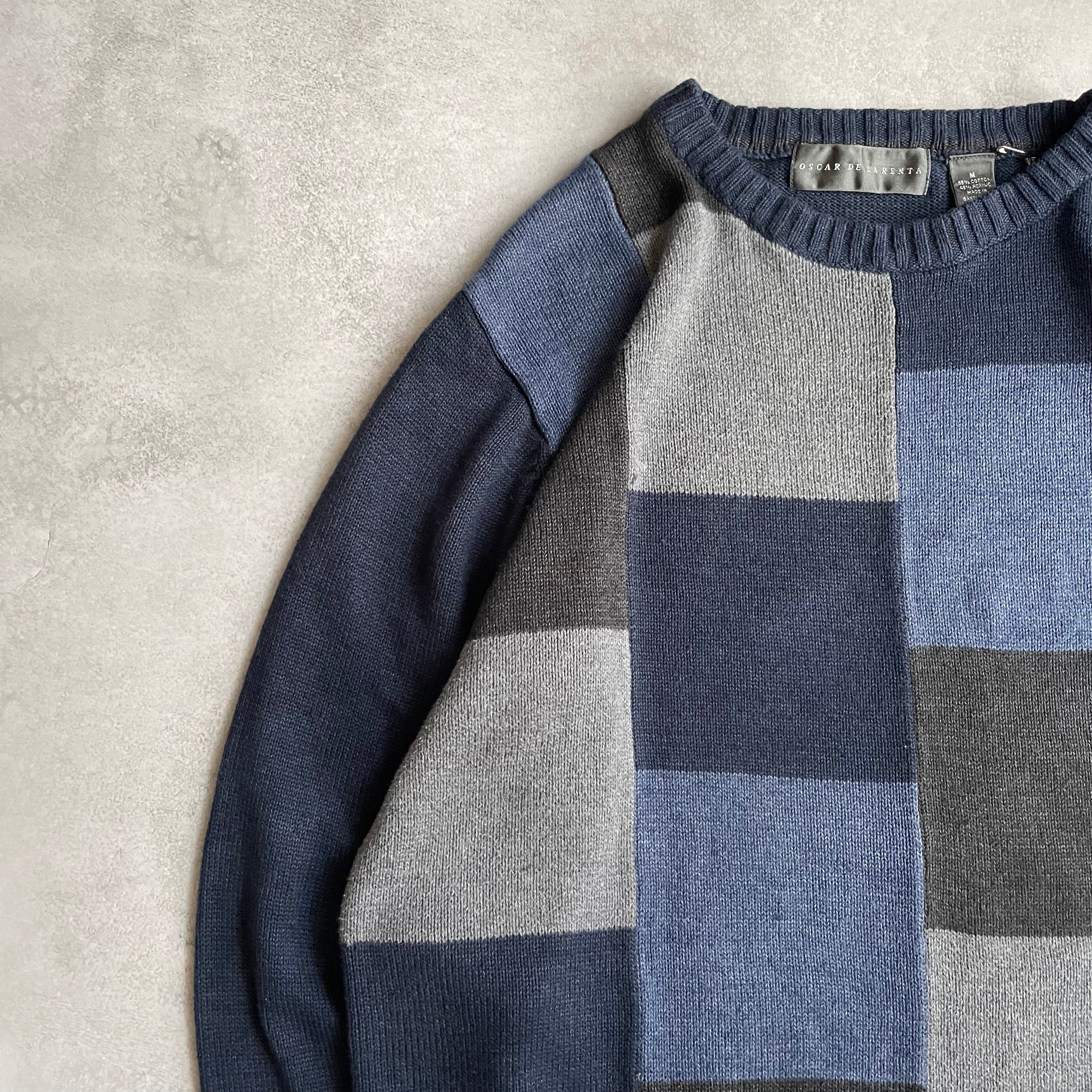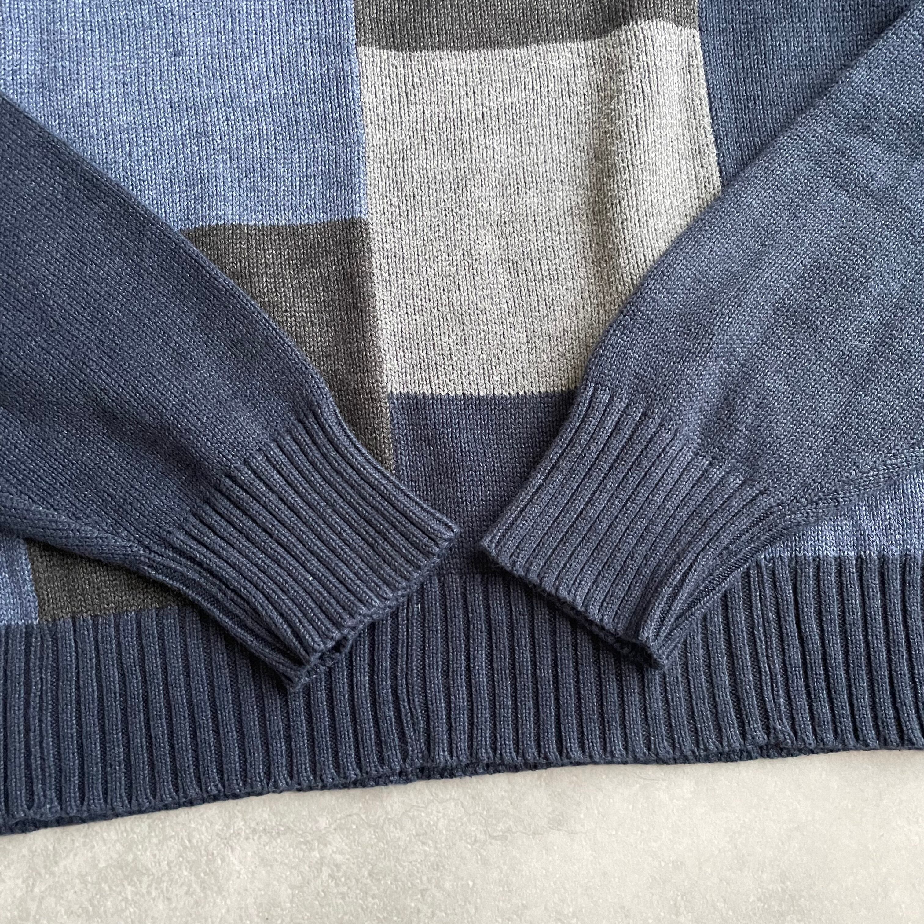 こちらのアイテムは、ブルー×グレーで構成された格子状のデザインニット