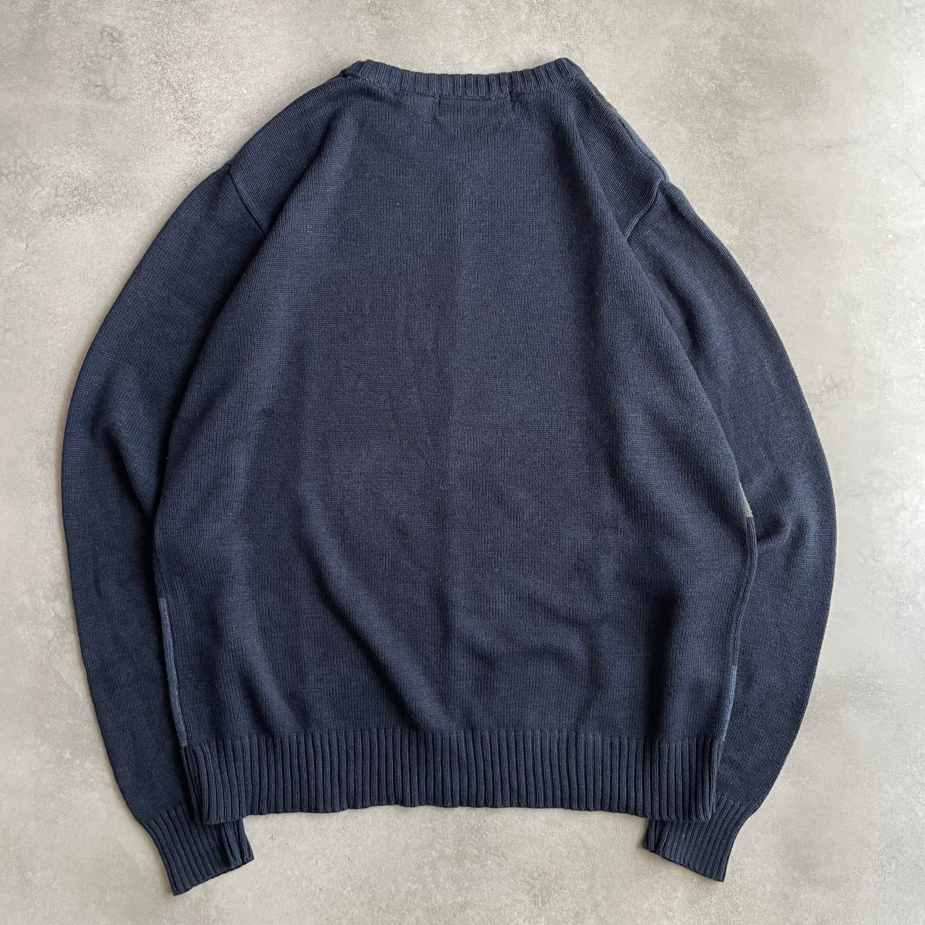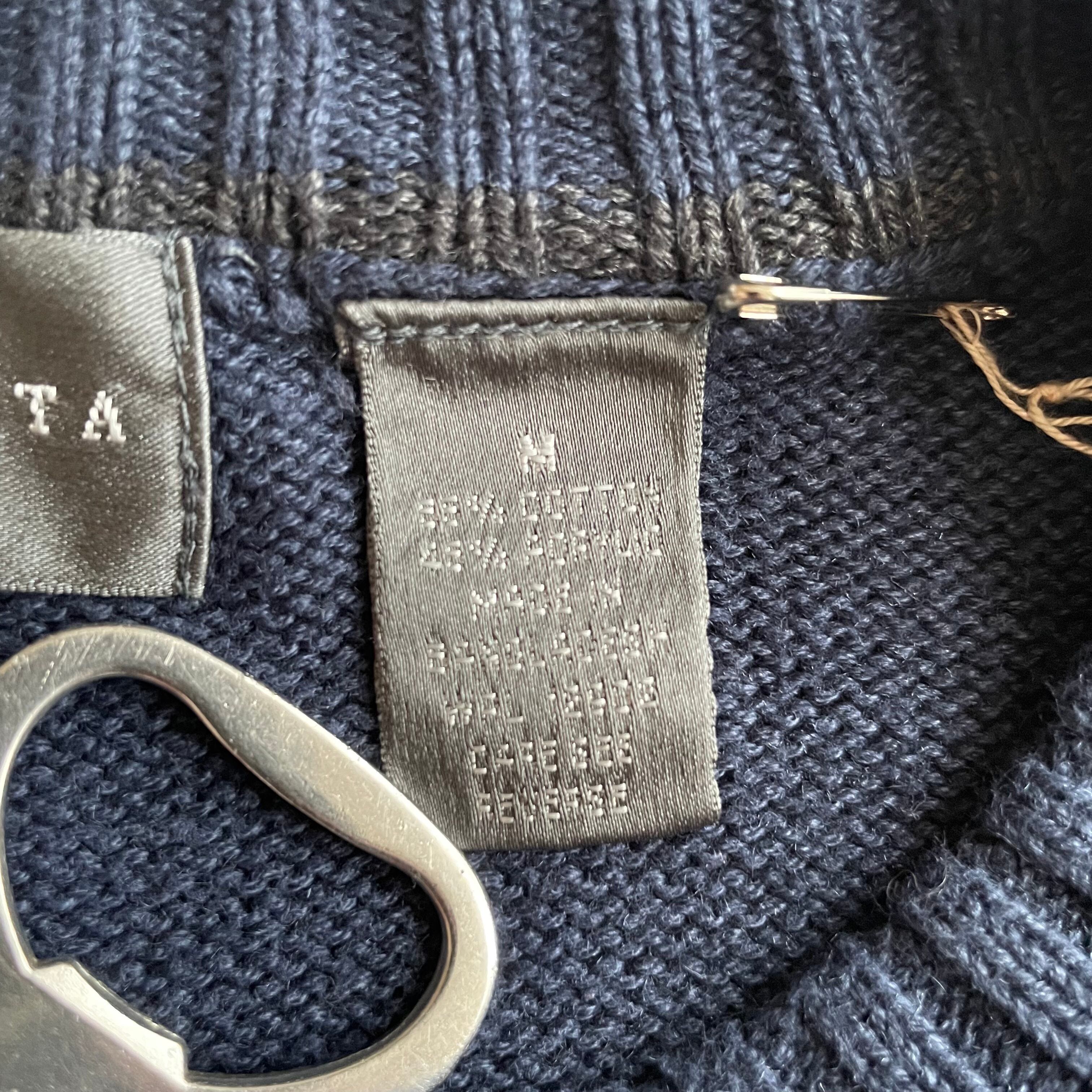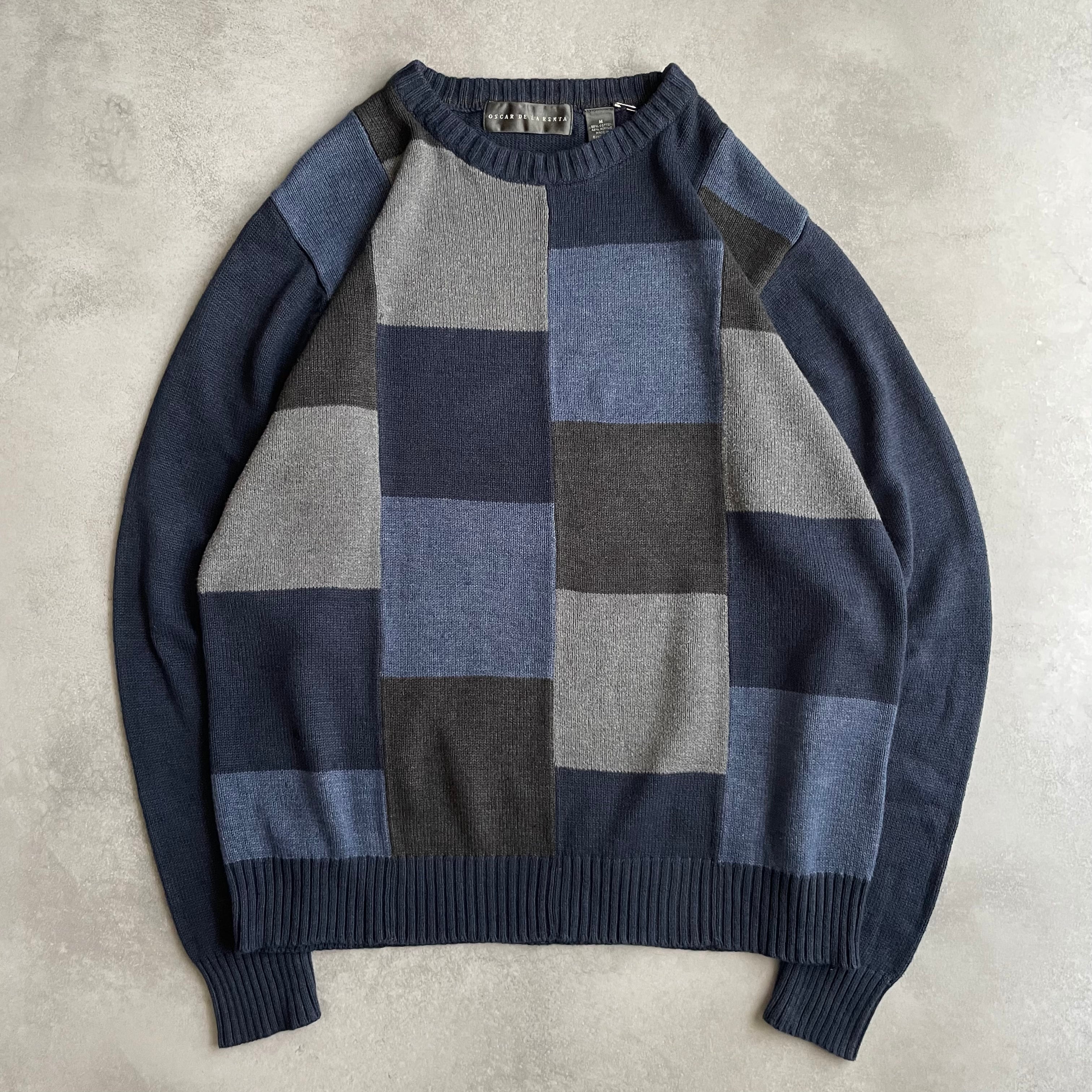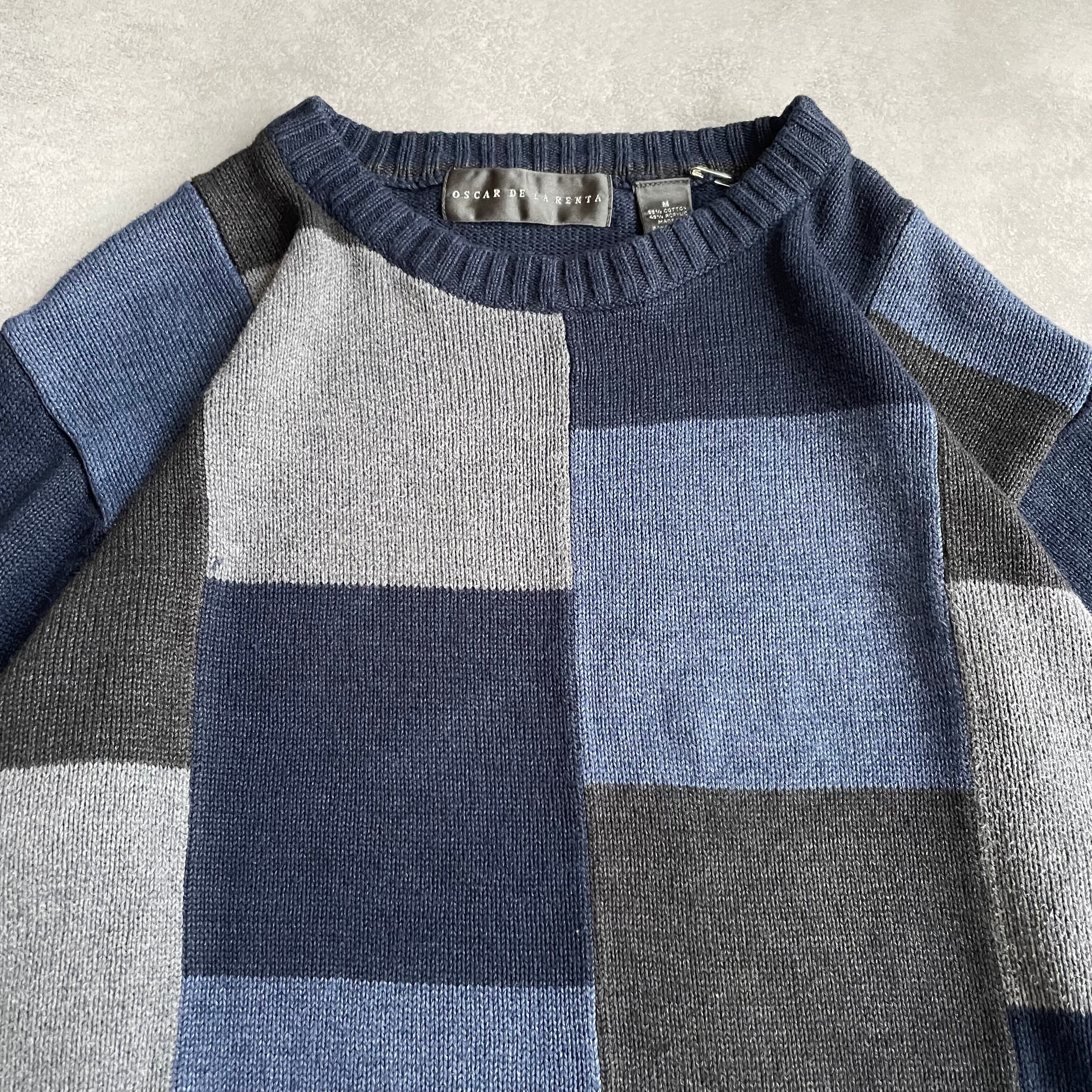 こちらのアイテムは、ブルー×グレーで構成された格子状のデザインニット