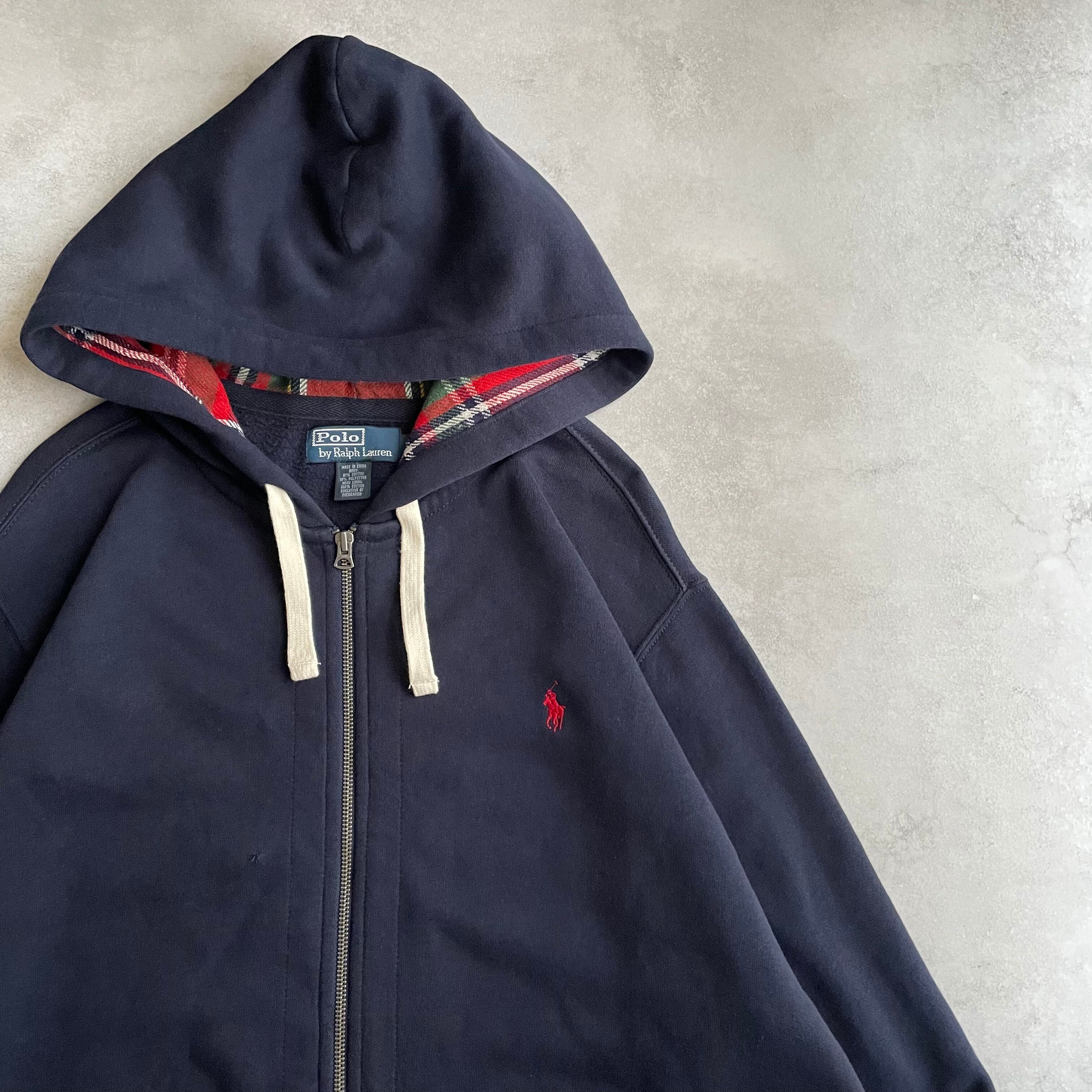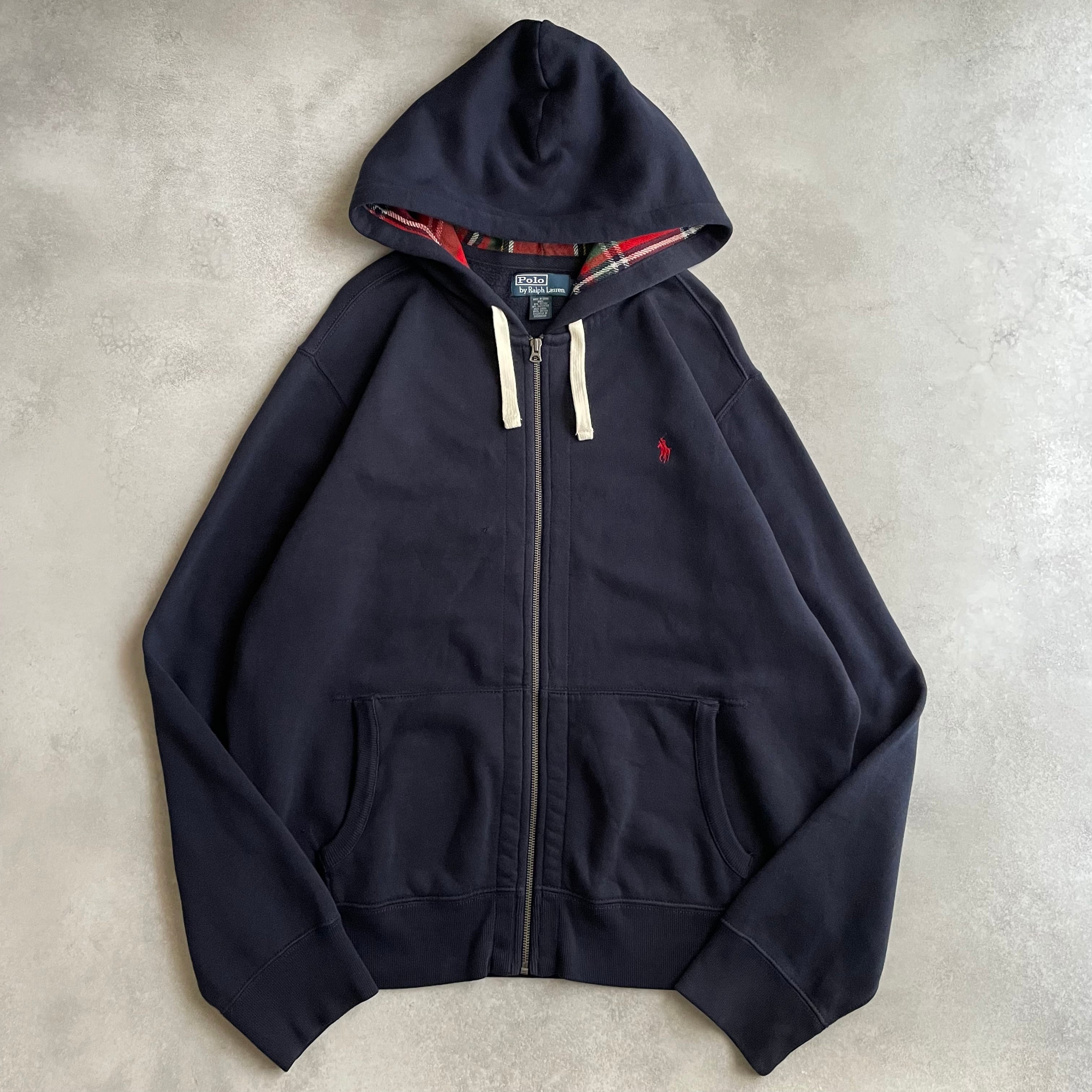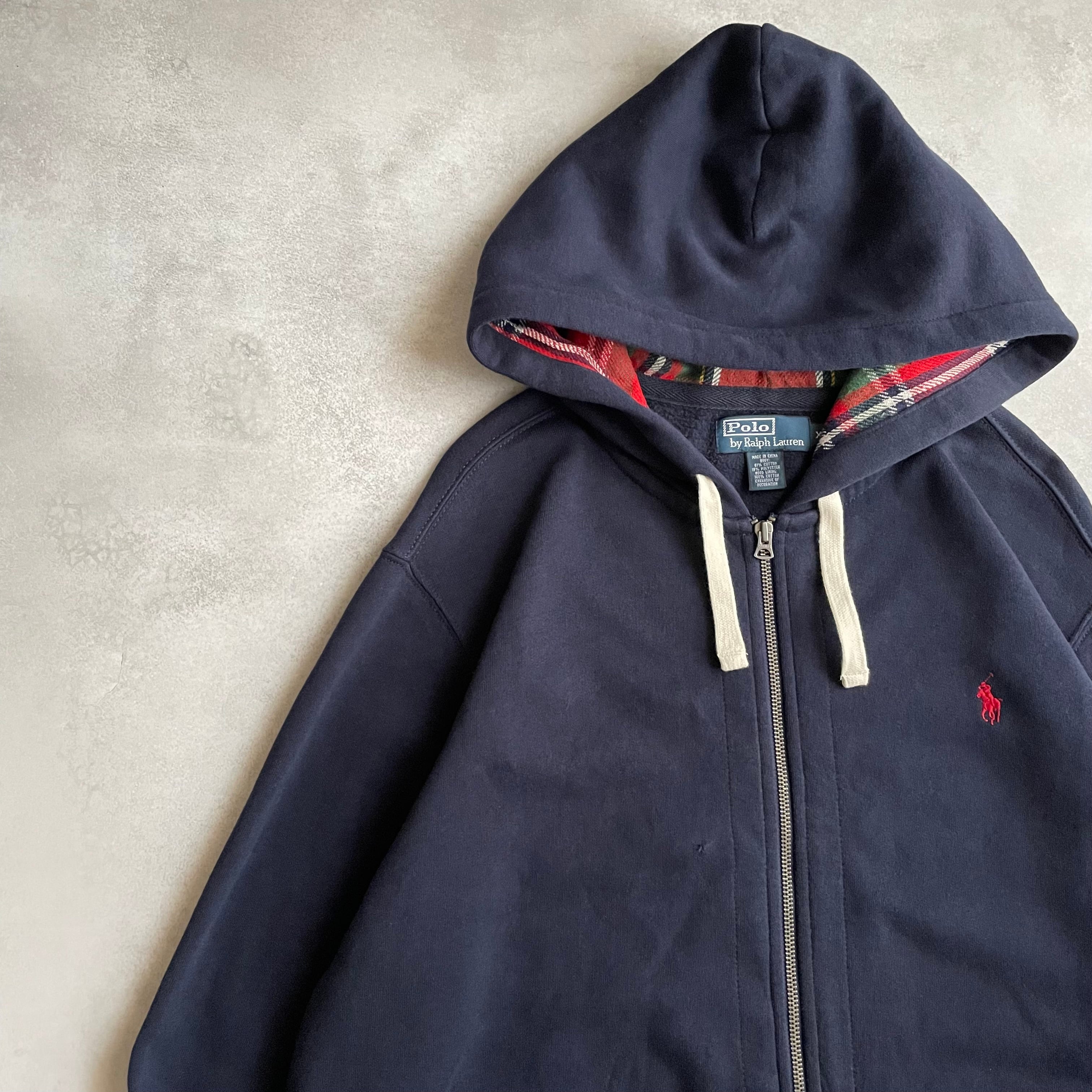 胸元にポニー刺繍のつくシンプルな作りで、フード裏のチェック地が可愛らしい1着