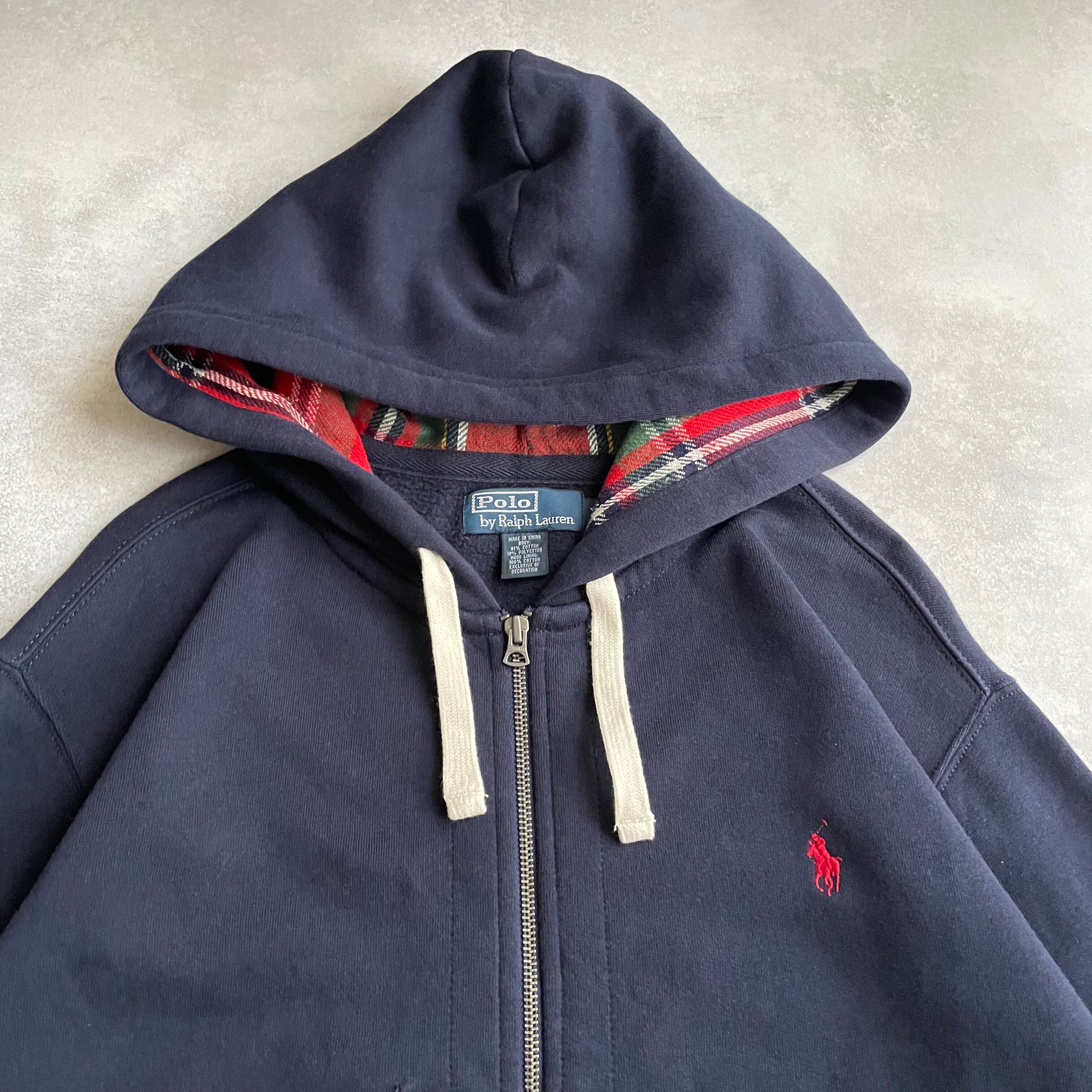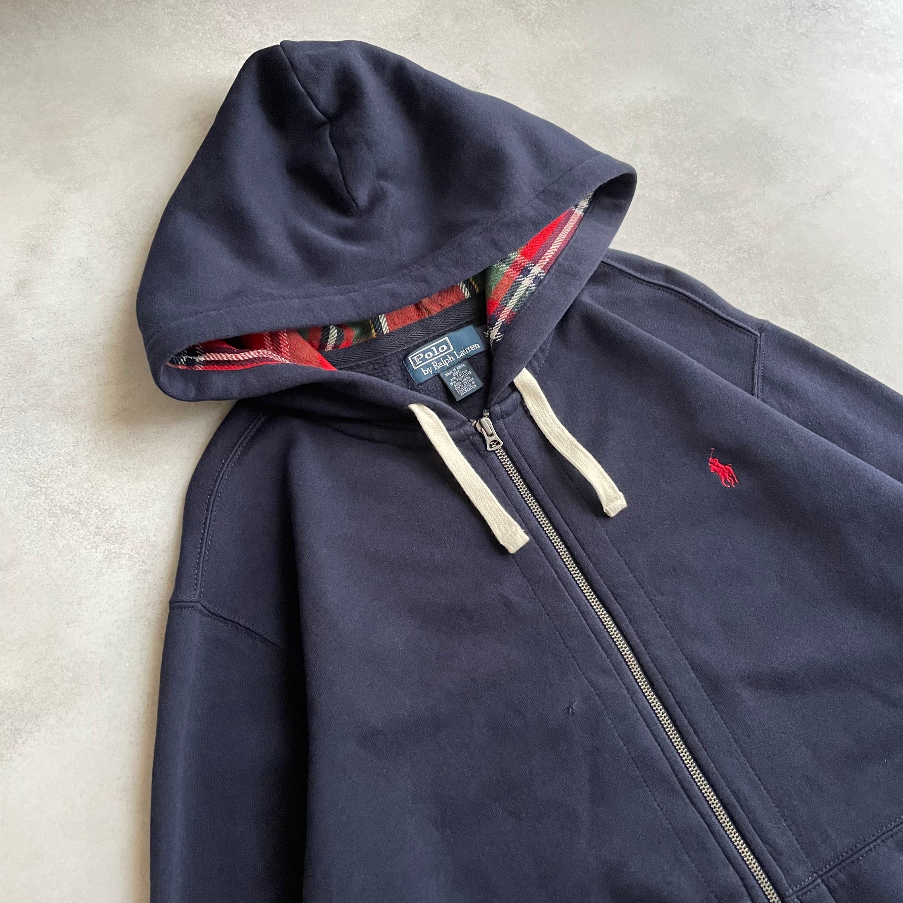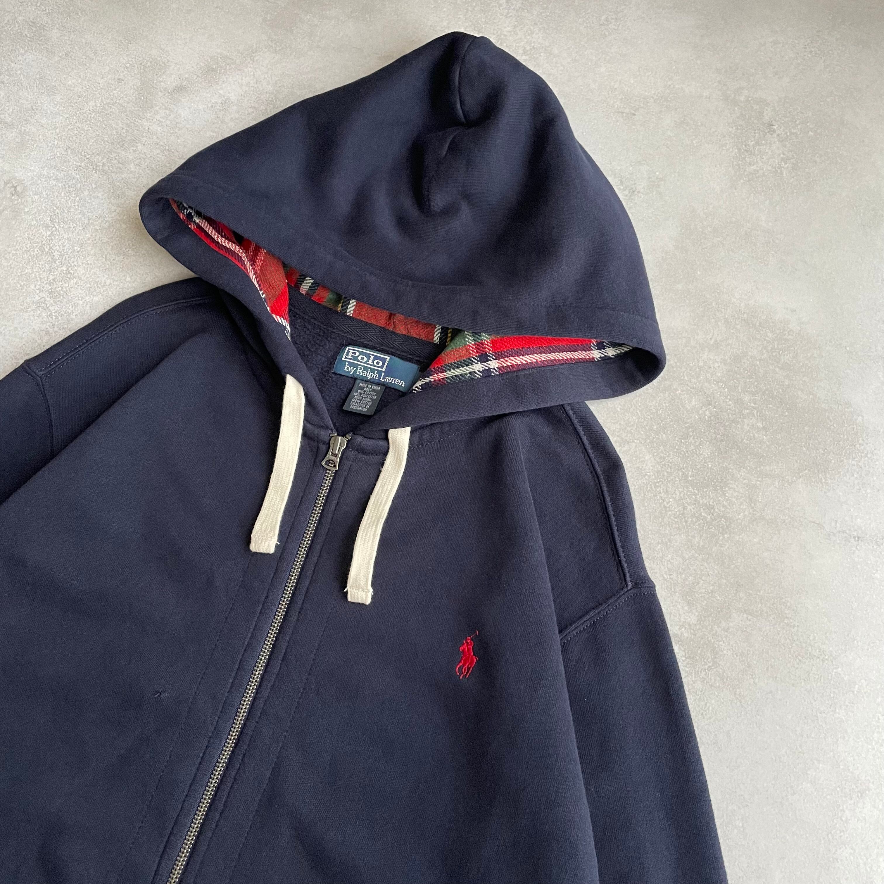 胸元にポニー刺繍のつくシンプルな作りで、フード裏のチェック地が可愛らしい1着