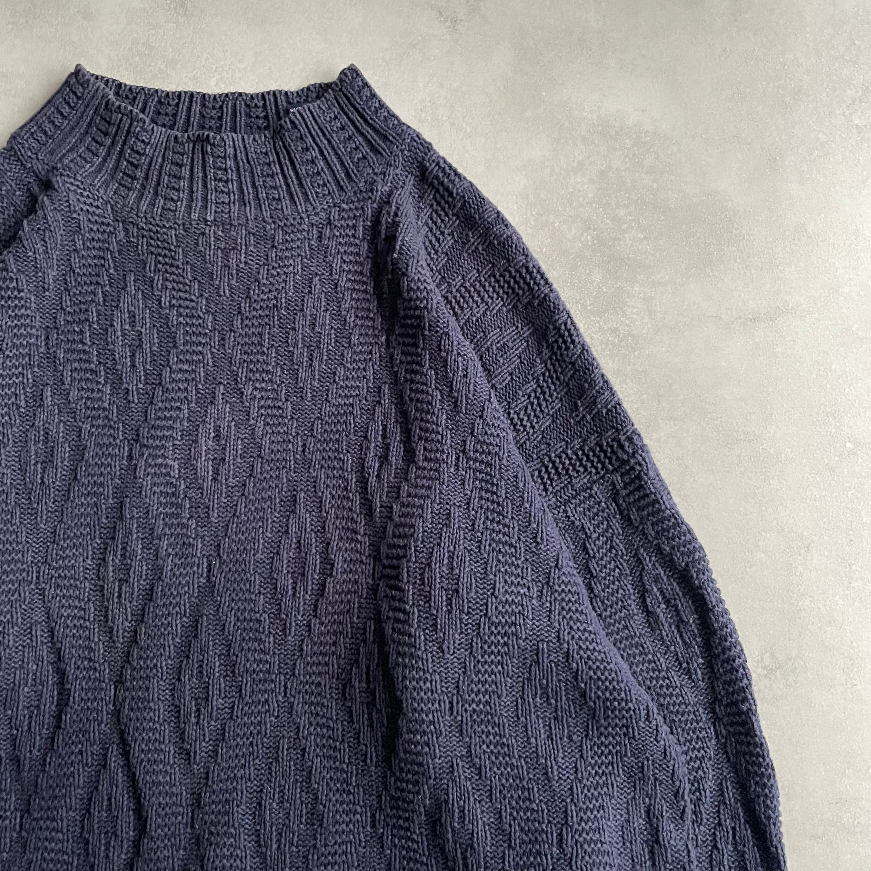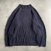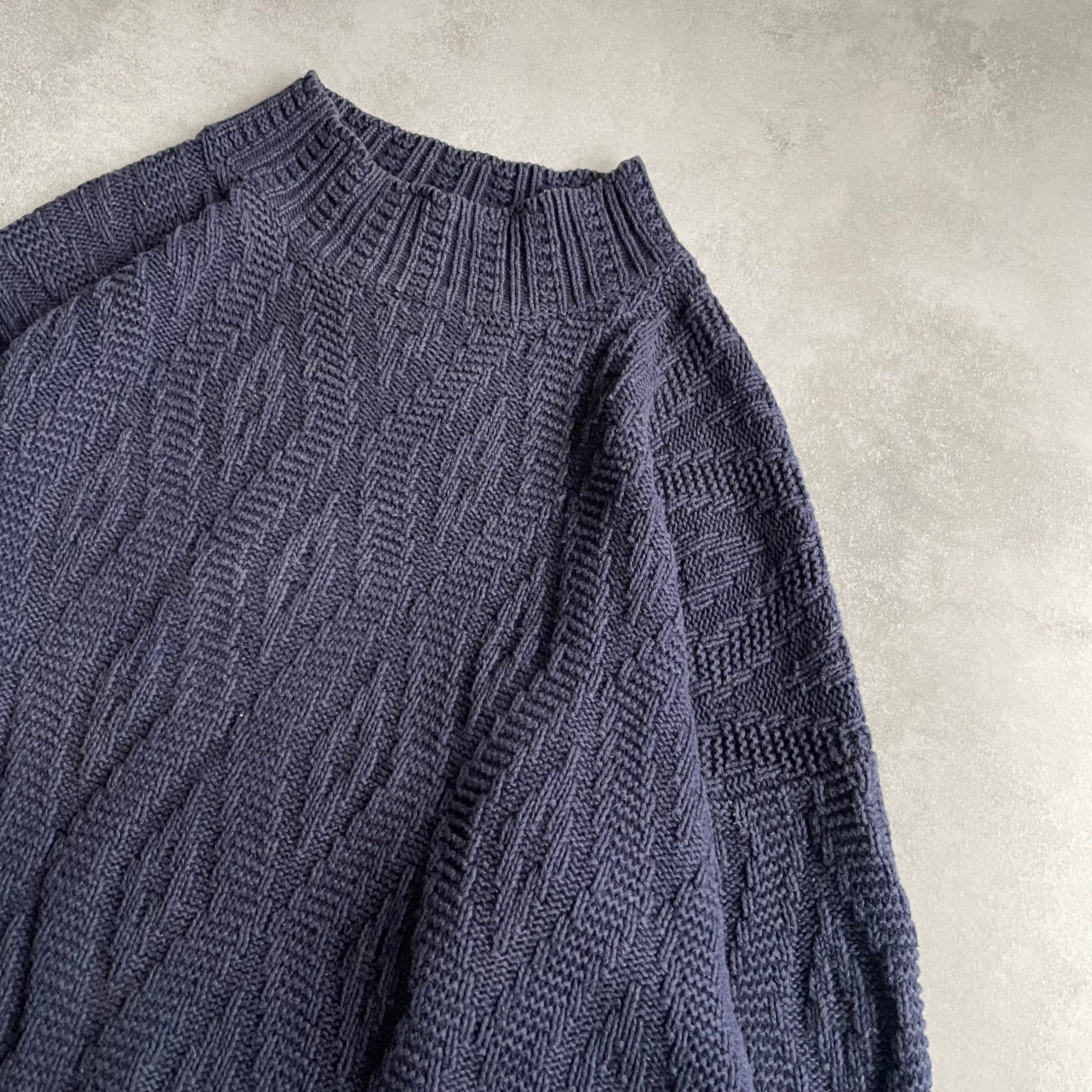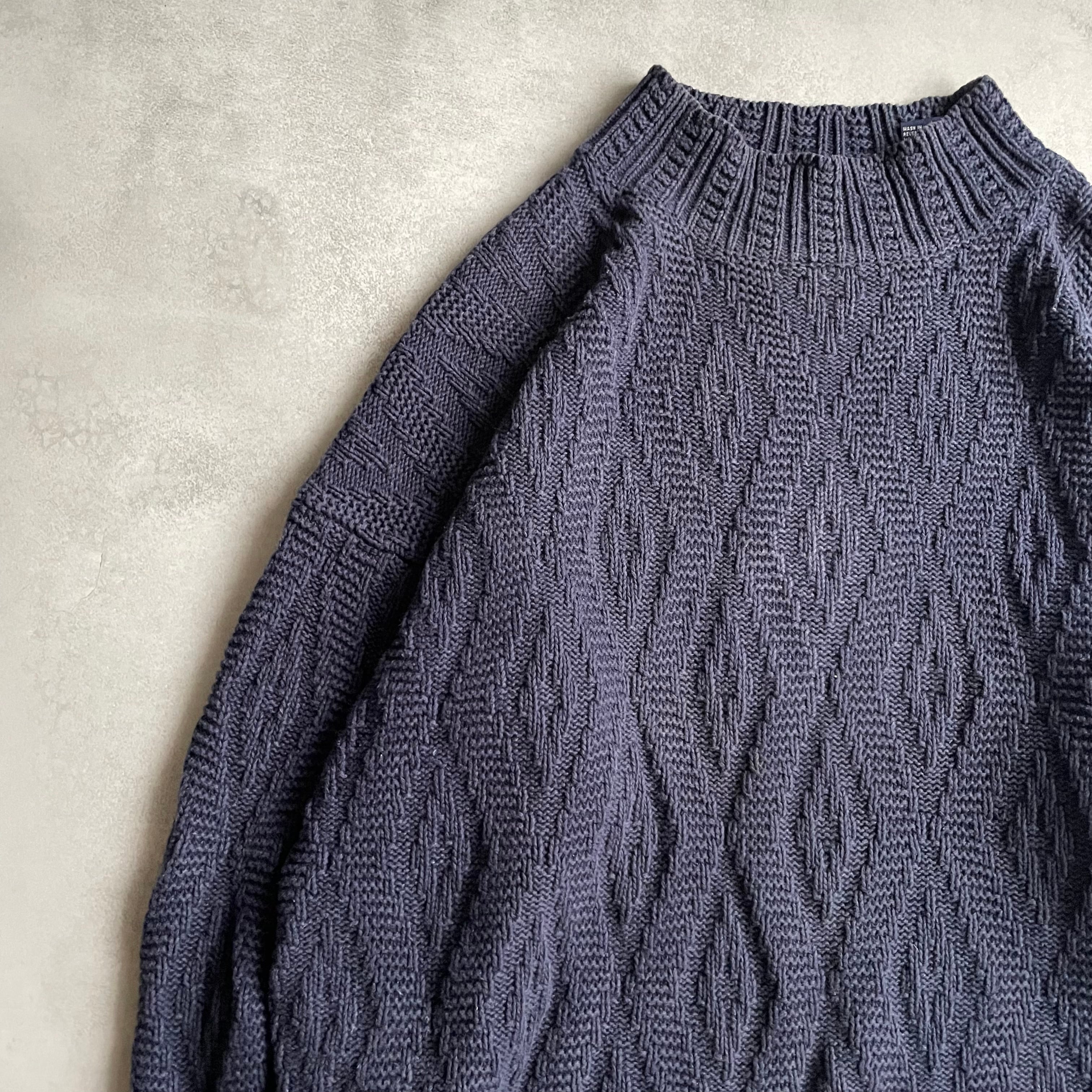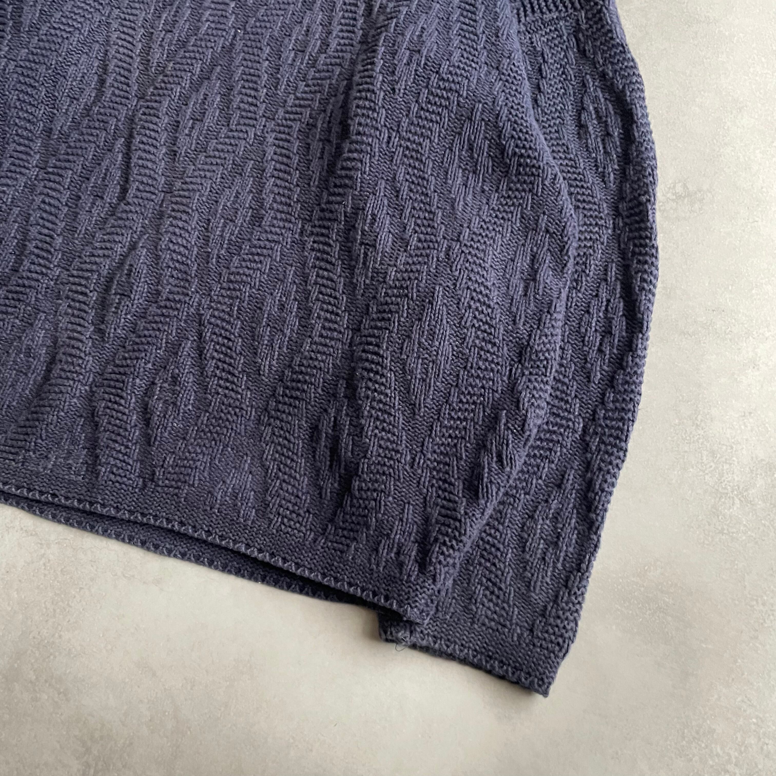 ダークネイビーボディにさりげない波打つようなデザインが施されたニット