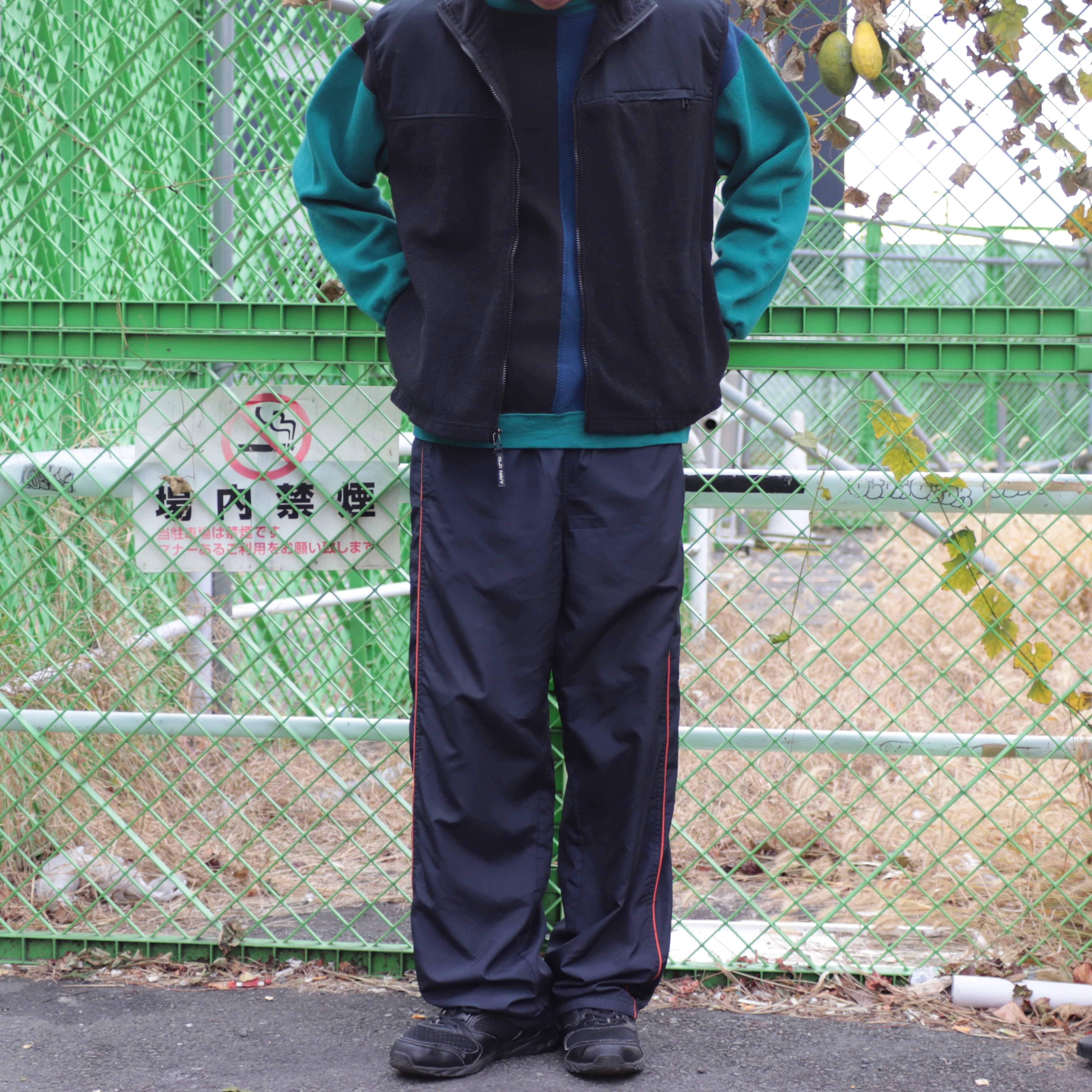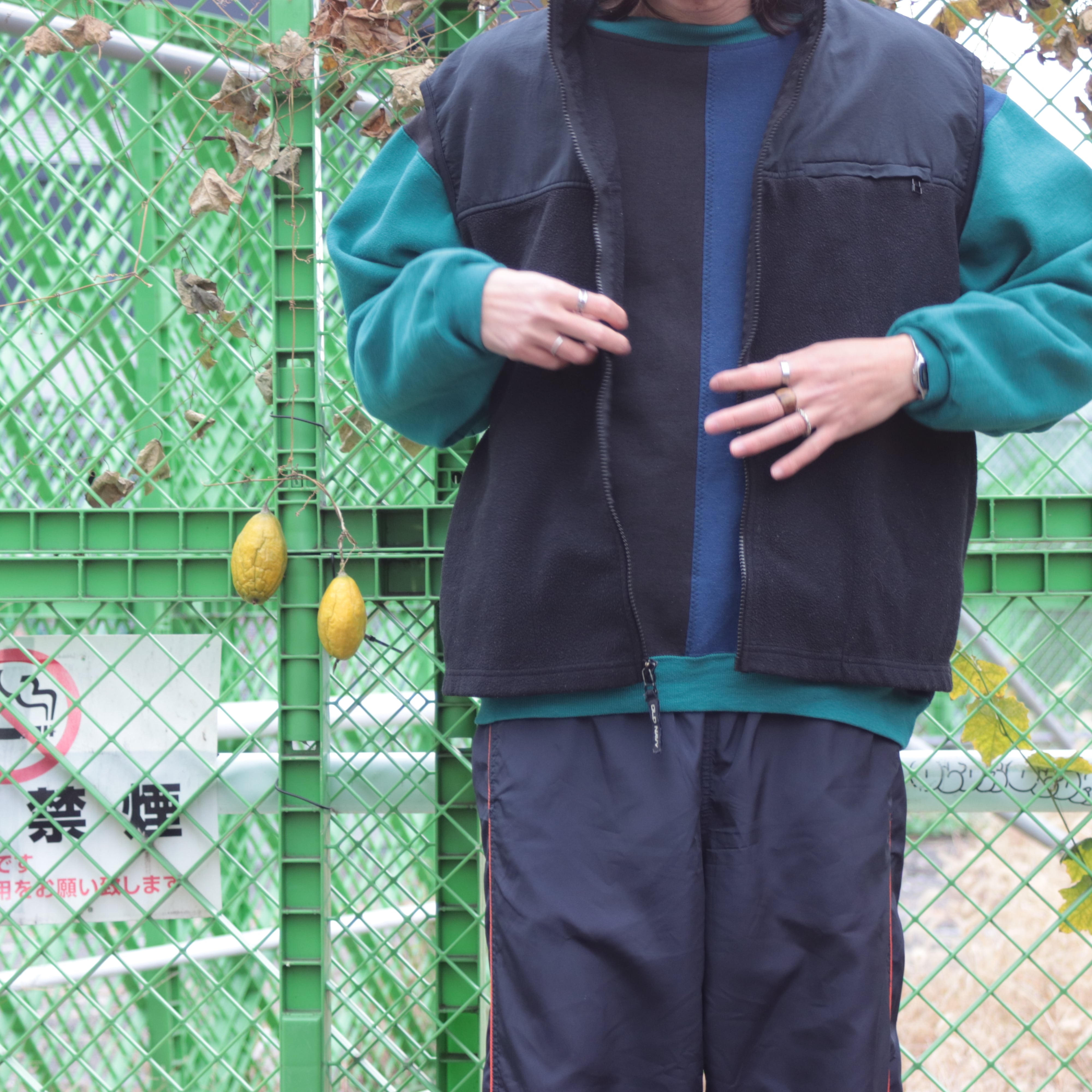 胸あたりに一直線上にナイロン切り替えが入るデザインで、オールブラックのフリースベスト