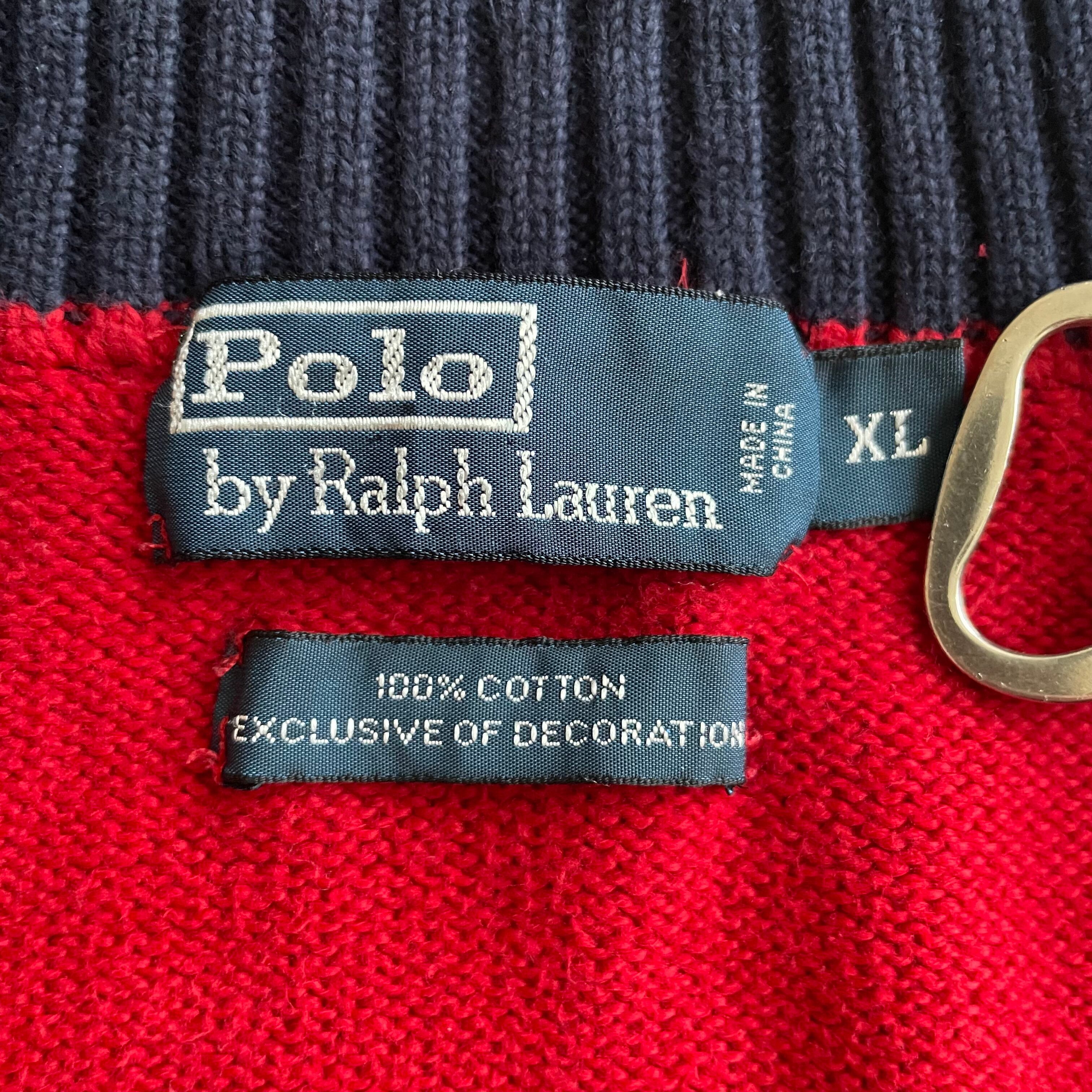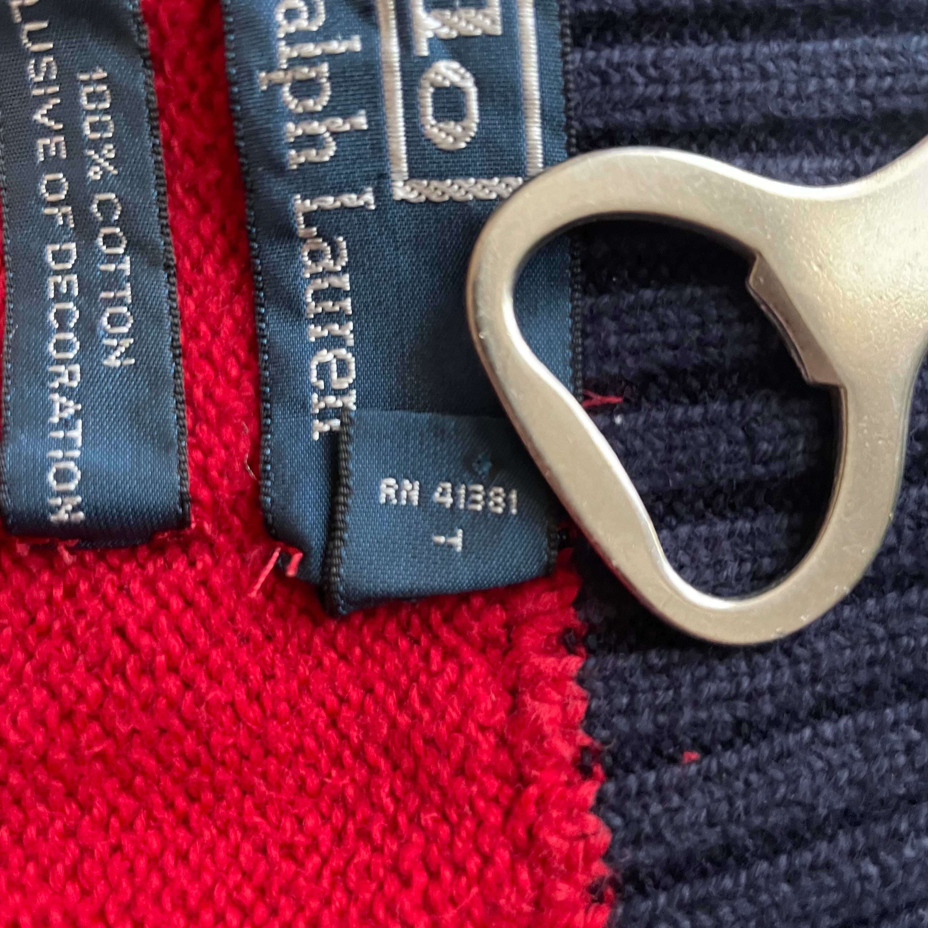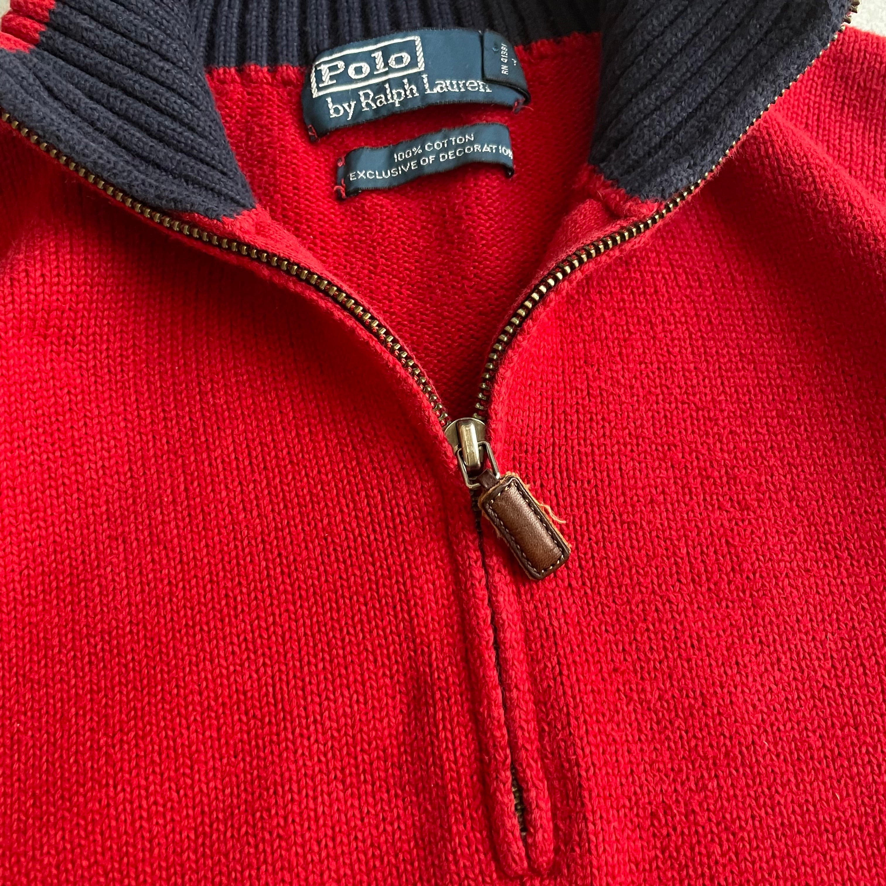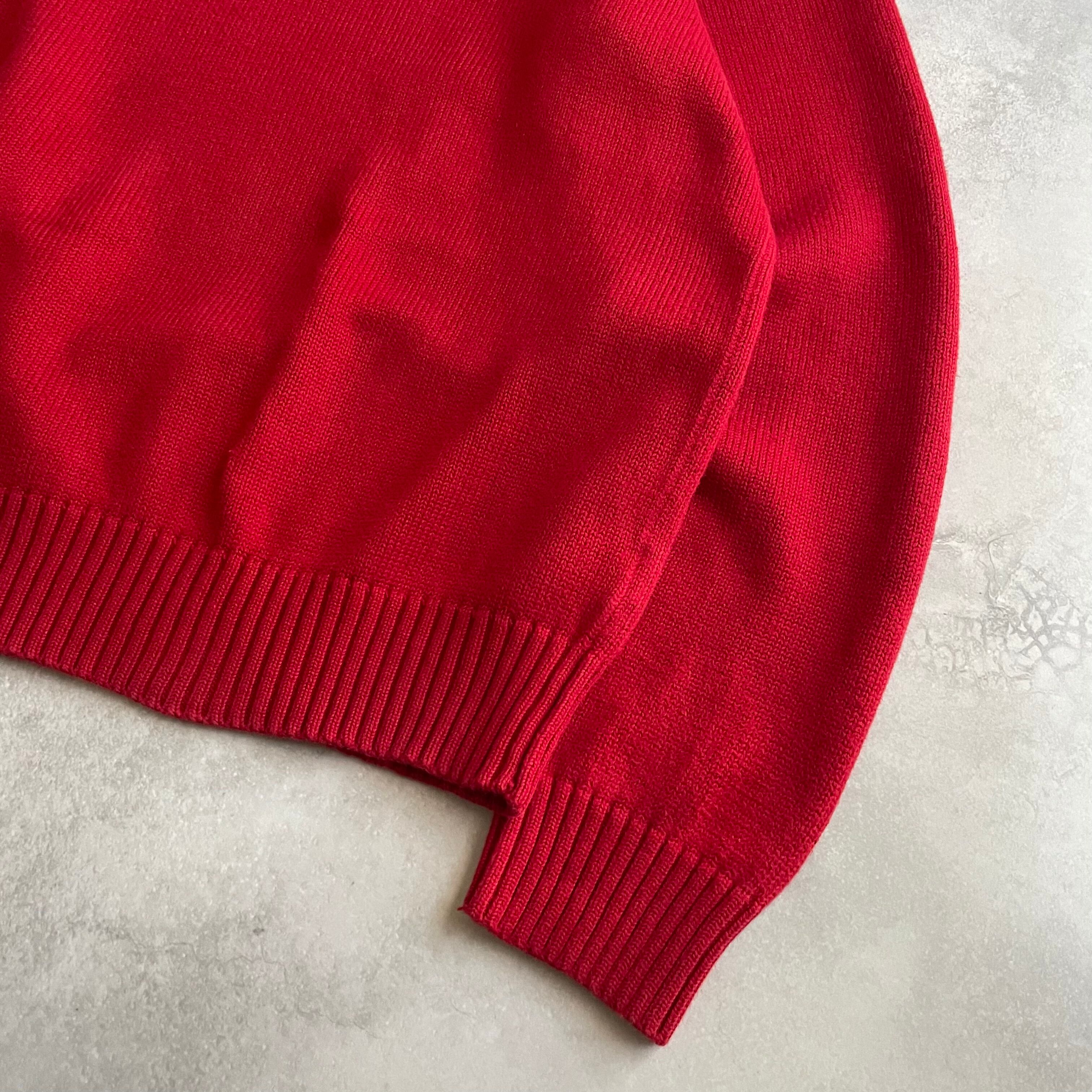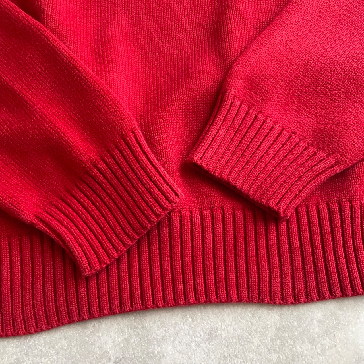 レッドカラーが目を惹くハーフジップセーターで、この手のアイテムでは珍しいしっかりとリブのつくタイプ