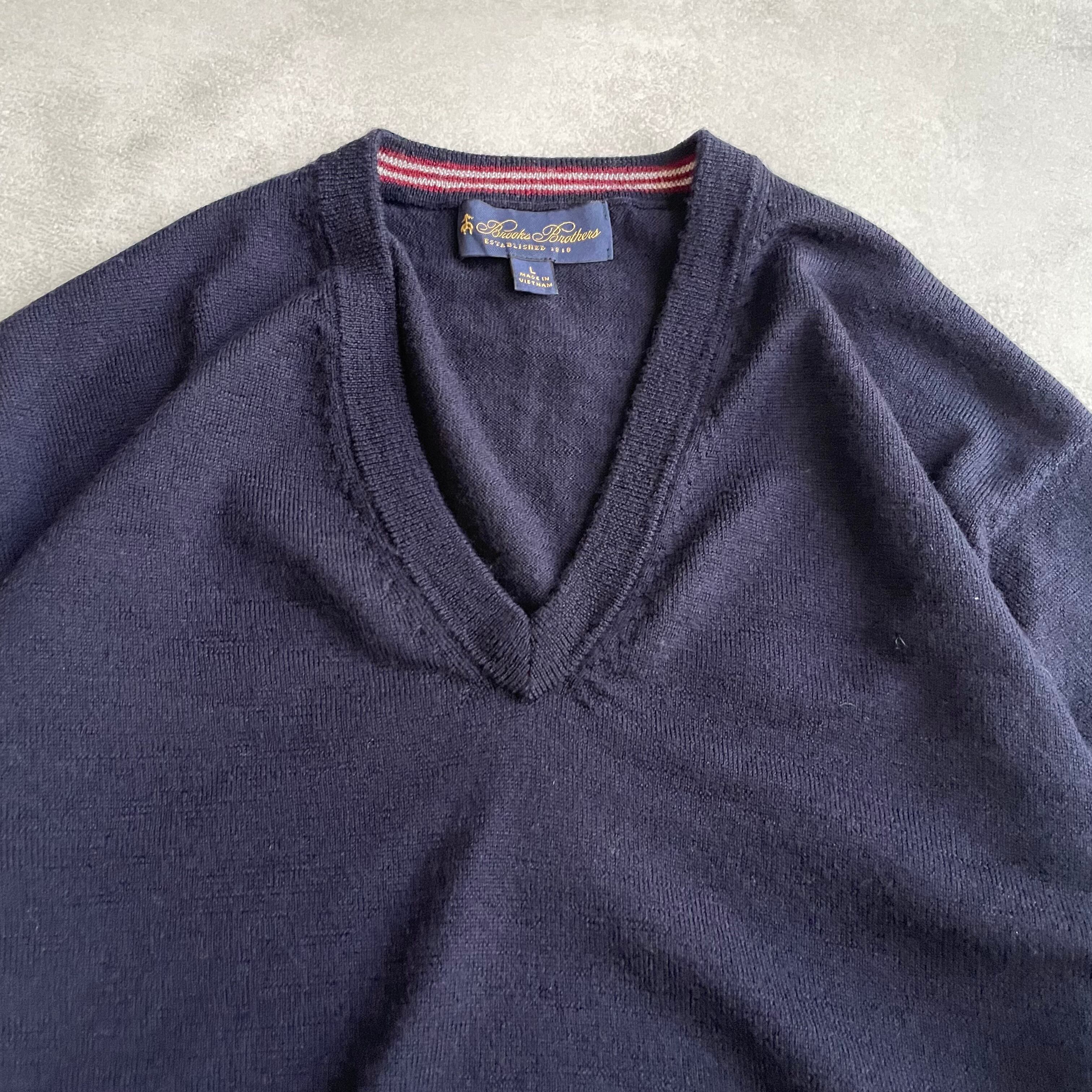 汎用性の高いネイビーカラーで無駄なデザインのないシンプルなVネックセーター