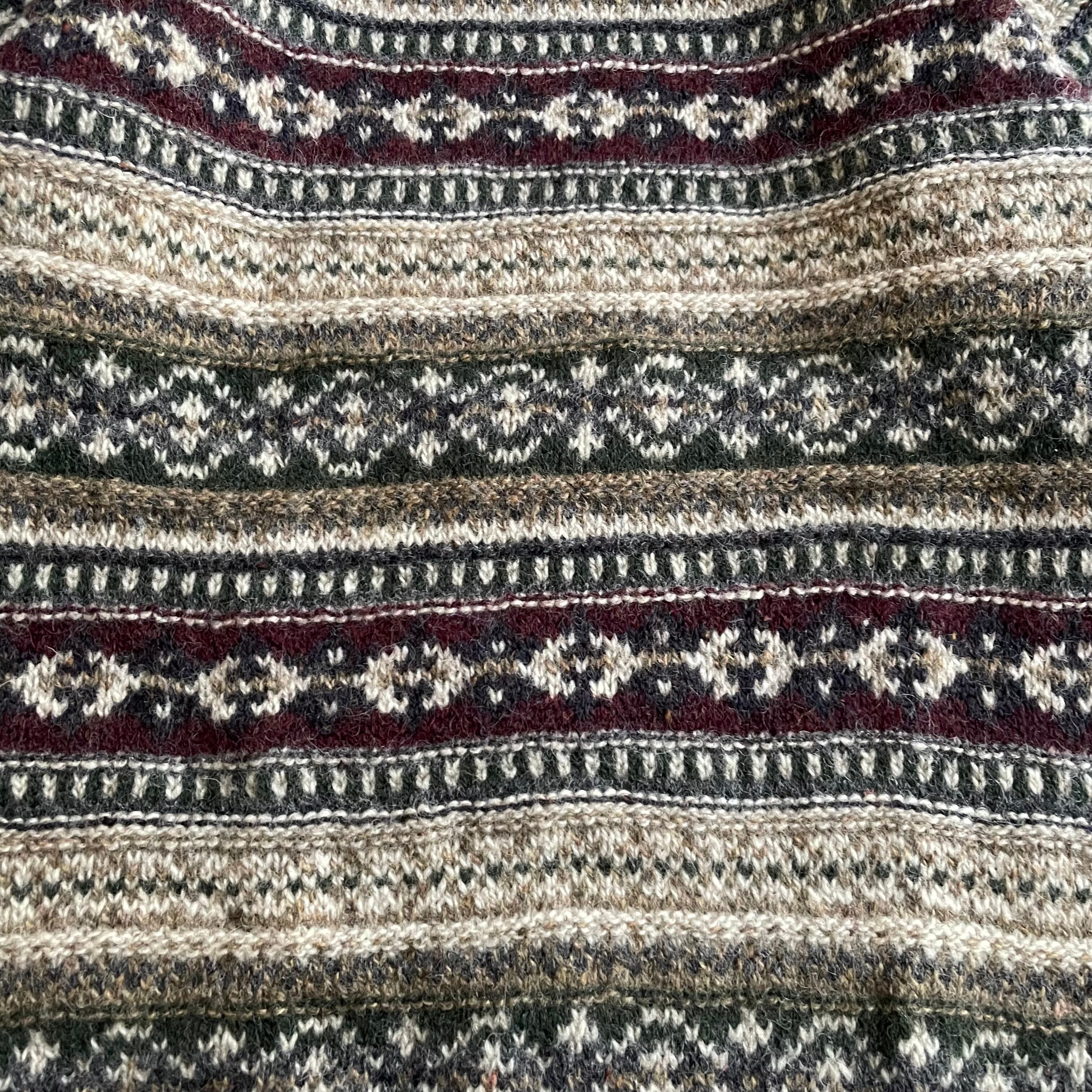 細かな幾何学模様が横縞に入るフェアアイル柄の1着