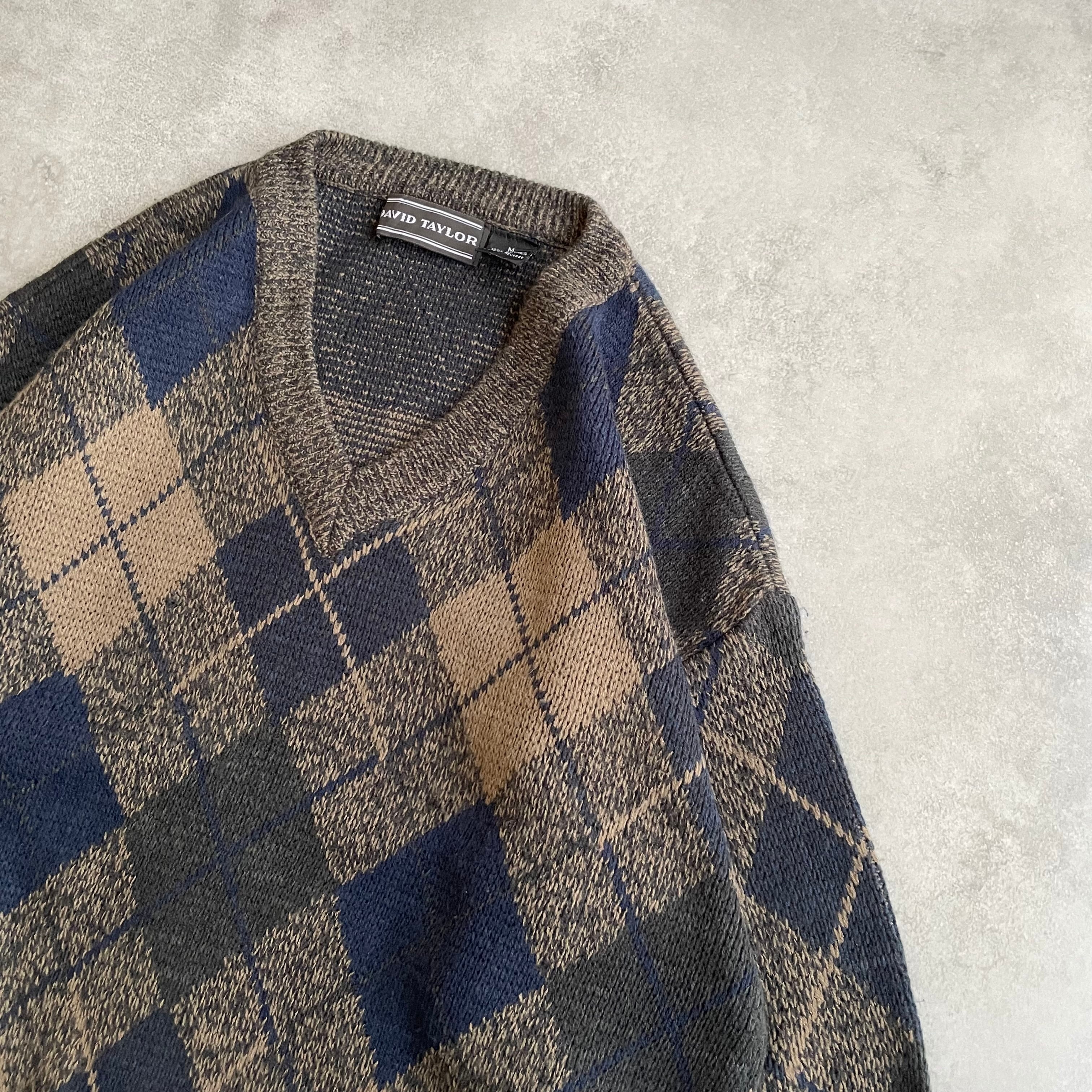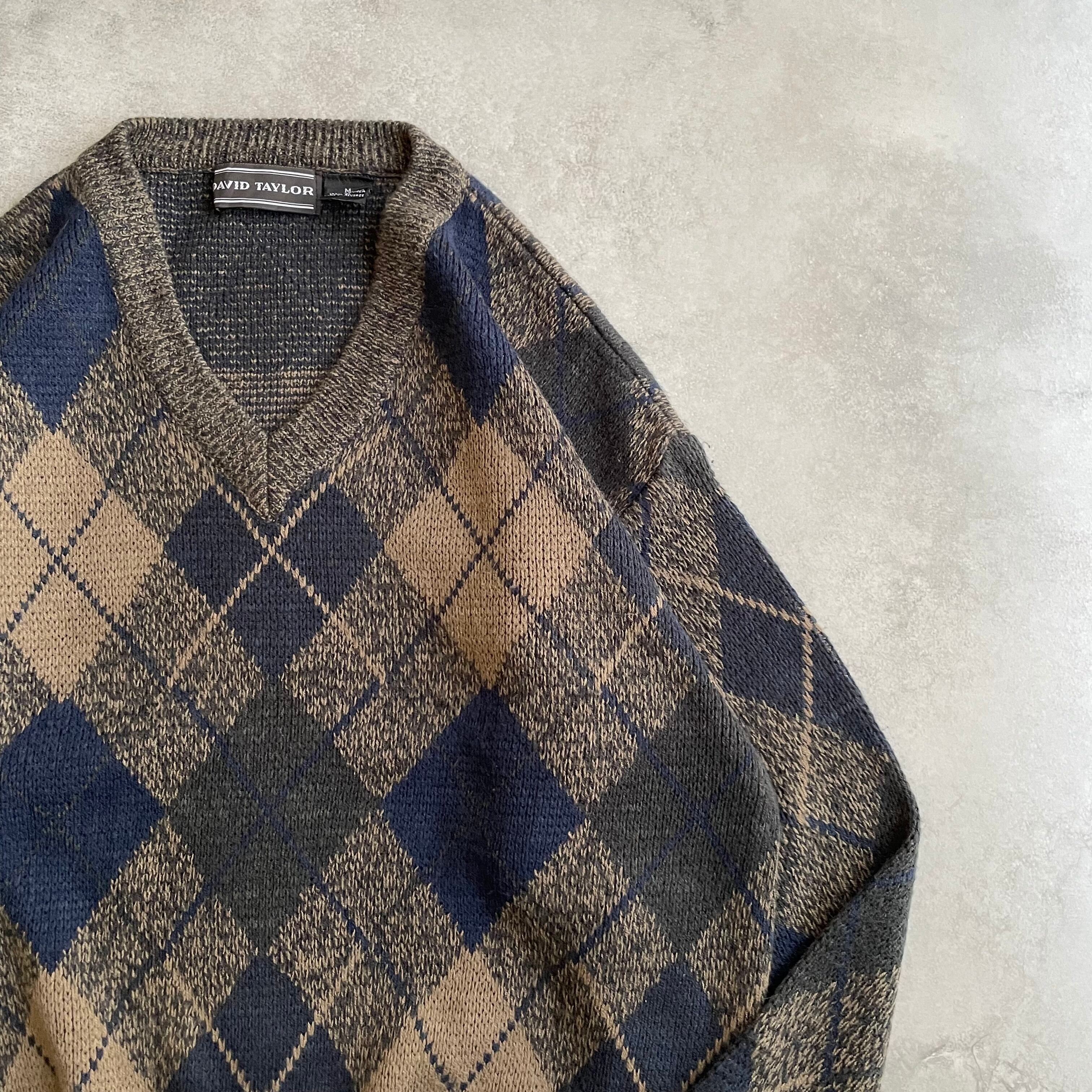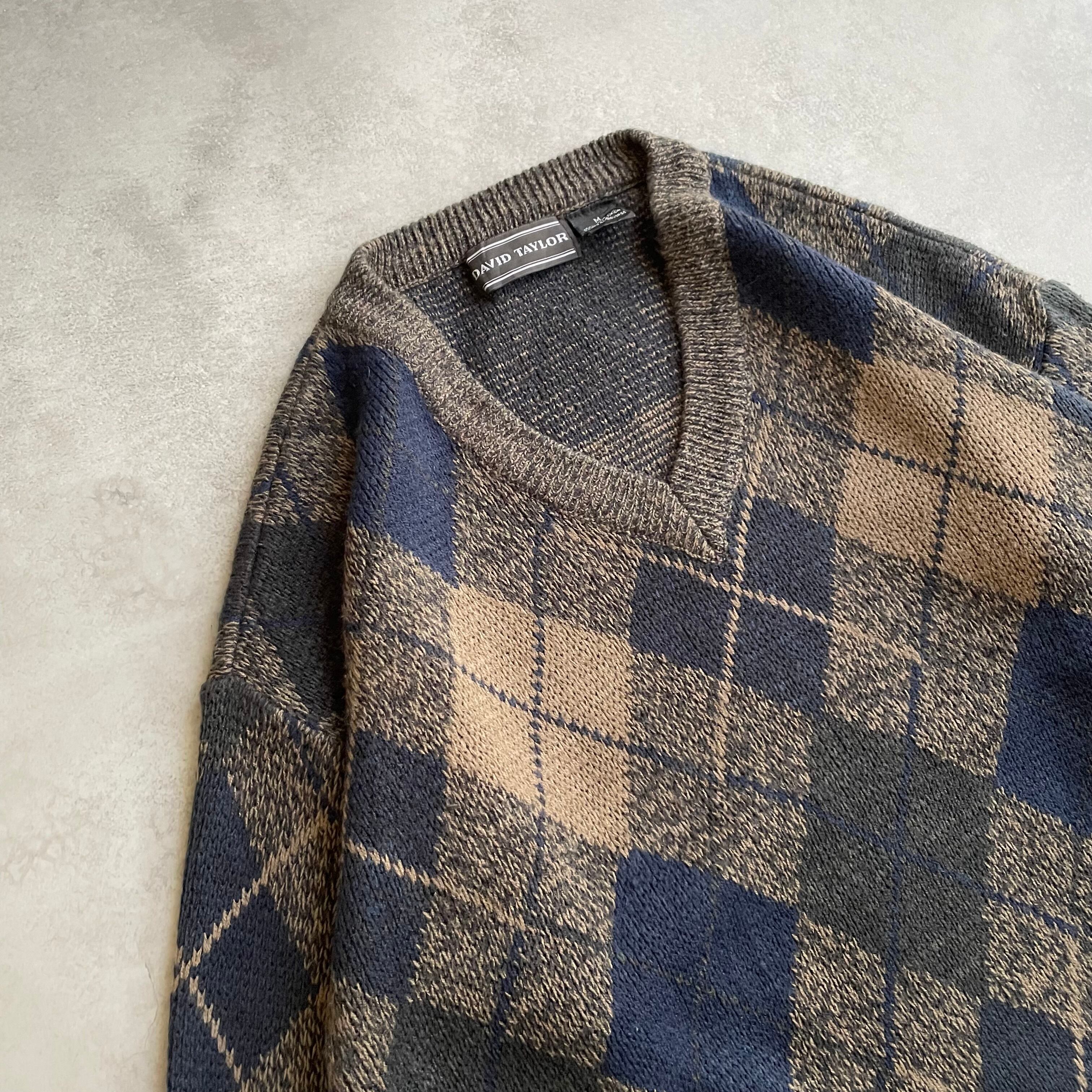 90s David Taylor V neck Argyle pattern acrylic sweater