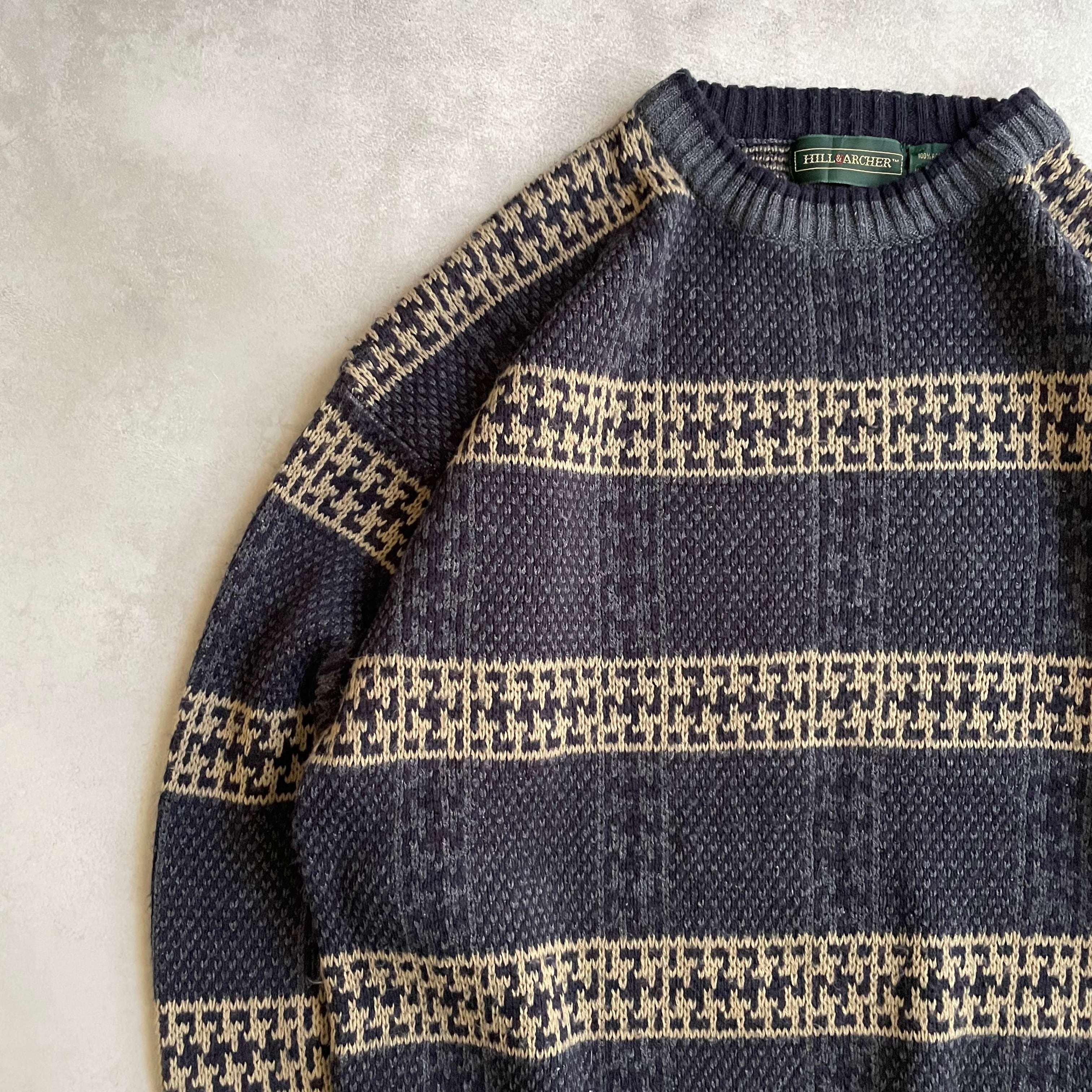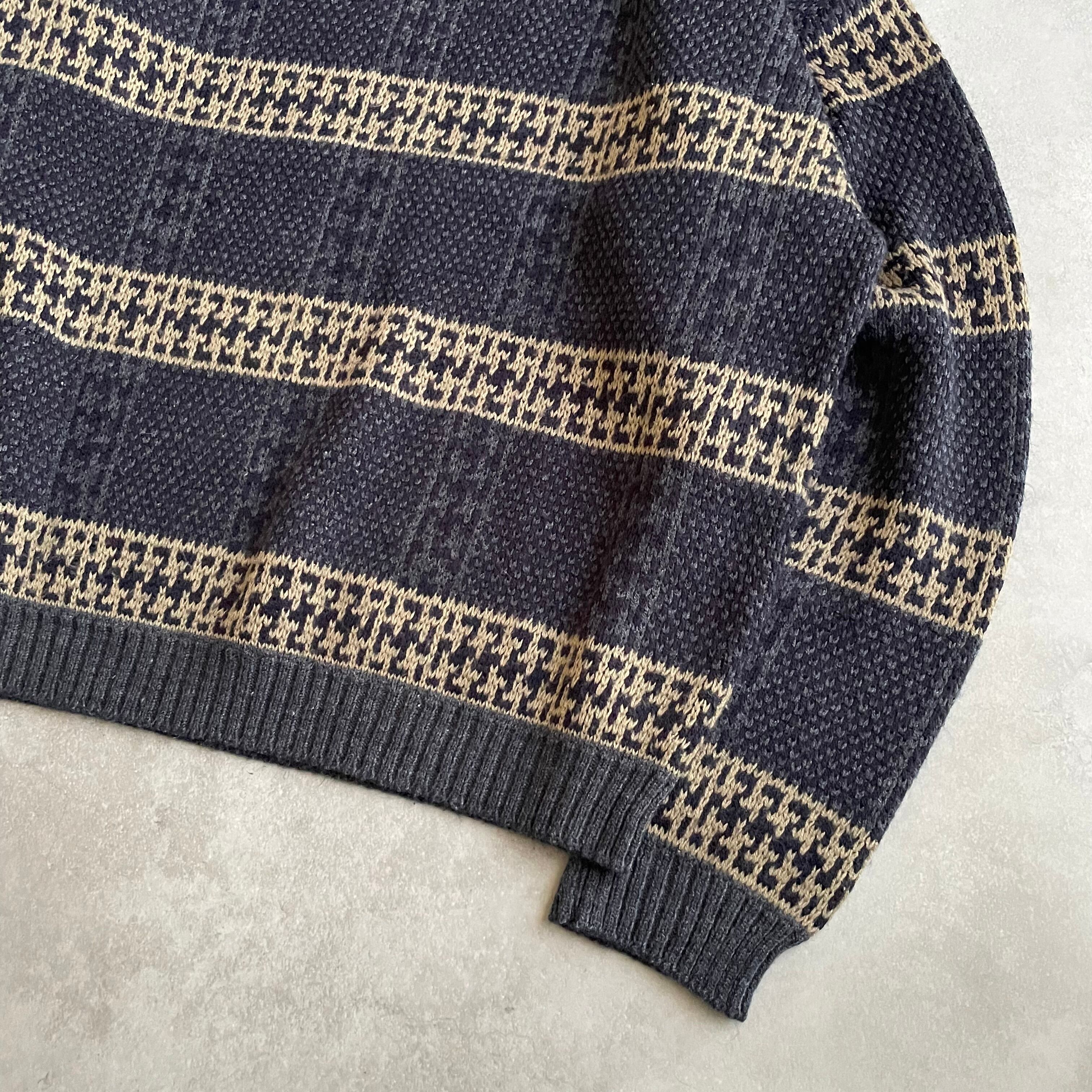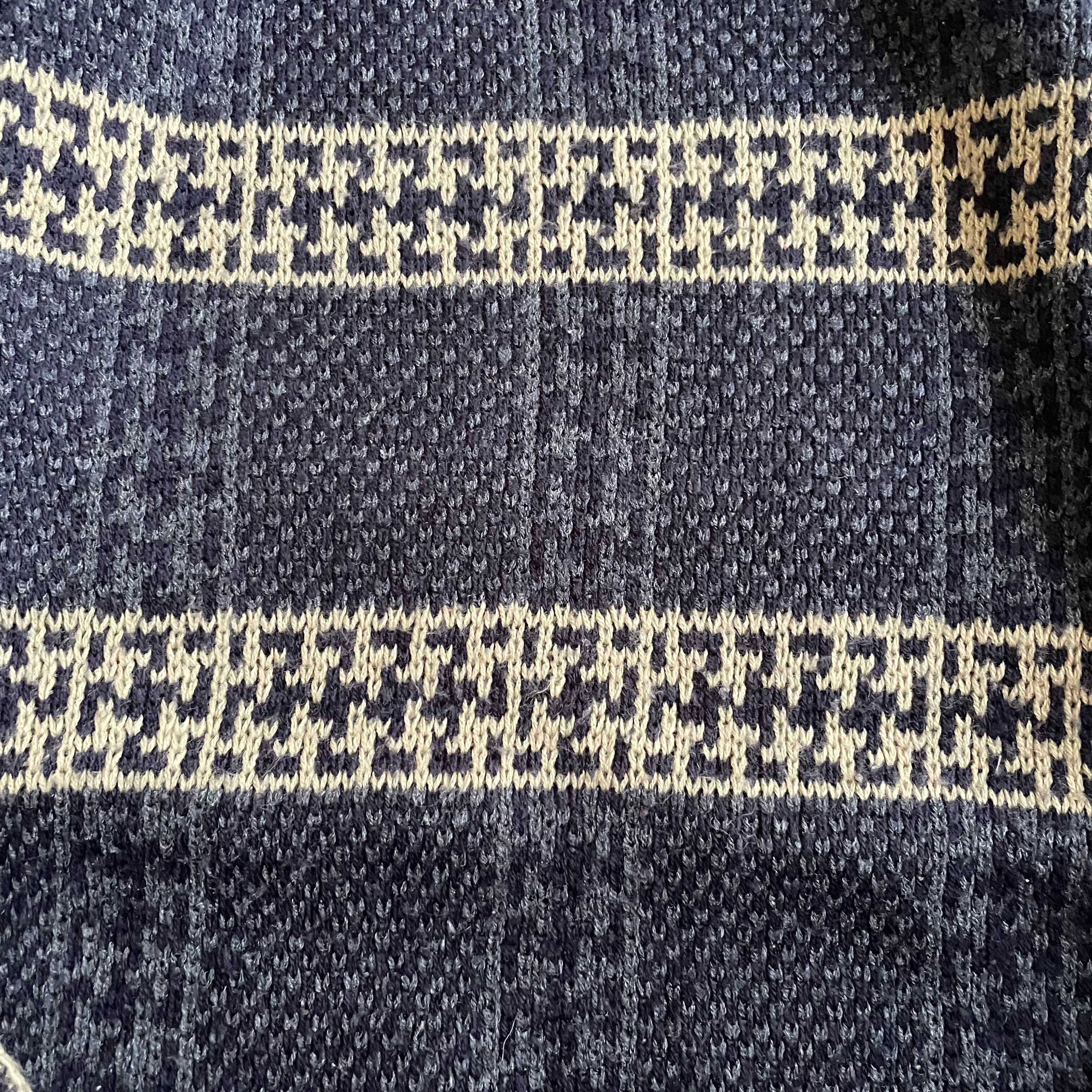 千鳥格子調のデザインが格子状に散りばめられた1着で、ネイビー×アイボリーの好配色