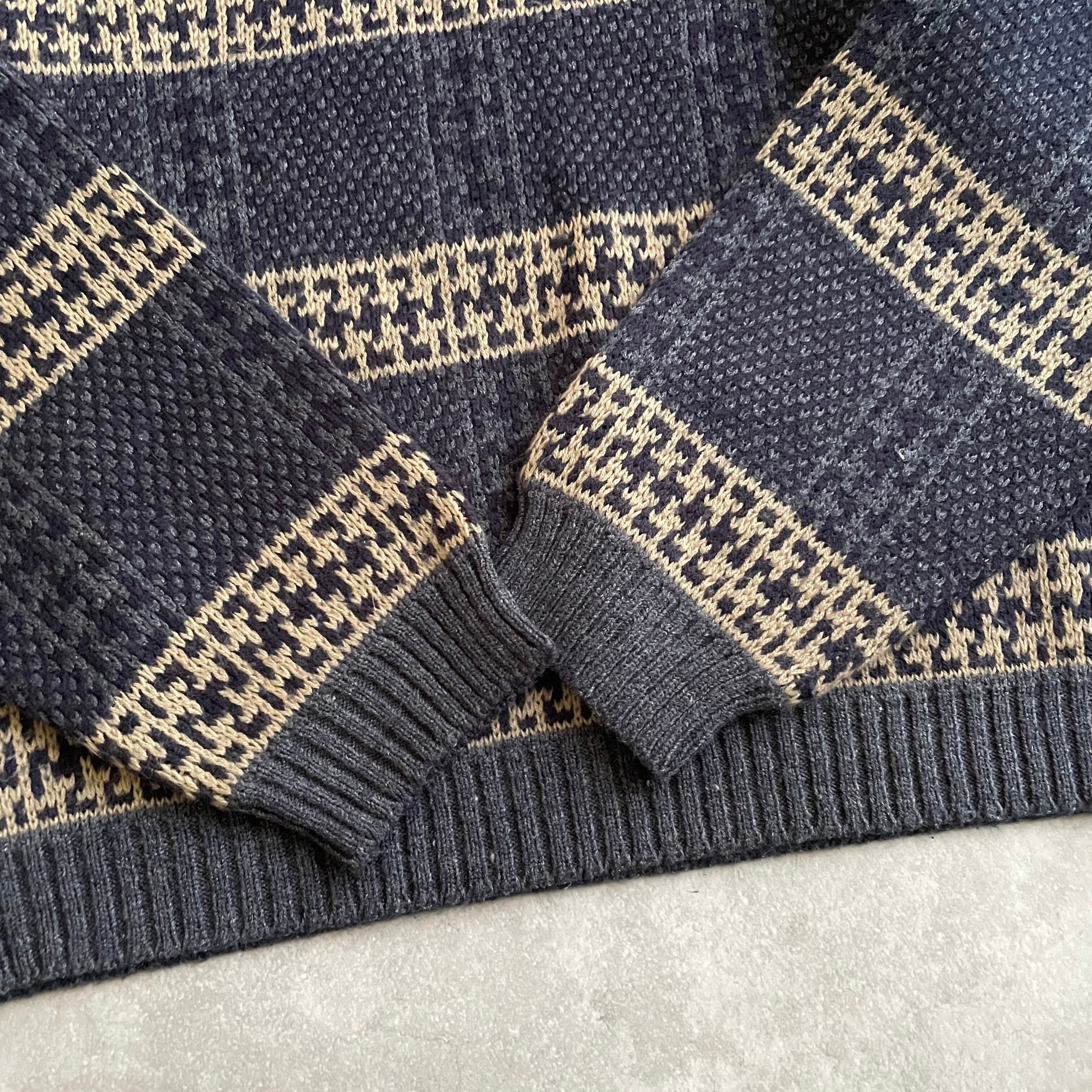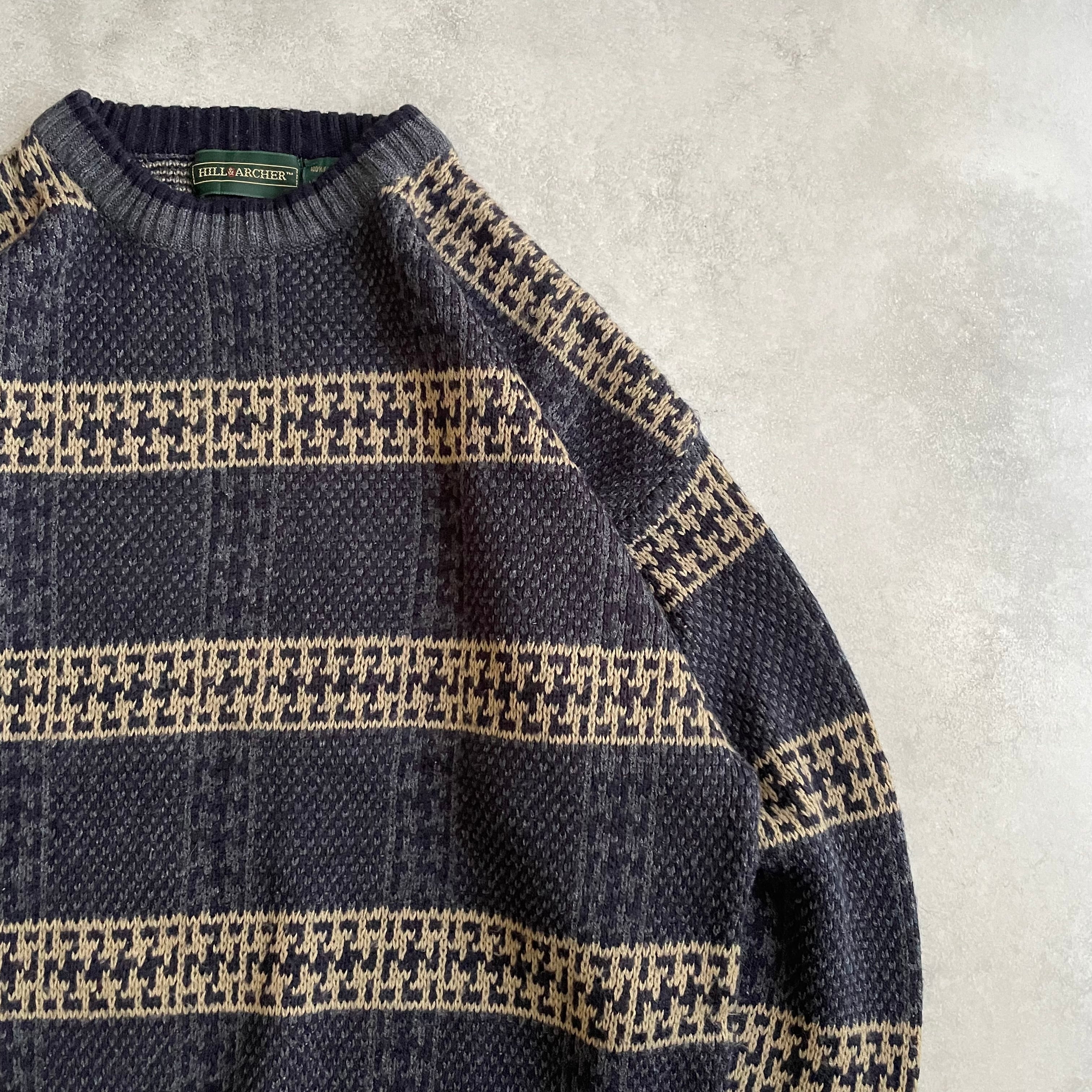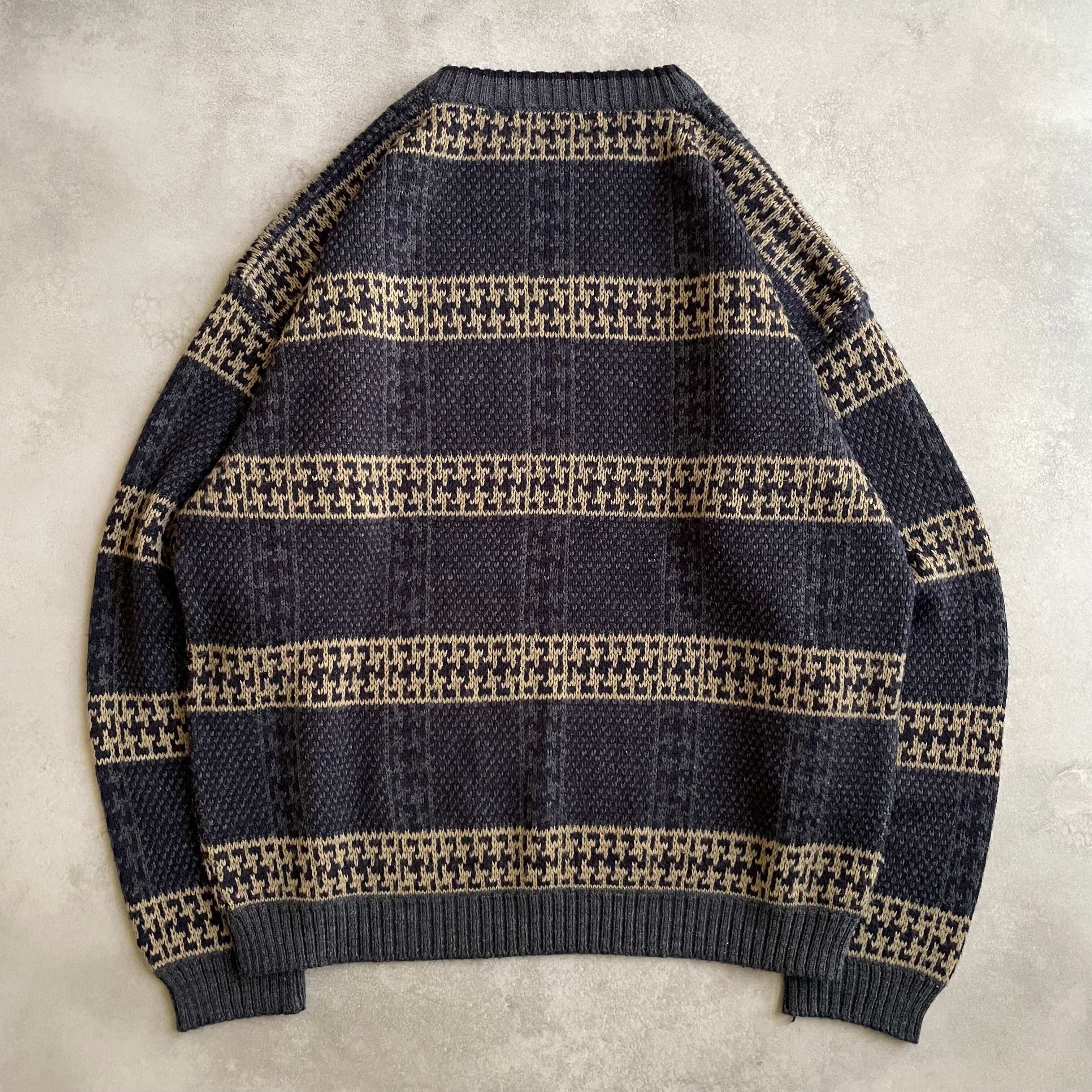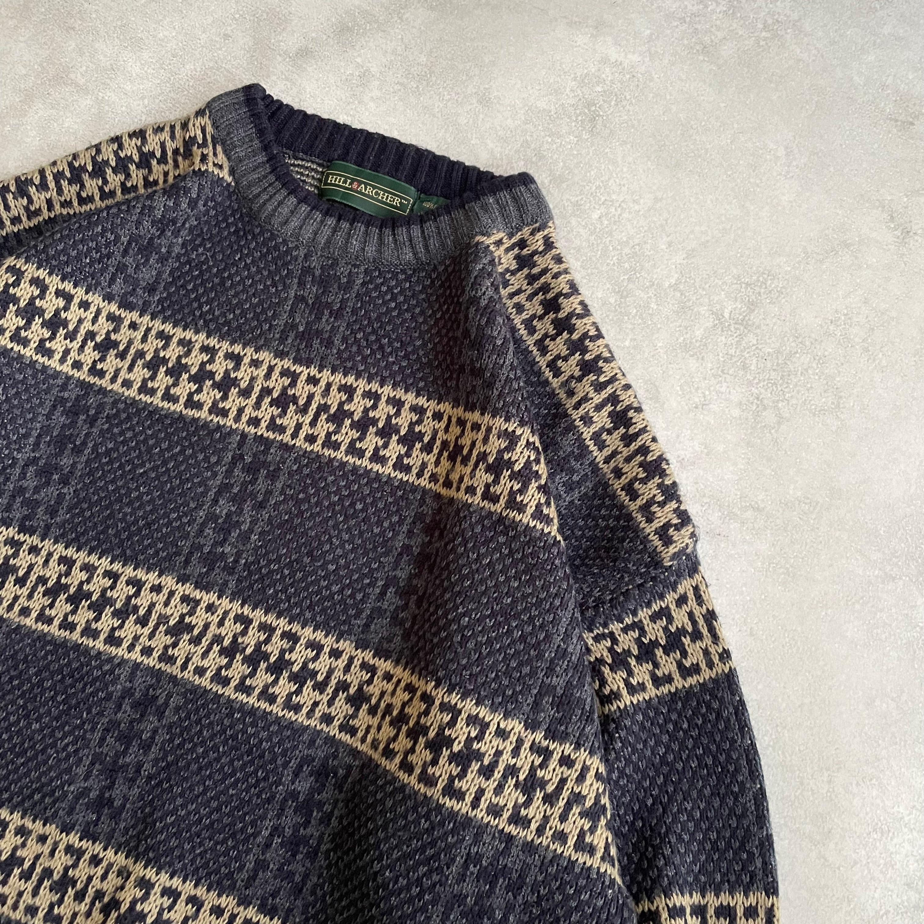 千鳥格子調のデザインが格子状に散りばめられた1着で、ネイビー×アイボリーの好配色