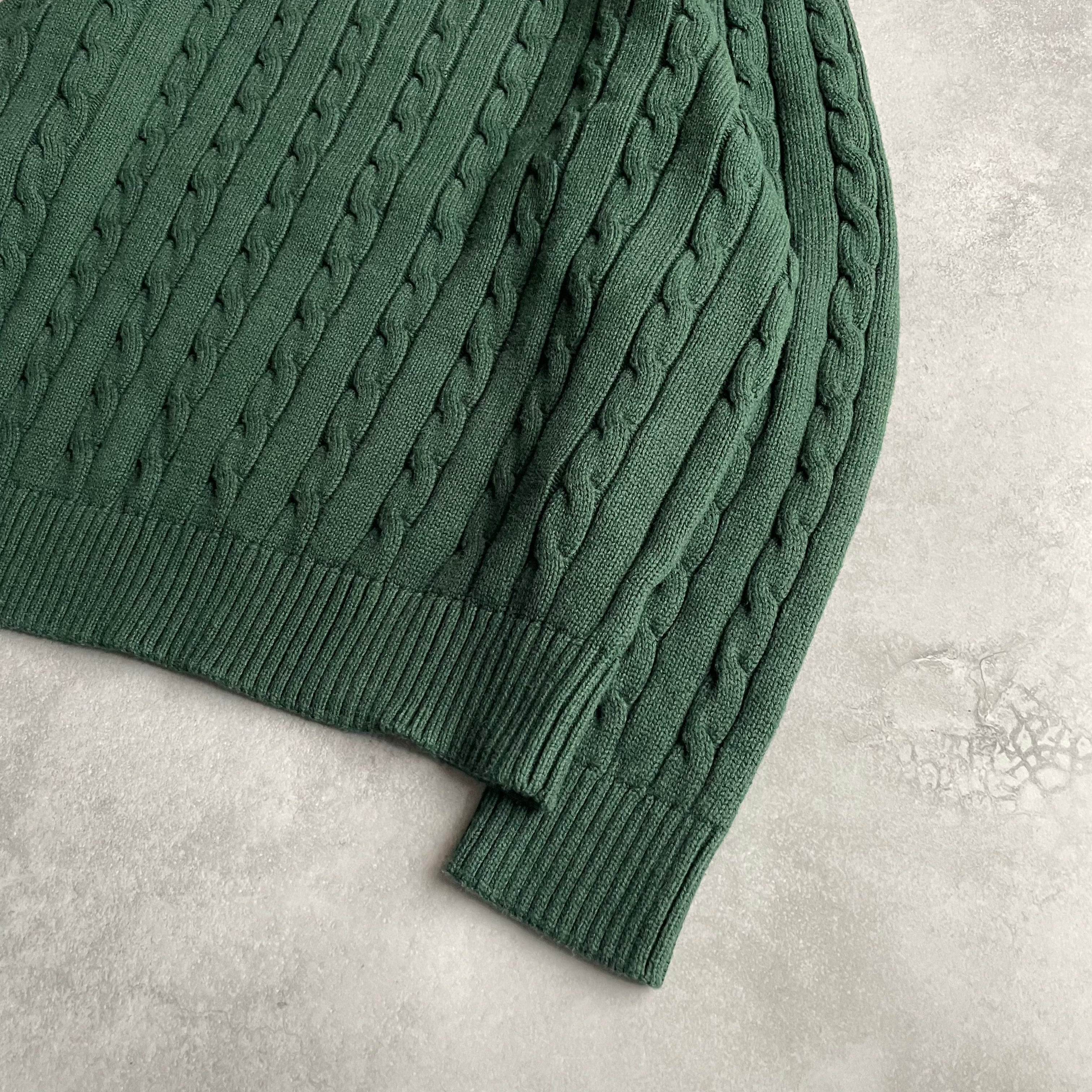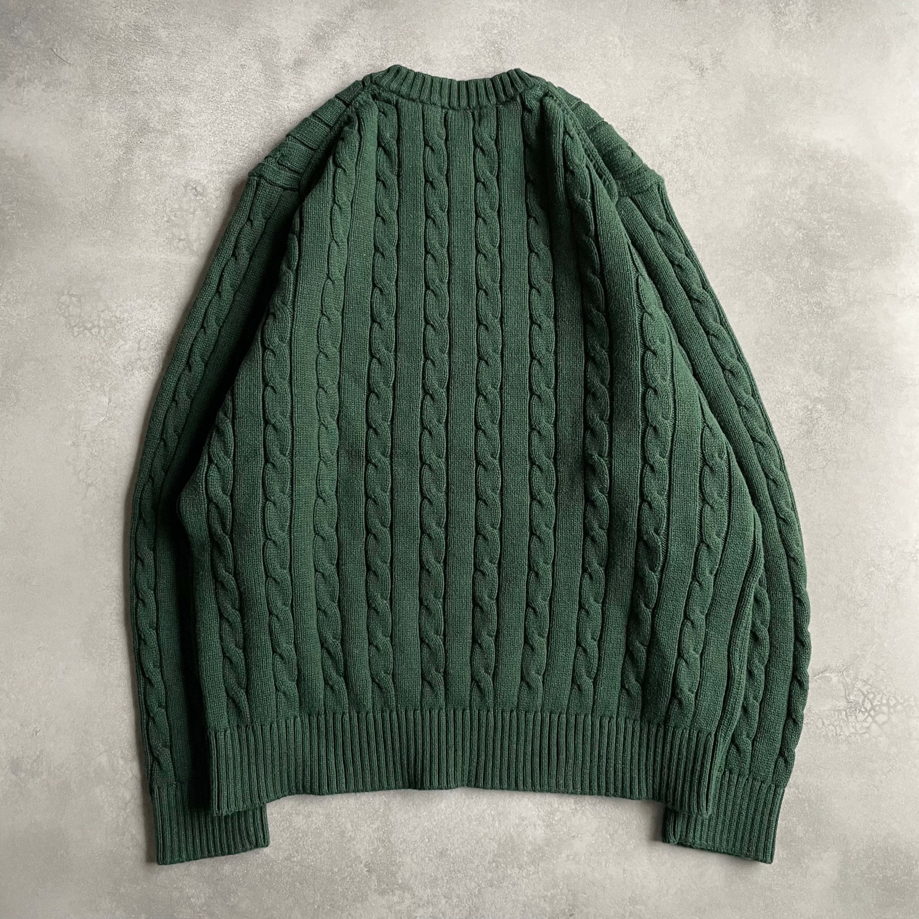 シンプルな無地と比べてより大人びた雰囲気で着れるケーブル編みのデザインもポイント
