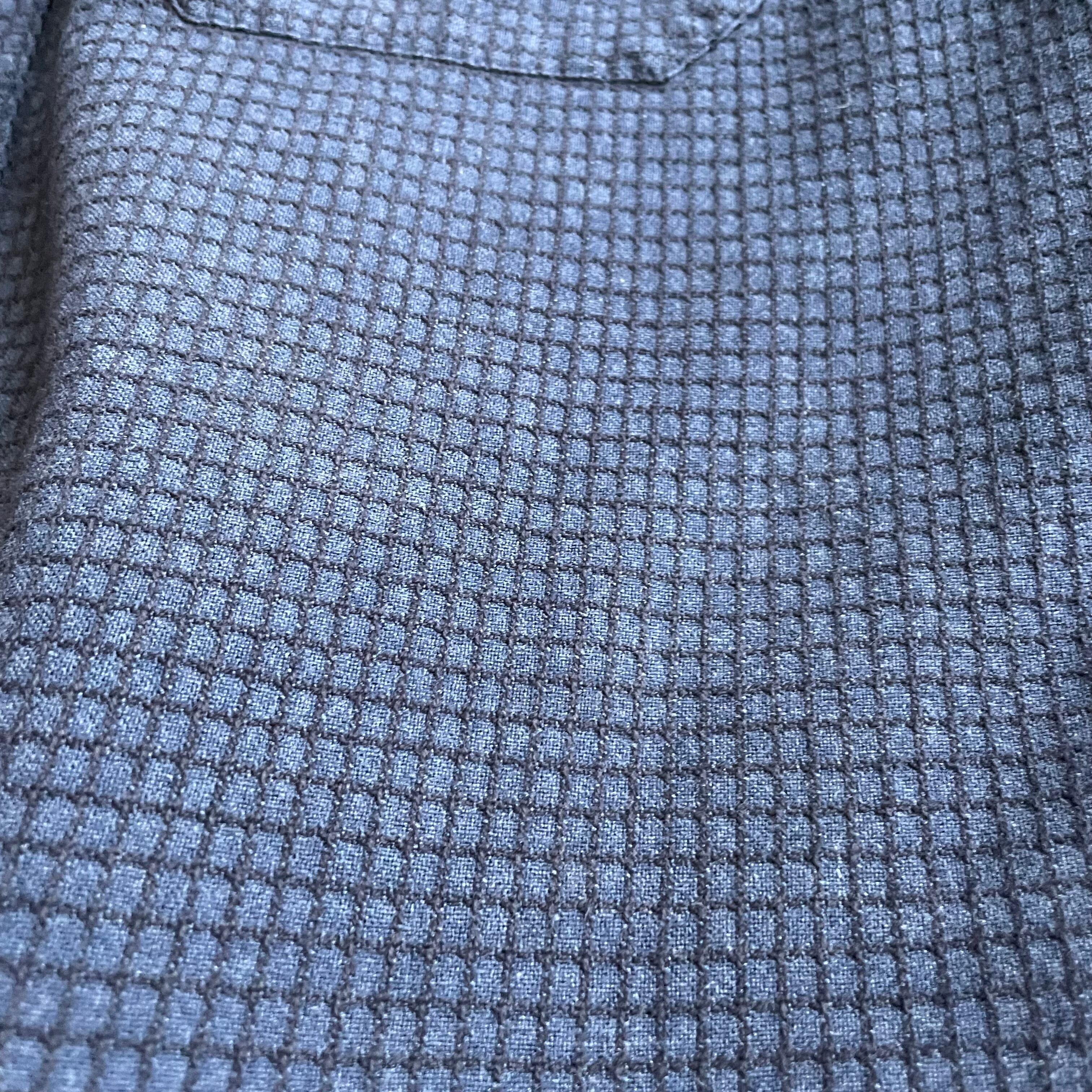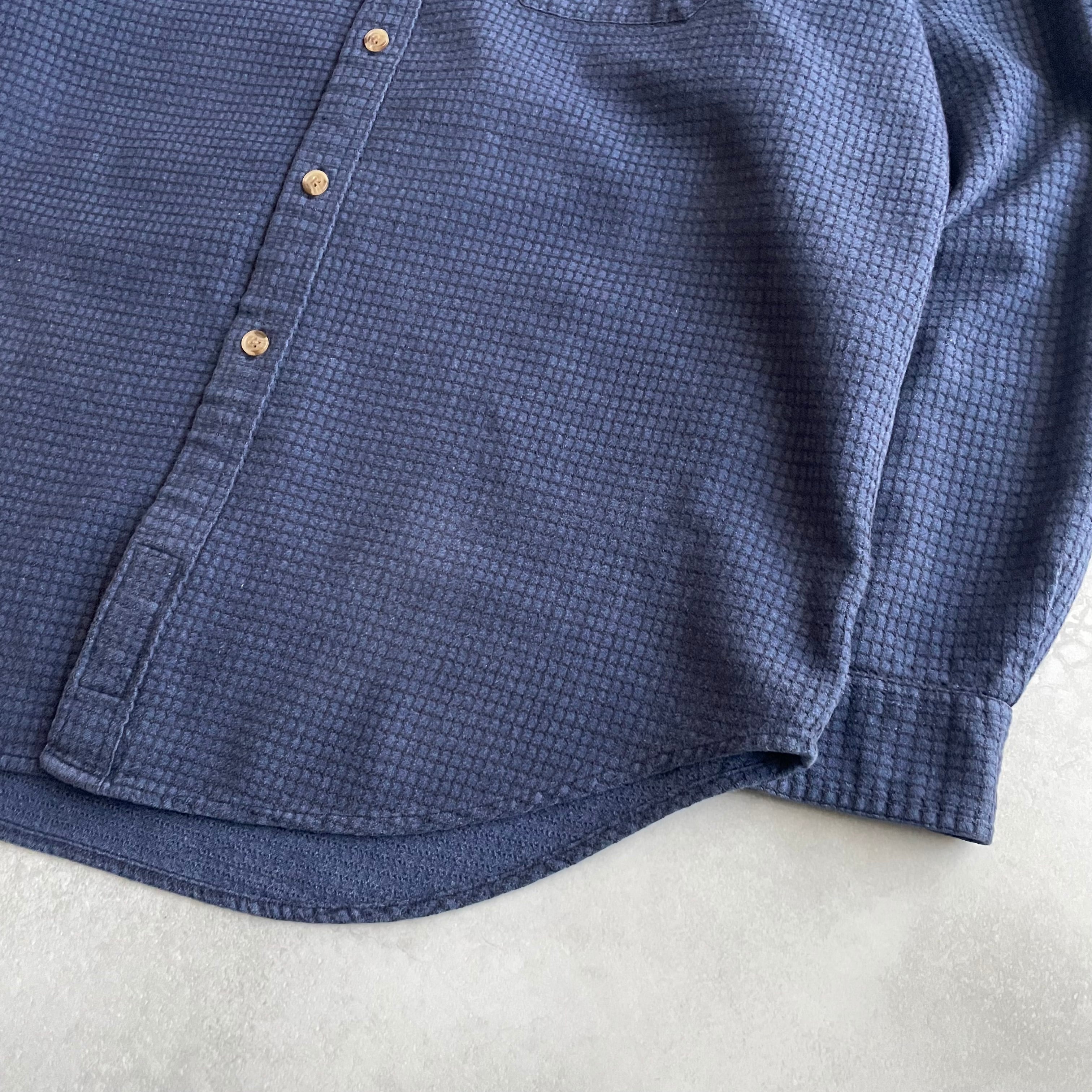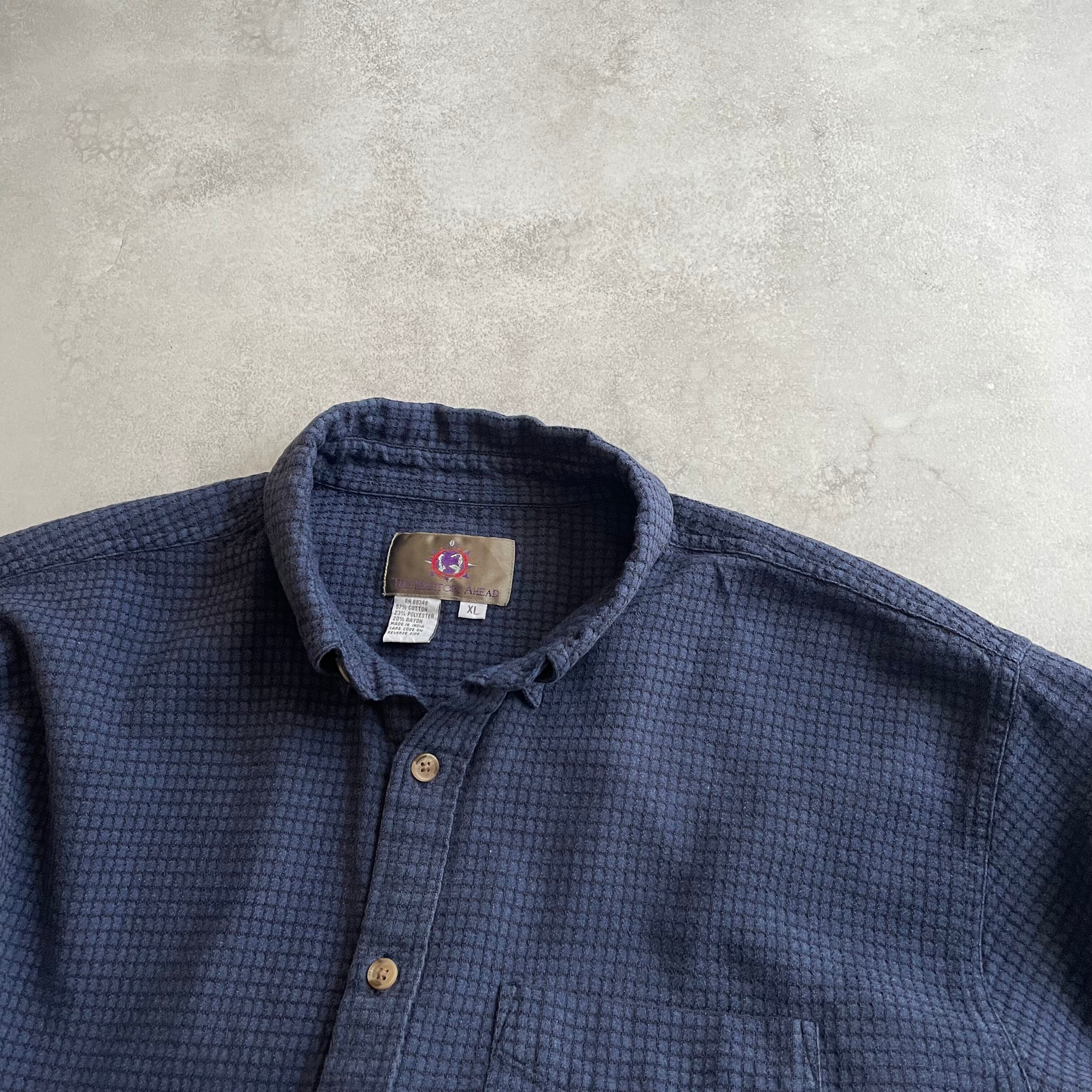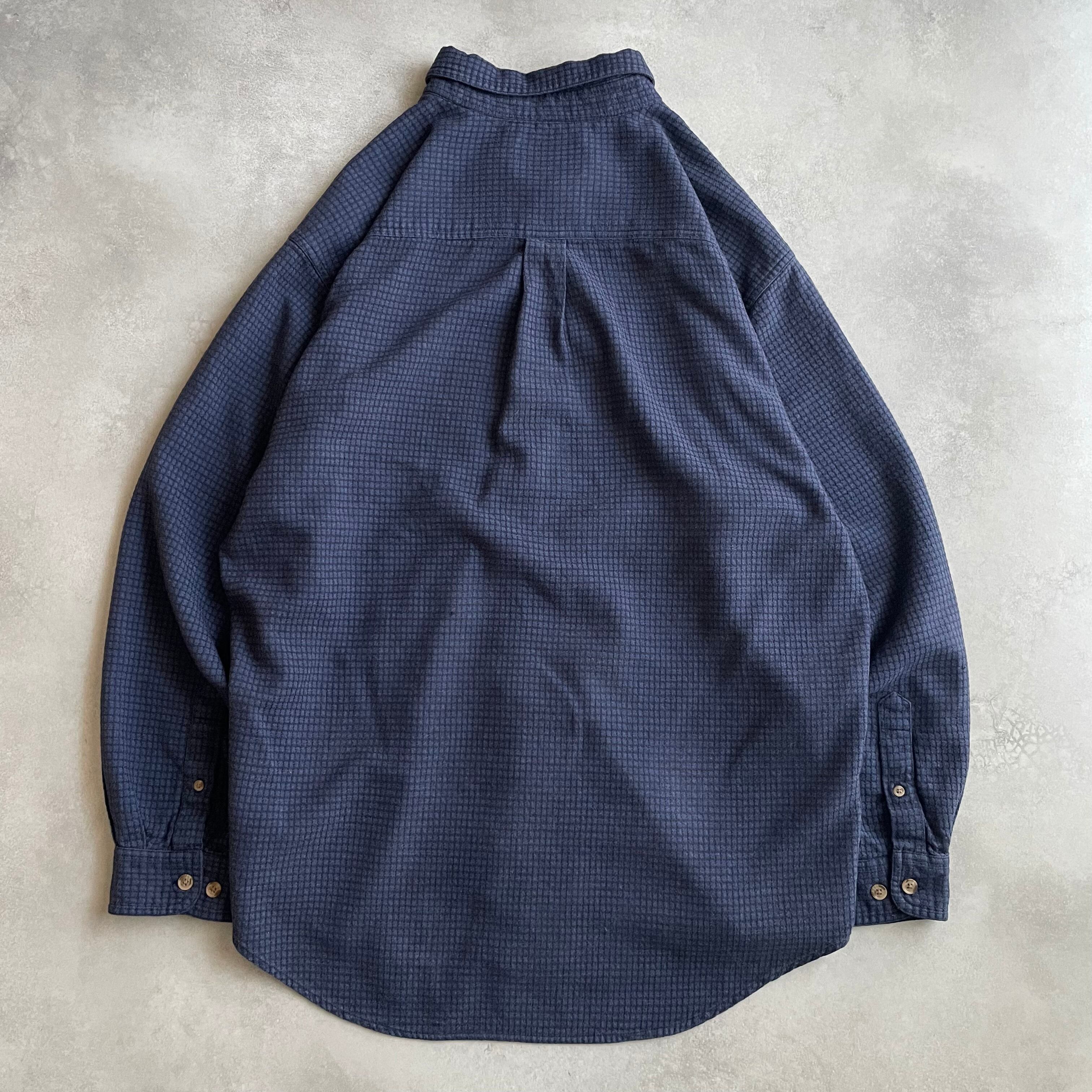 こちらのアイテムは、青と黒の糸で格子状に編まれたチェックシャツ