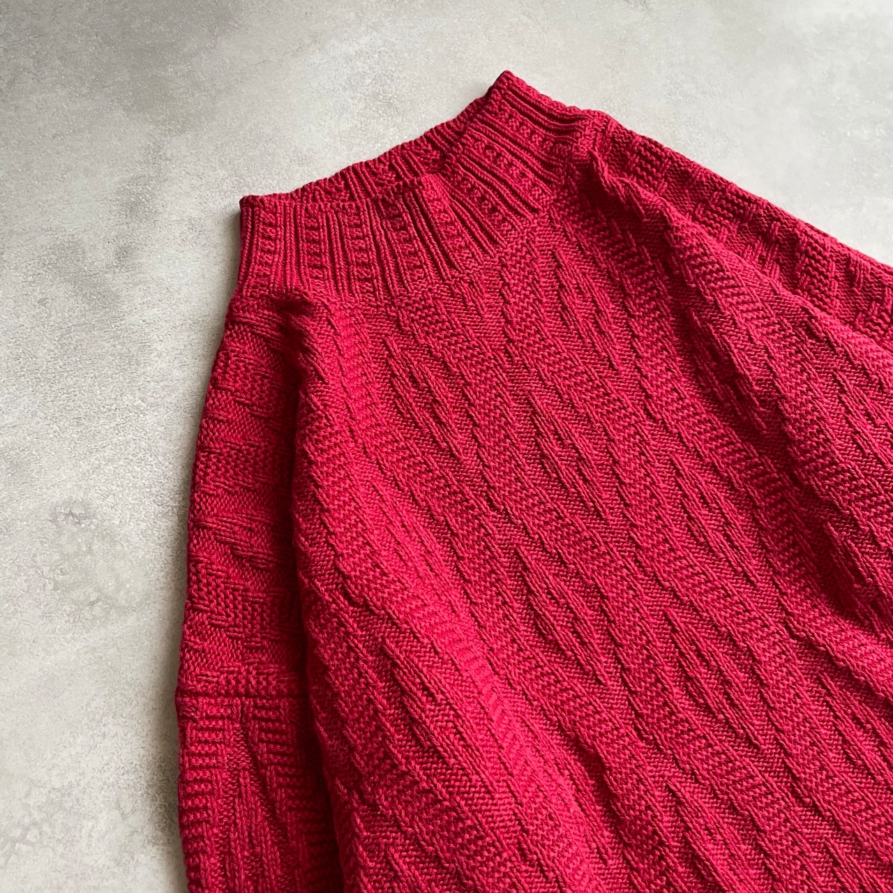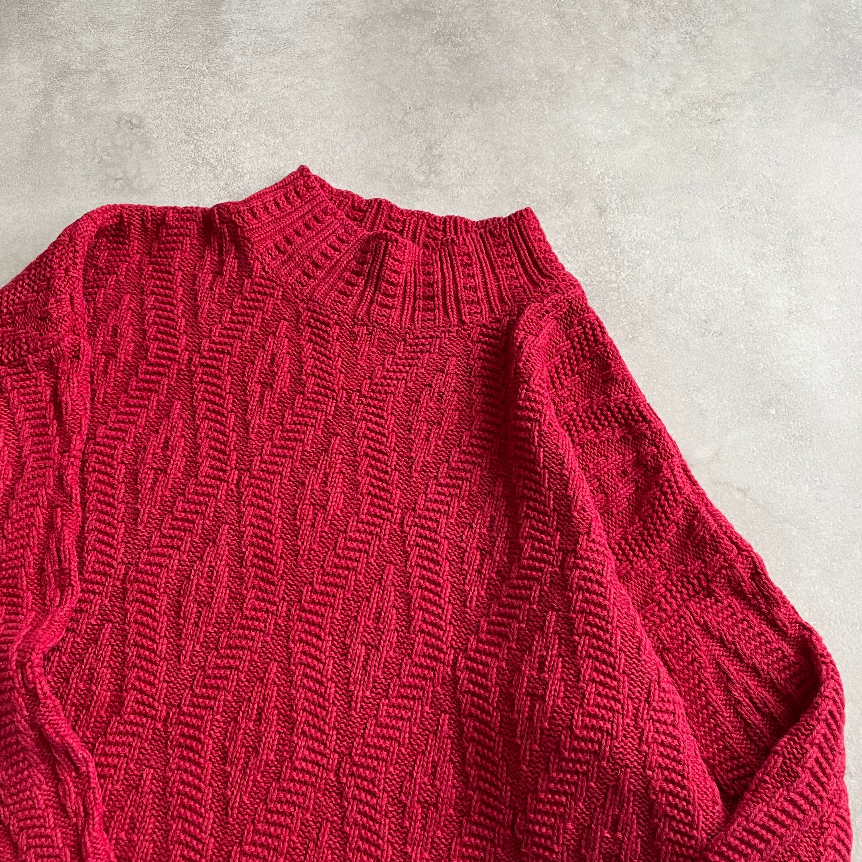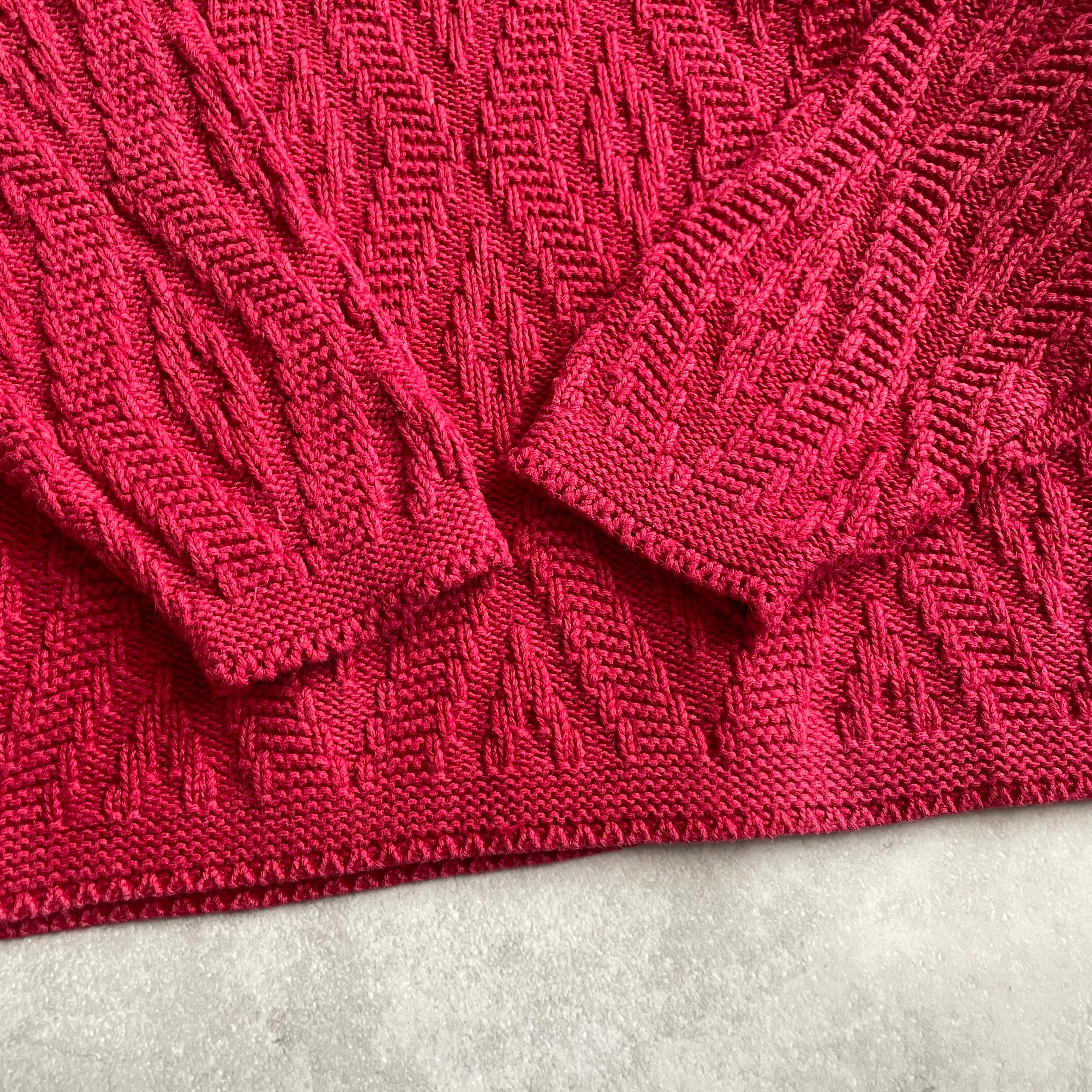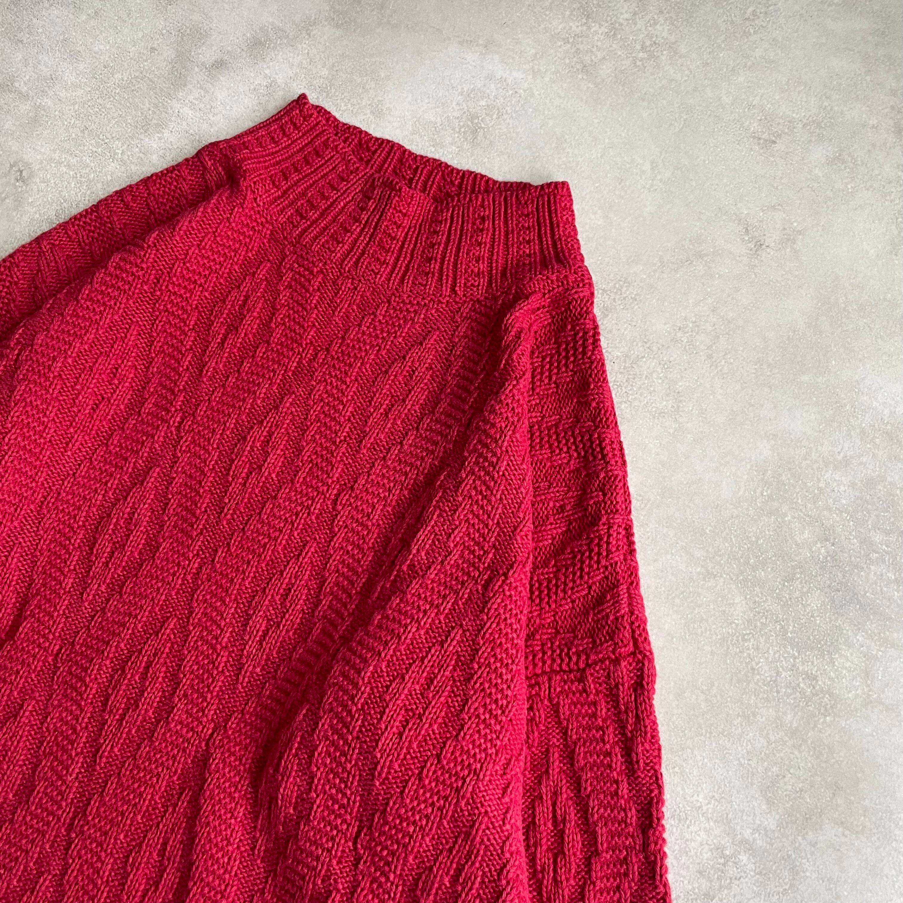 ルビー色のボディにさりげない波打つようなデザインが施されたニット