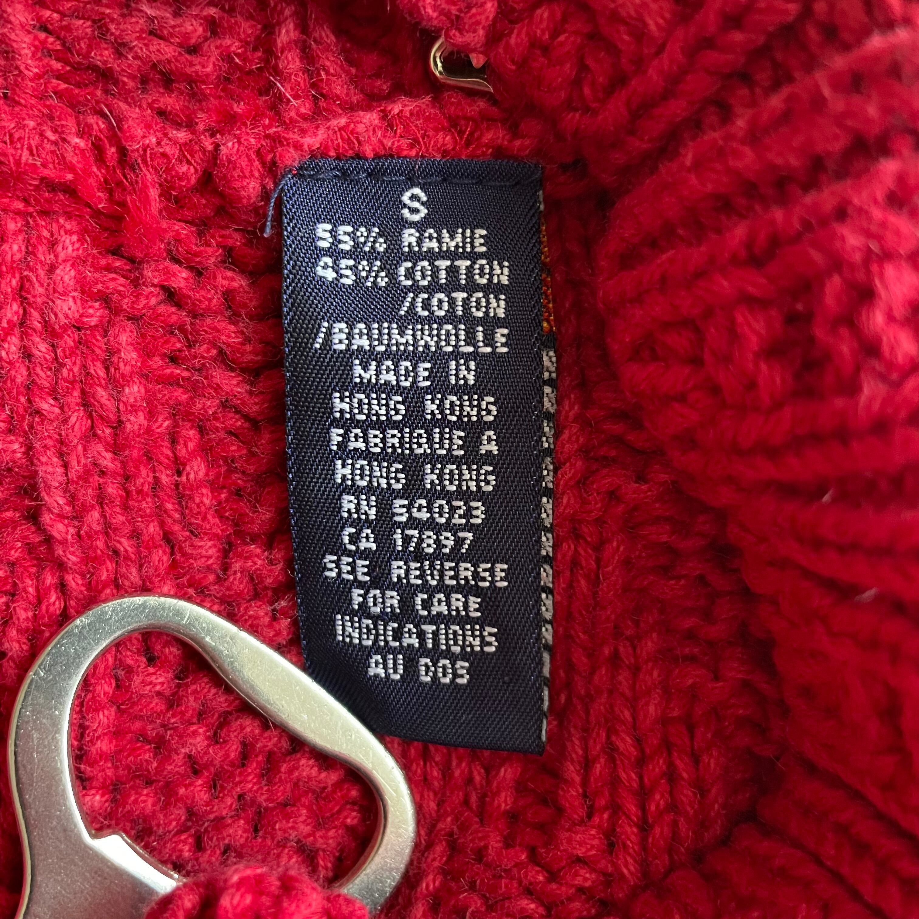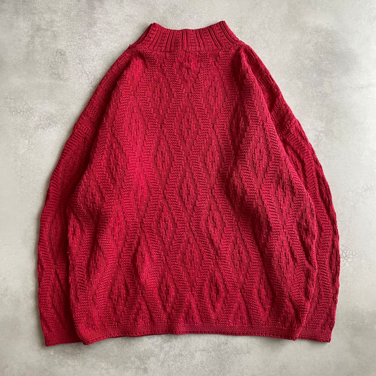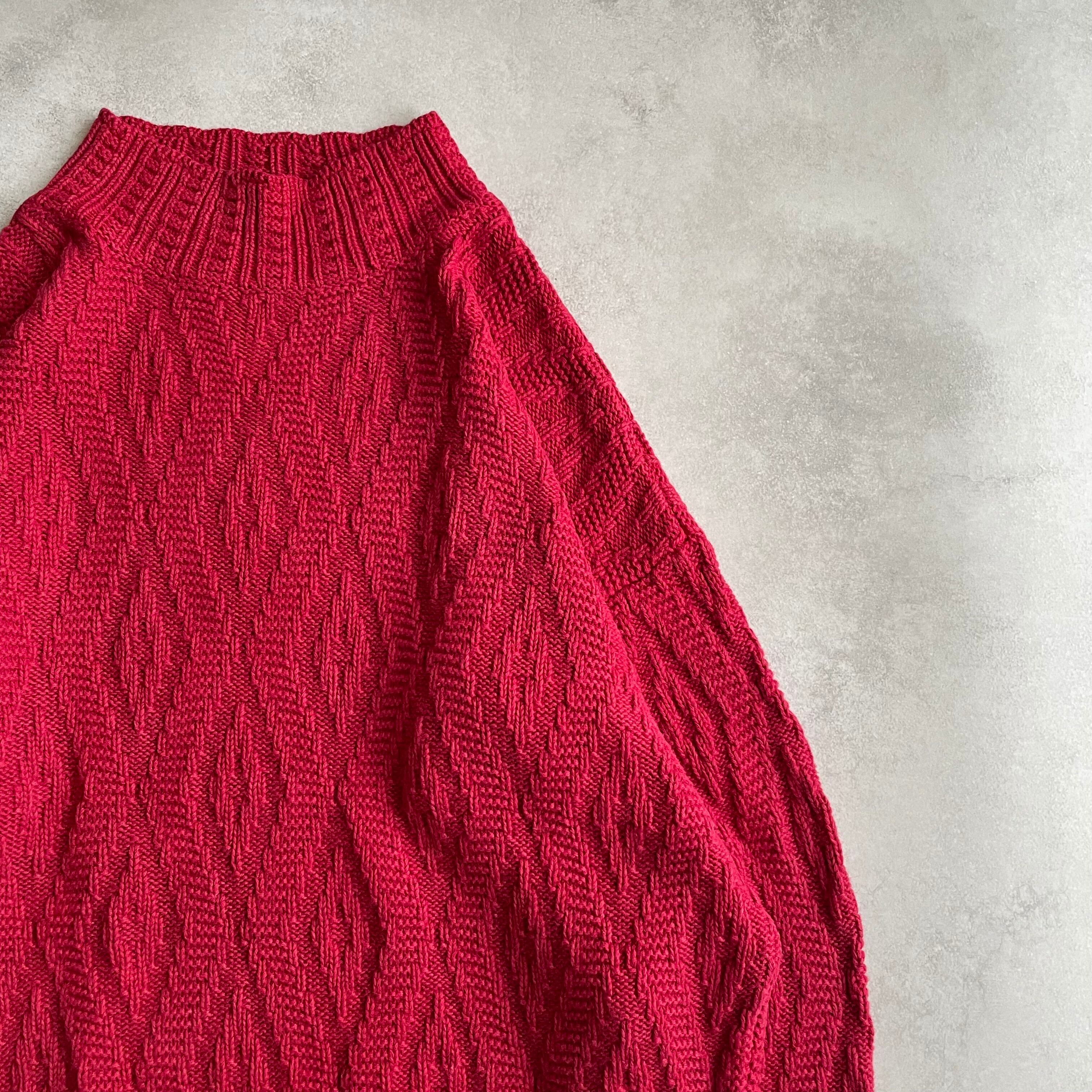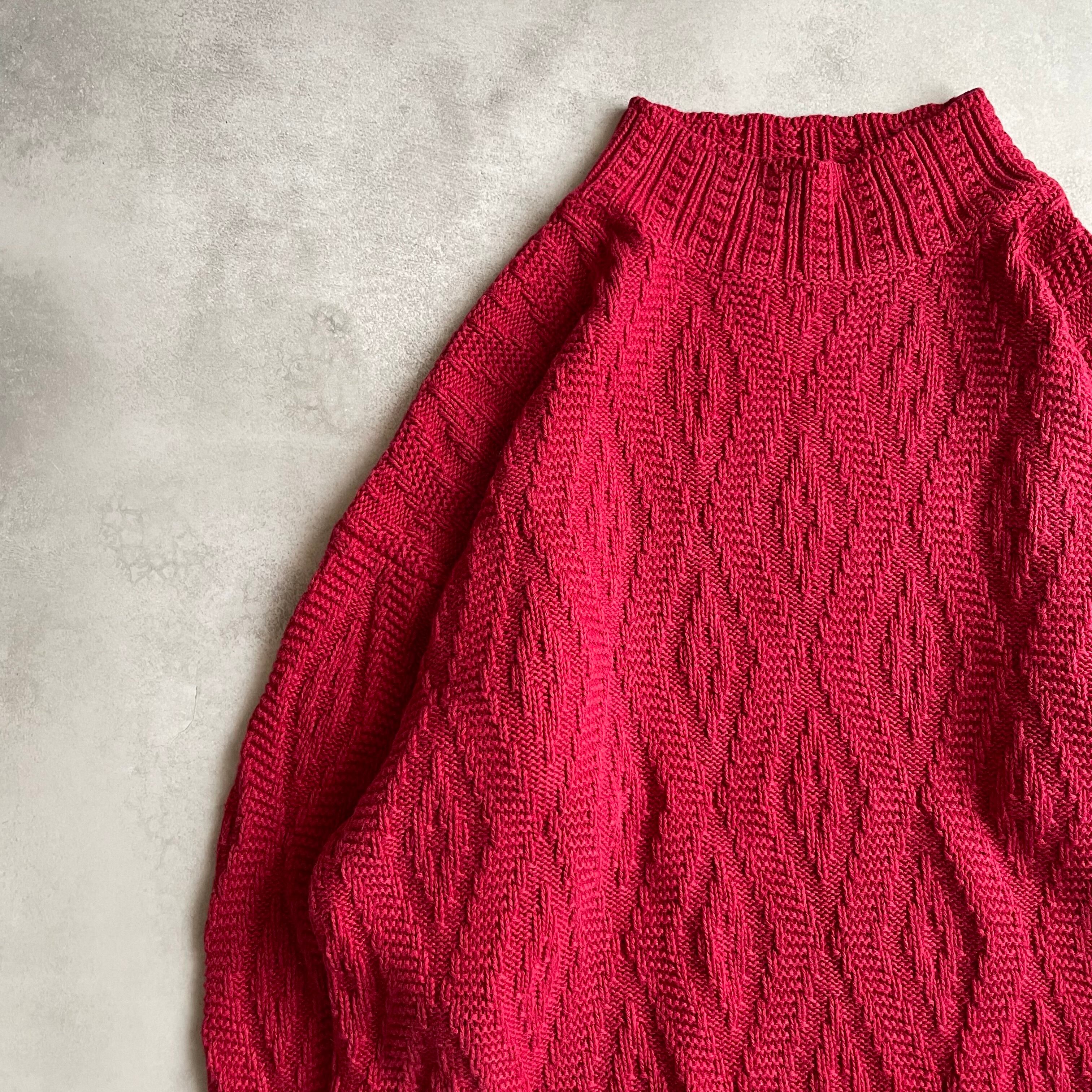 ルビー色のボディにさりげない波打つようなデザインが施されたニット