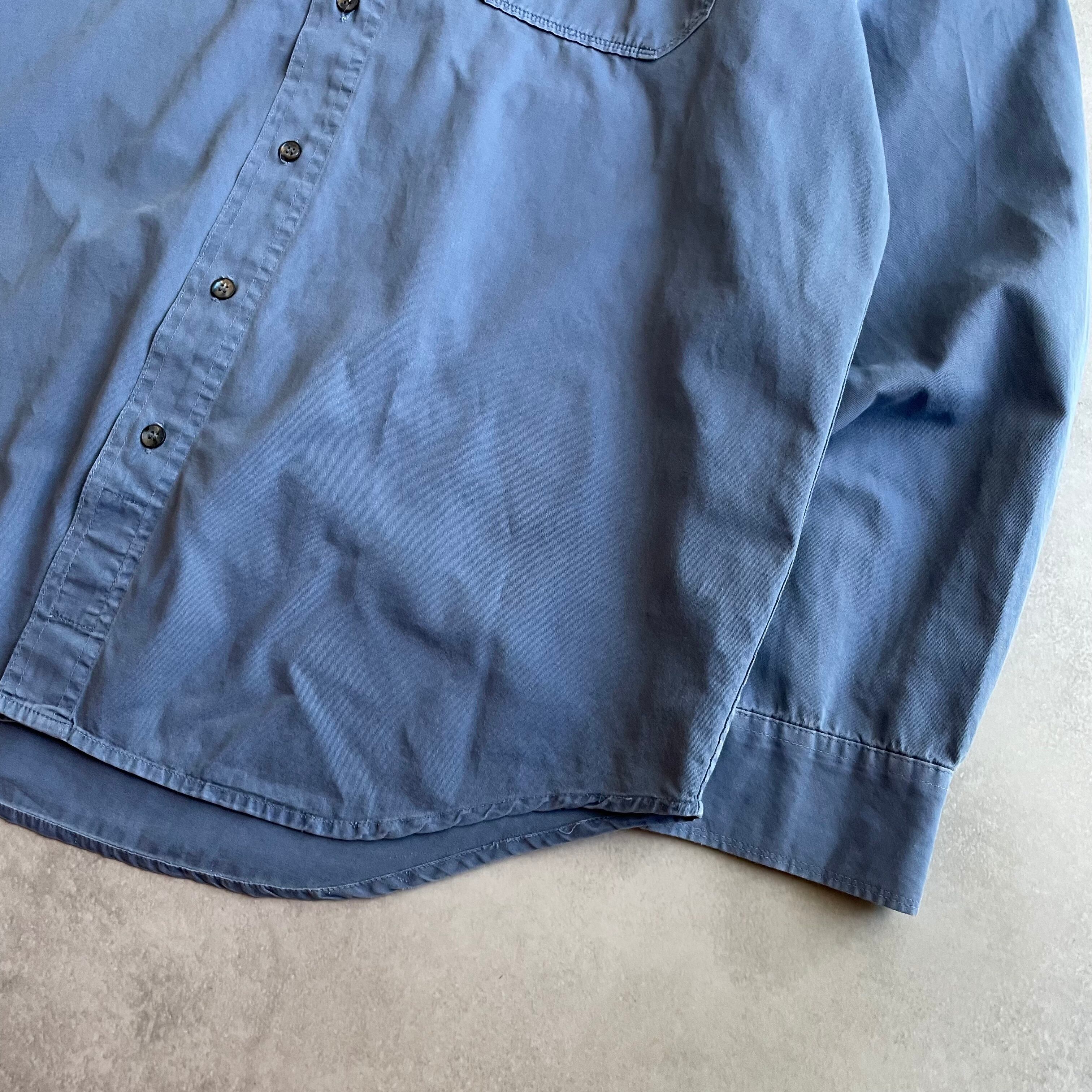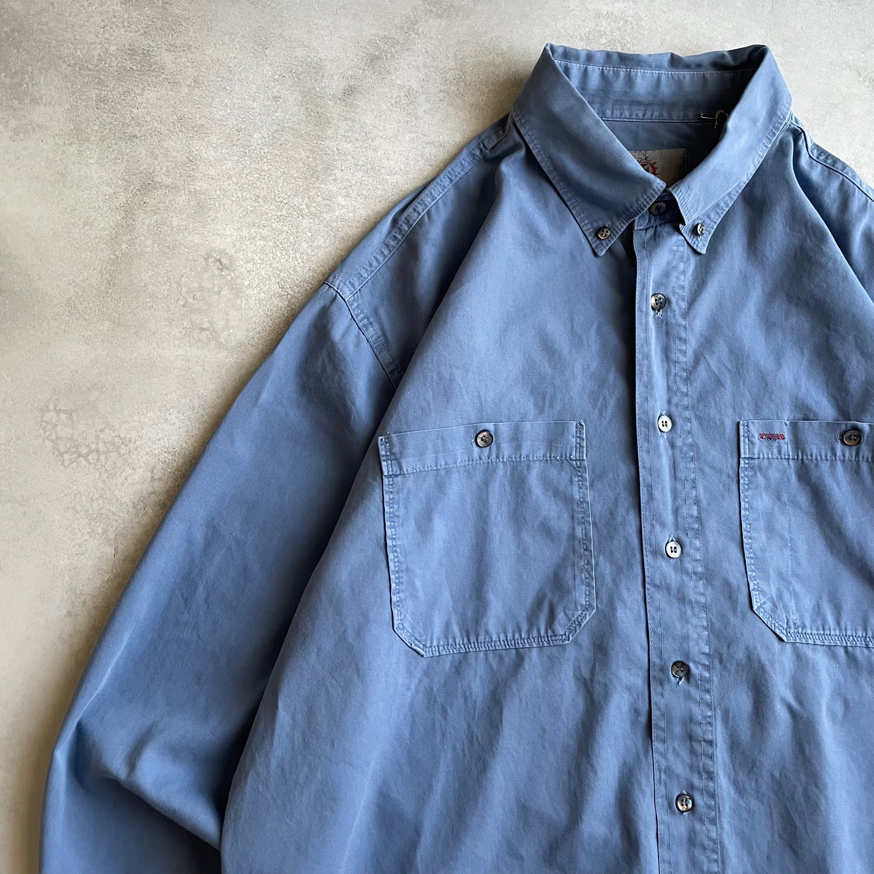 こちらのアイテムは、春らしい淡いサックスブルーカラーのボタンダウンシャツ
