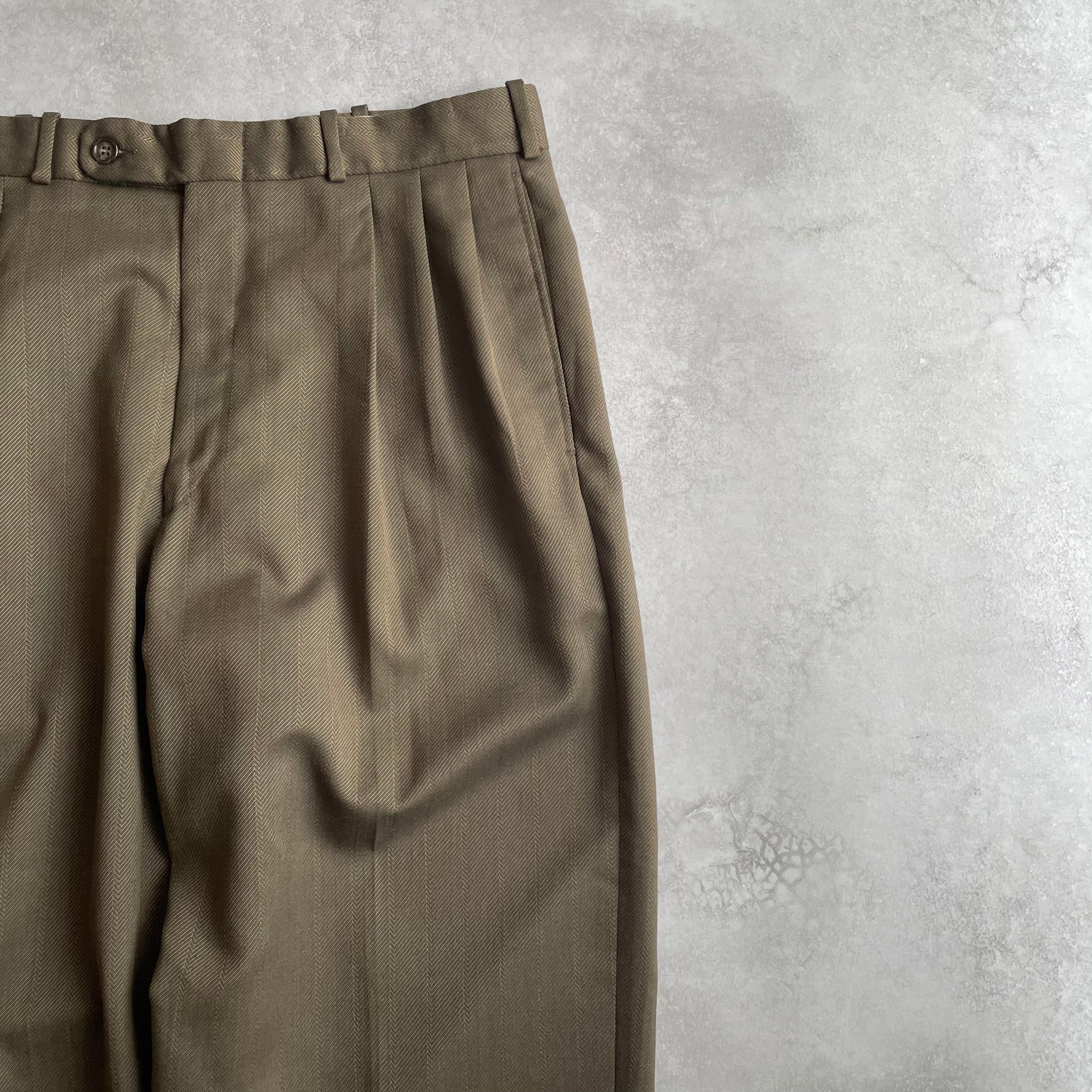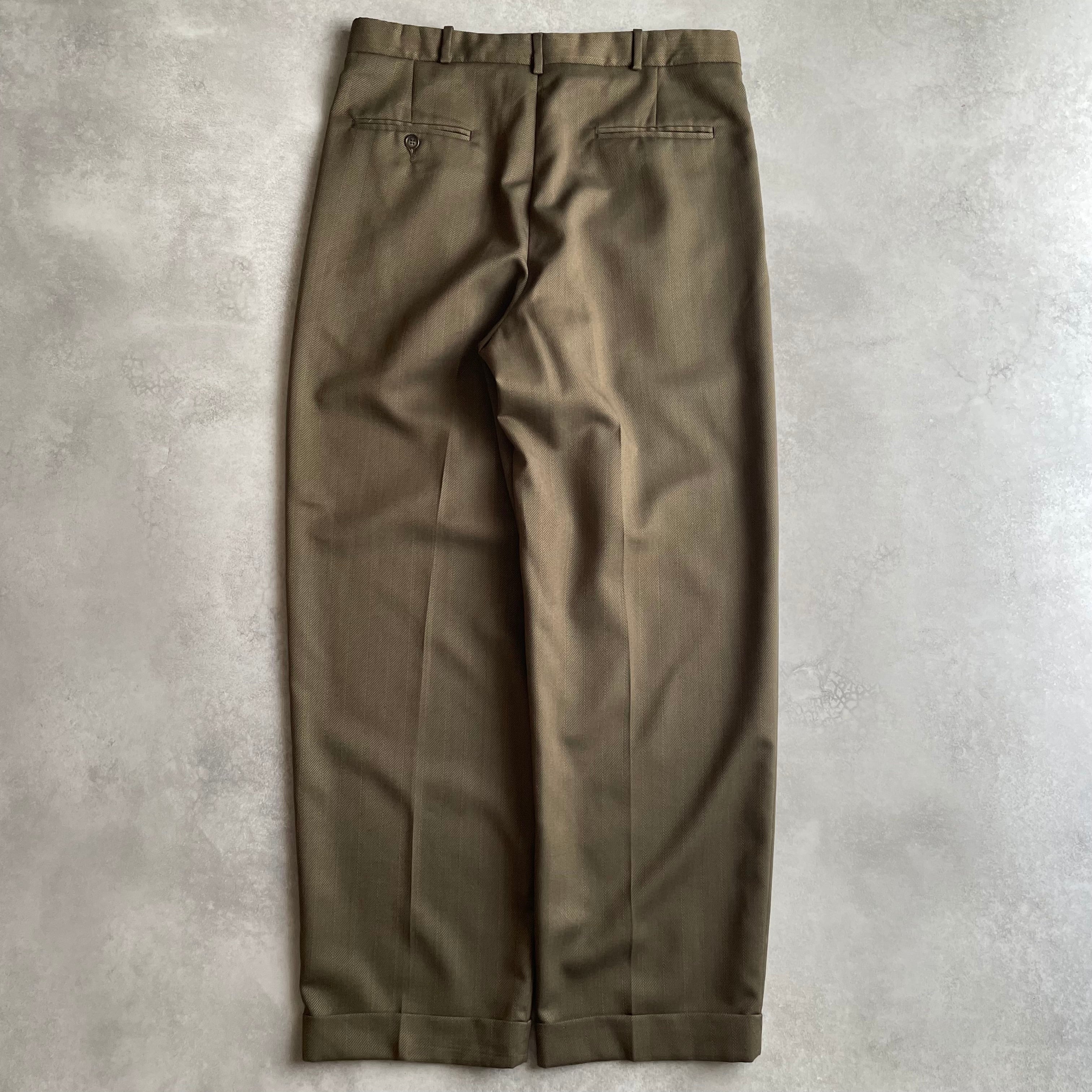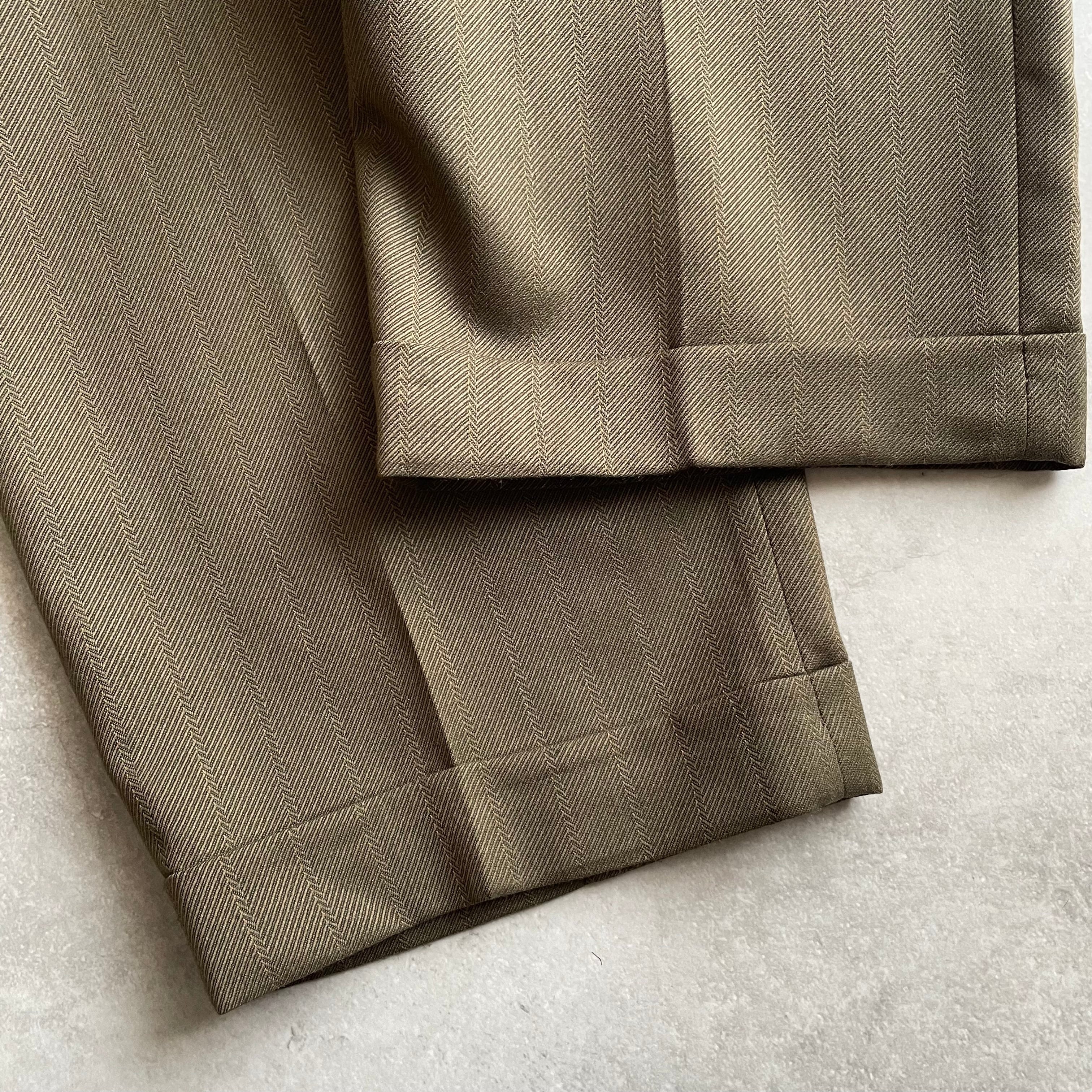 ヘリンボーン調の織り柄が程よいアクセントになっており、シンプルな装いにも使いやすいスラックスかなと思います
