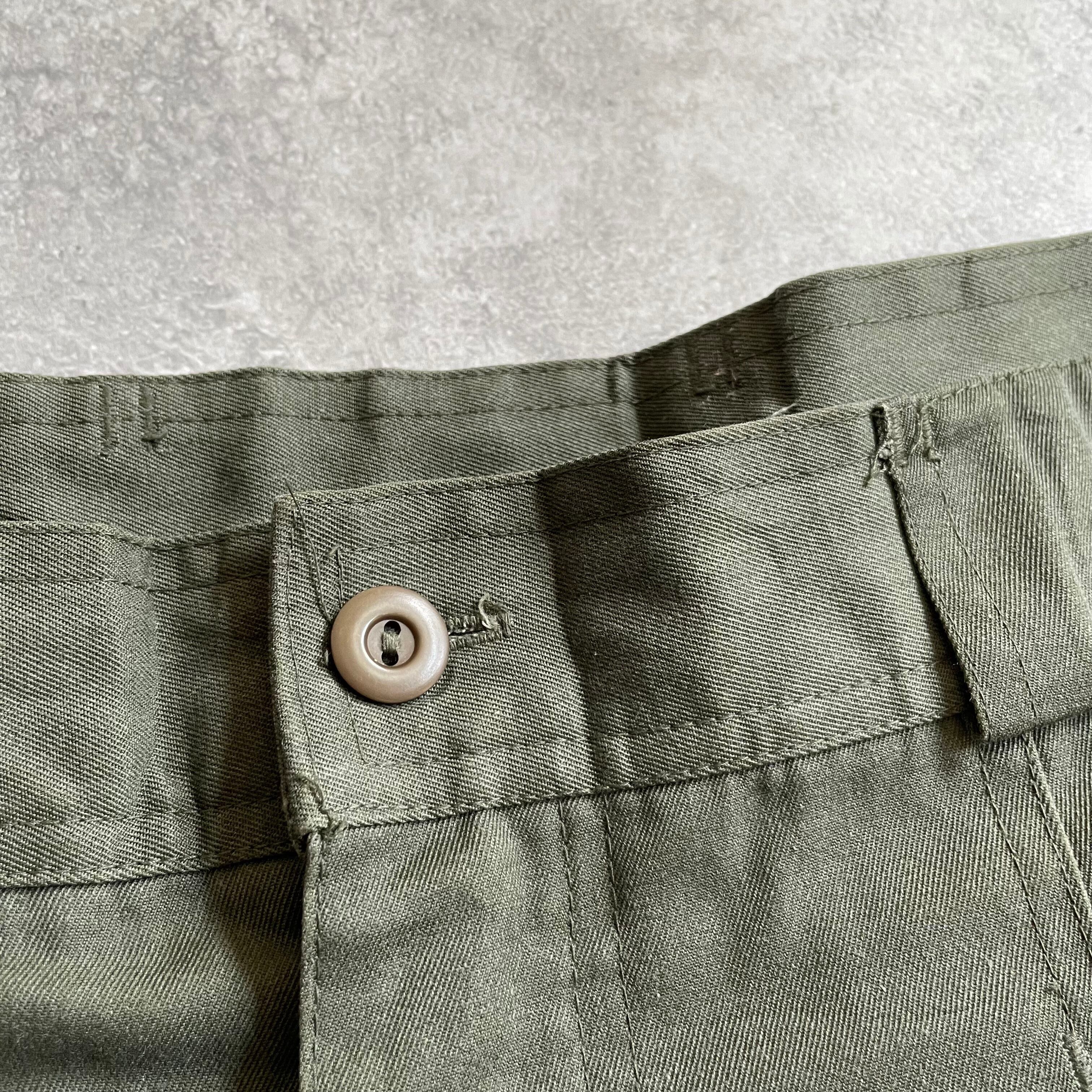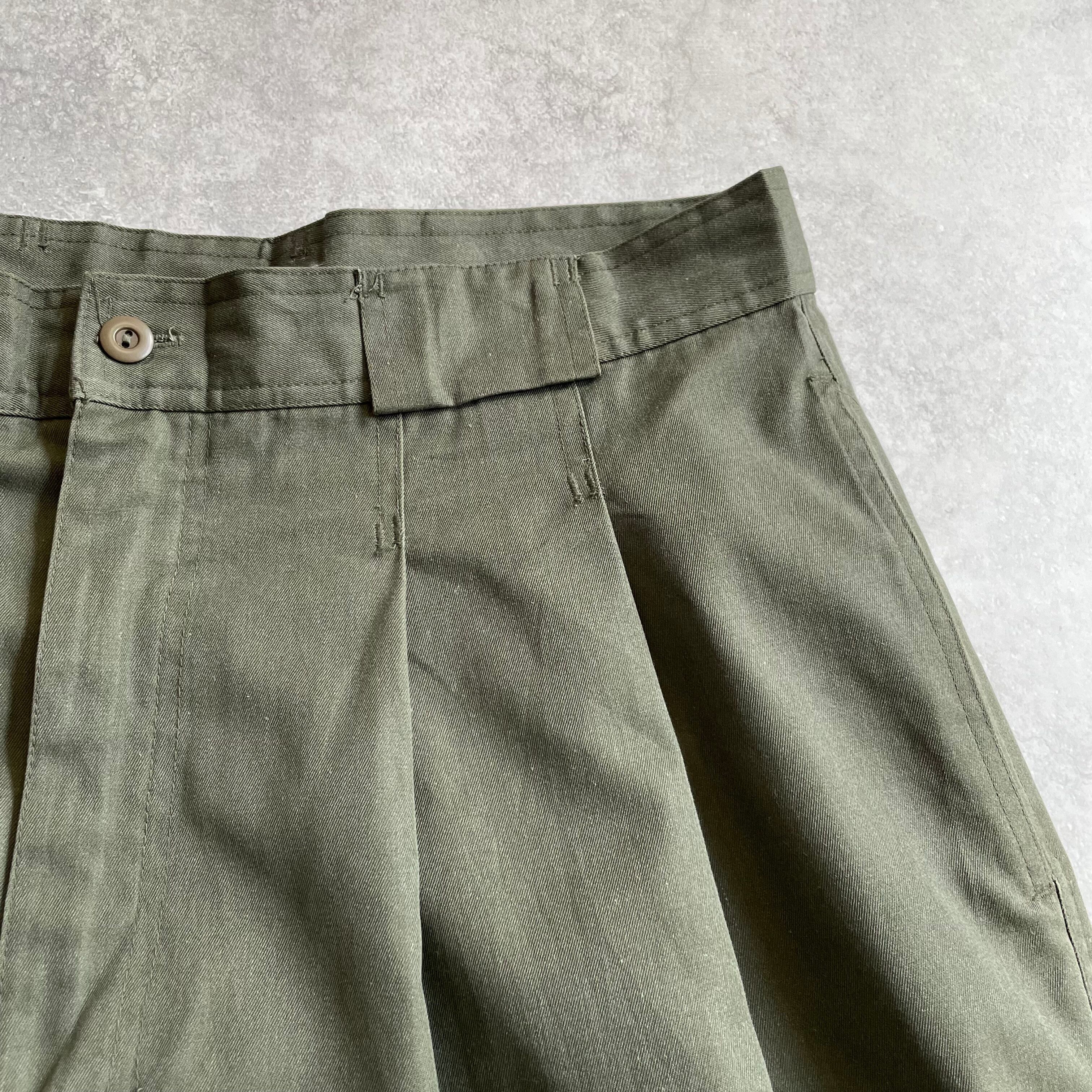 ベルトループの太さやタックの深さ、トップボタン等、ミリタリーの雰囲気を感じるカーキカラーのボトムス