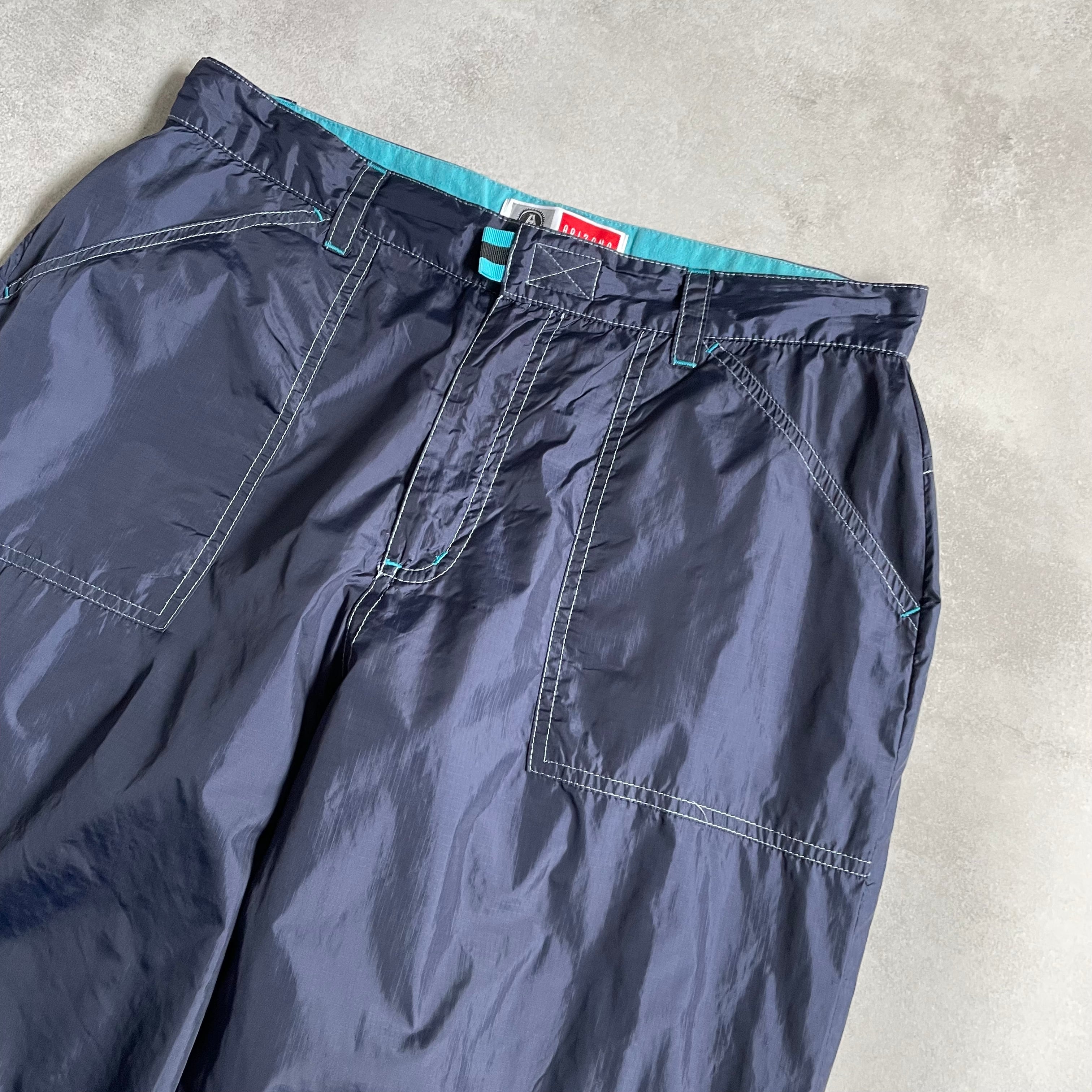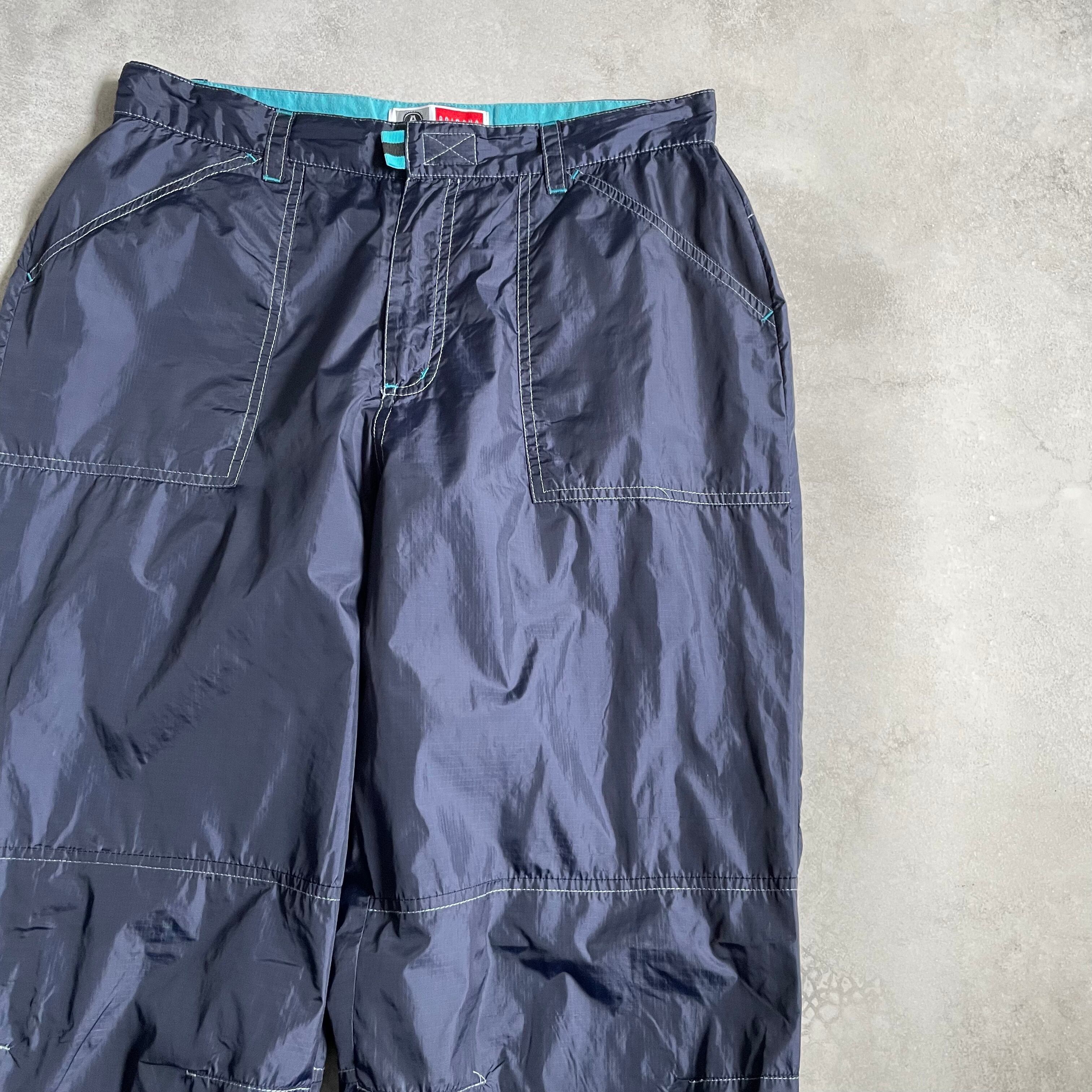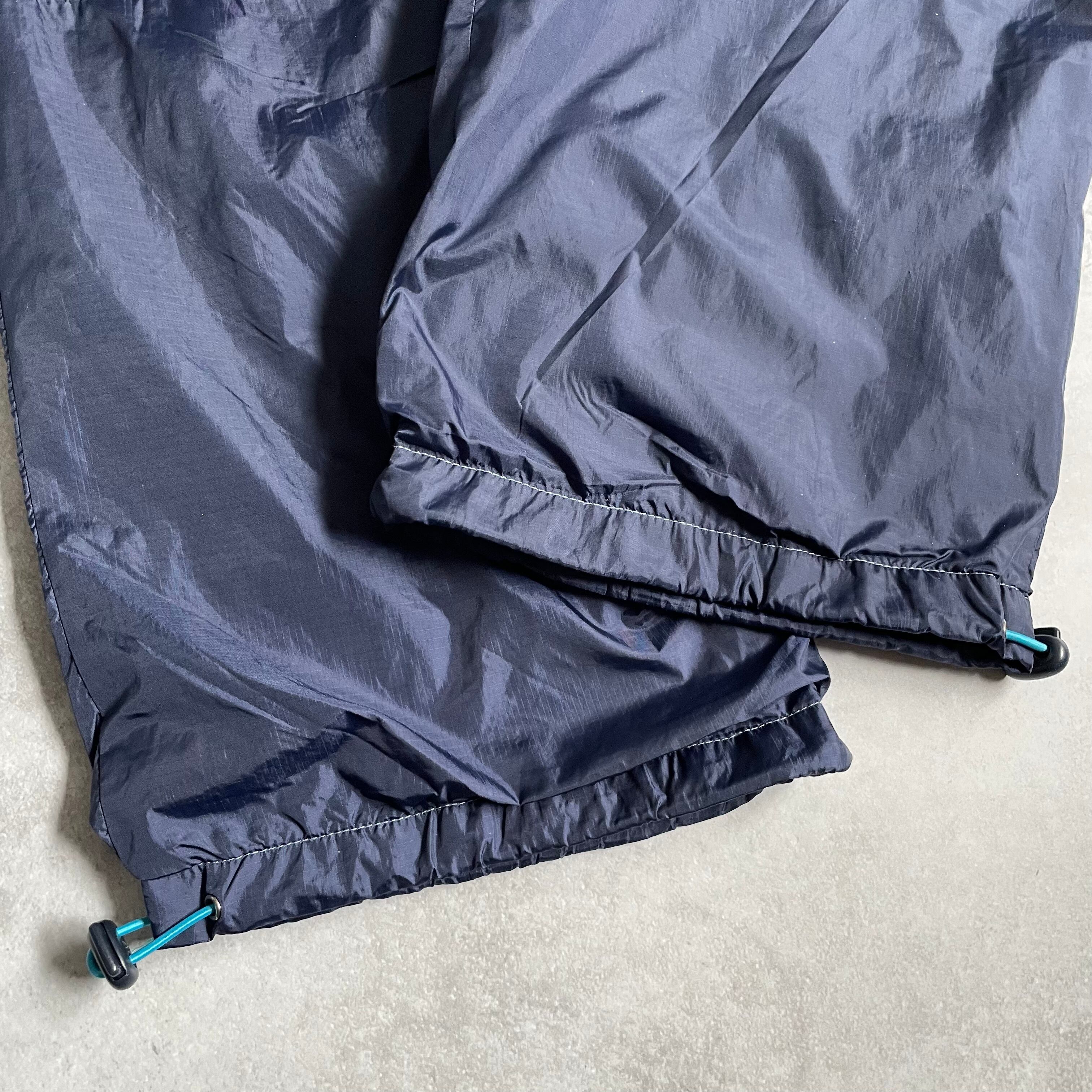 裏地のカラーリングに合わせた裾のドローコードやベルトループの水色のステッチ、ポケットや膝あたりの白色のステッチなど、シンプルながらに気の利いたステッチの入り方がお洒落なナイロンパンツ